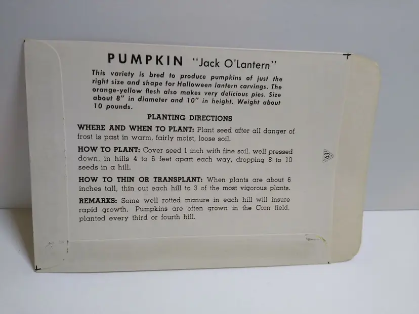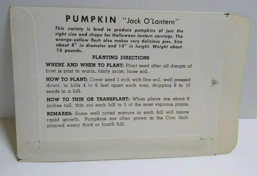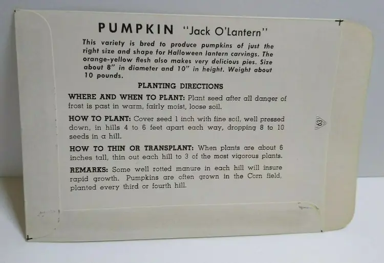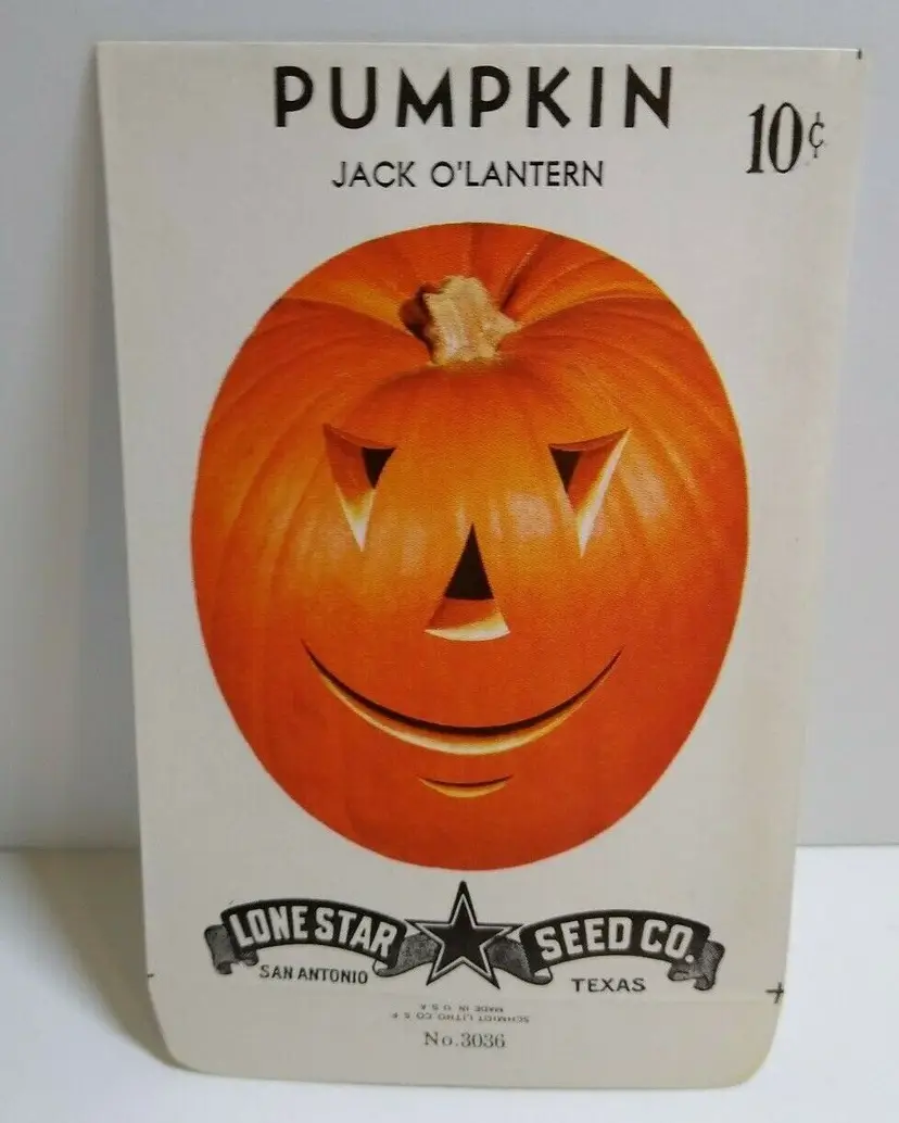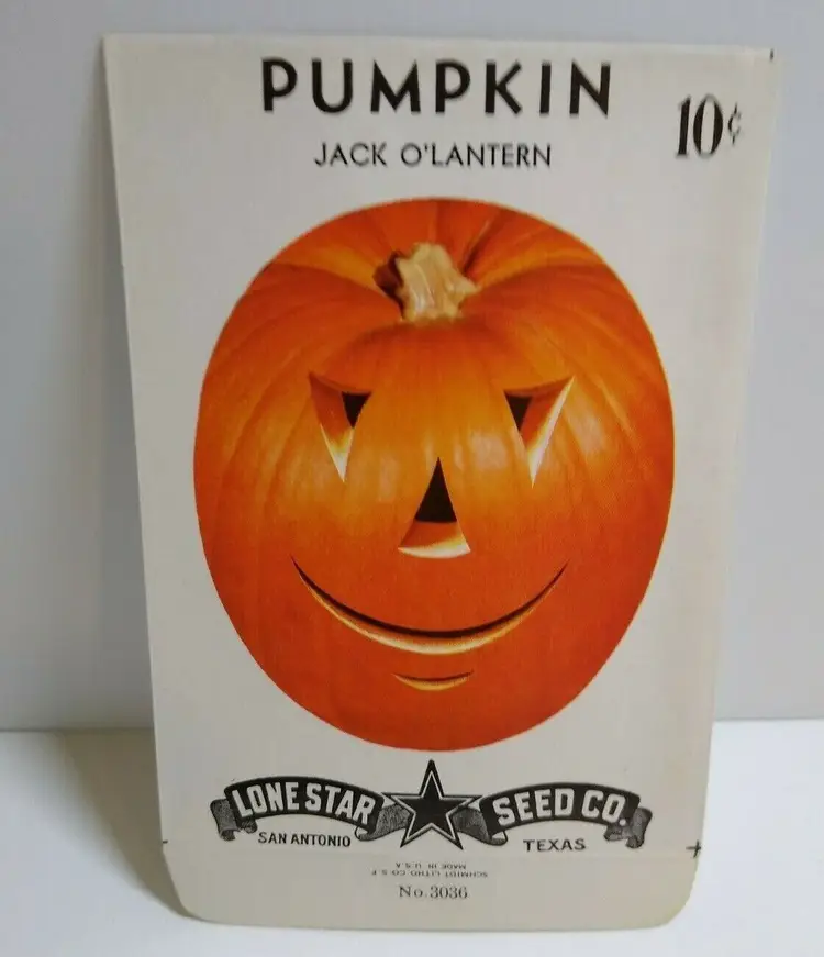 Super cool graphics on this new old stock circa 1950's empty pumpkin seed packet. Made by Lone Star Seed Co. Texas. Size is 5" x 3.25". Perfect Halloween cross over collectible item.