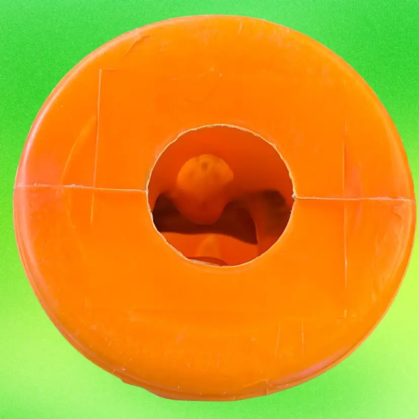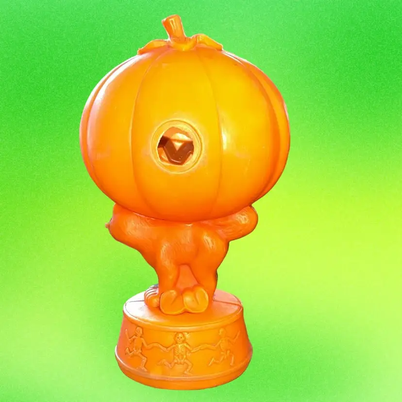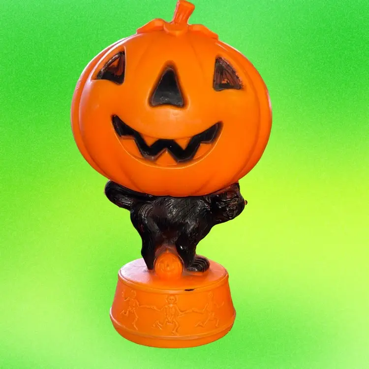 A fun, increasingly hard to find vintage Halloween light up blow-mold. This was made by Enterprise, circa 1968 and features a big, happy JOL sitting on a black cat on a rounded base which is decorated with dancing skeletons. New light kit included. 14”H x 8”W x 6”deep. Some paint wear to cat and the pumpkins eyes. Great condition otherwise.