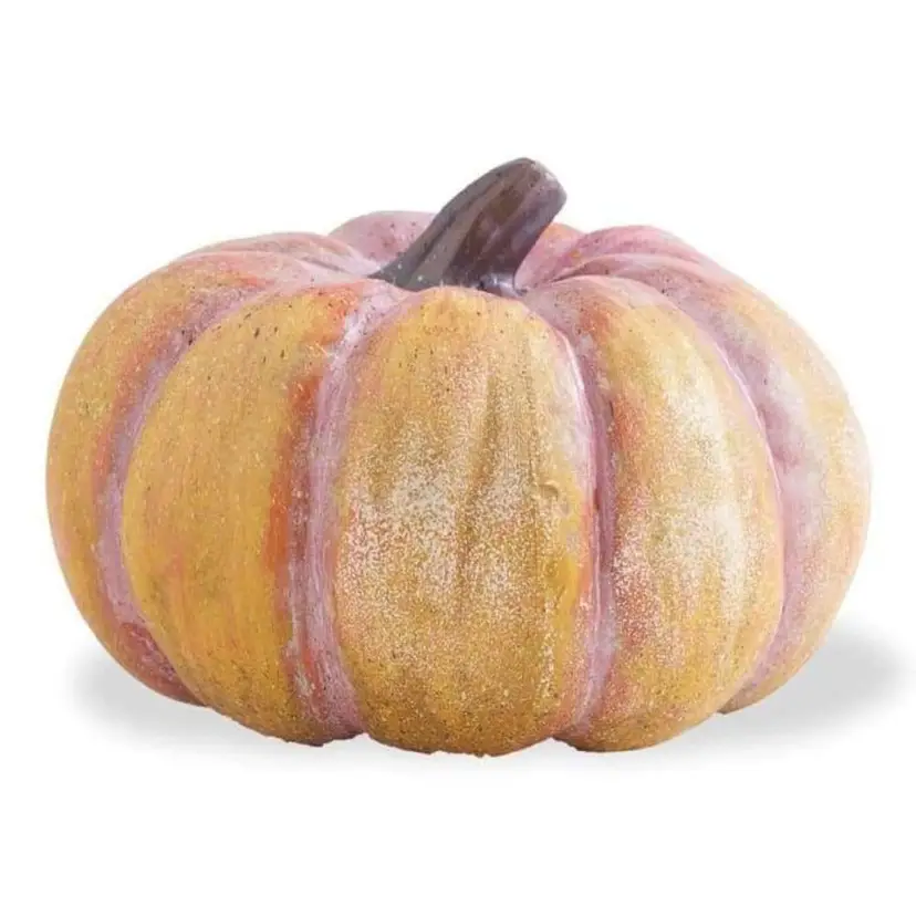Halloween Orange Pumpkin 6 Inch High made of resin. Halloween, Thanksgiving, even Christmas, this rustic orange resin pumpkin is a great foundation to an amazing holiday display. It has a smooth yet aged surface and curly, stem that makes it a great backdrop for a figure vignette, a cornucopia, or even a party snack table centerpiece, the uses are endless! 7-7-5 shp1435