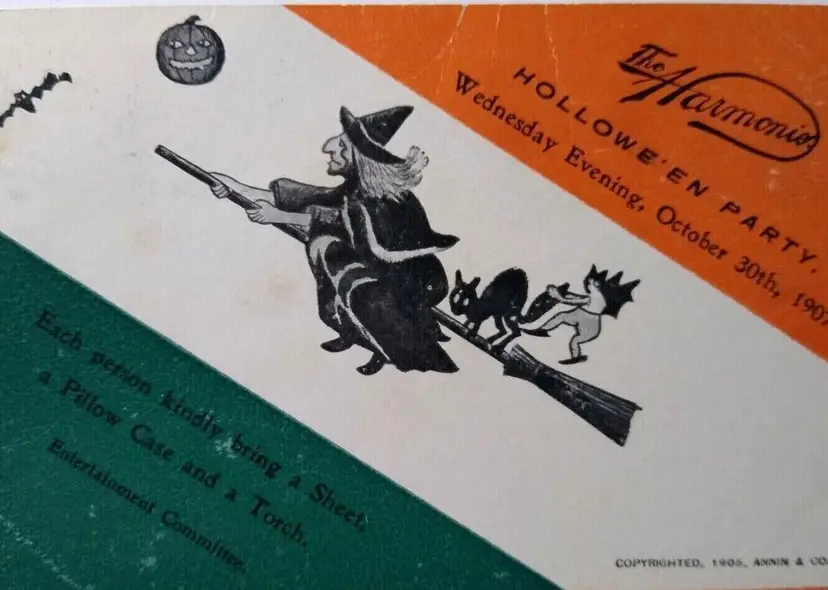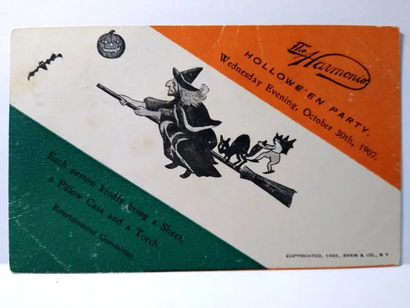 Size: Standard (5.5 x 3.5 in) Custom Bundle: No Personalize: Yes Type: Printed (Lithograph) Personalization Instructions: Has custom text for Halloween party event. Year Manufactured: 1905 Number of Items in Set: 1 Signed: No Original/Licensed Reprint: Original Occasion: Halloween Time Period Manufactured: 1900-1919 Unit of Sale: Single Unit Era: Undivided Back (1901-1907) Artist: Unknown Country/Region of Manufacture: United States Material: Paper Theme: Witches, Goblin, Broom, JOL, Pumpkin, Bat, Art, Fantasy, Greetings, Holiday Features: Undivided Back Subject: Halloween Party Postage Condition: Posted Brand/Publisher: Annin & Co. Franchise: Annin Antique: Halloween Vintage: Halloween Postcard Original: Postcard