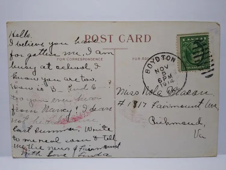 Posted with 1914 cancel. Original antique vintage post card. Has corner creases, spotting, and age wear. Stock #43.