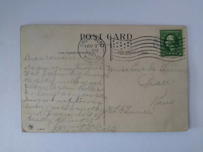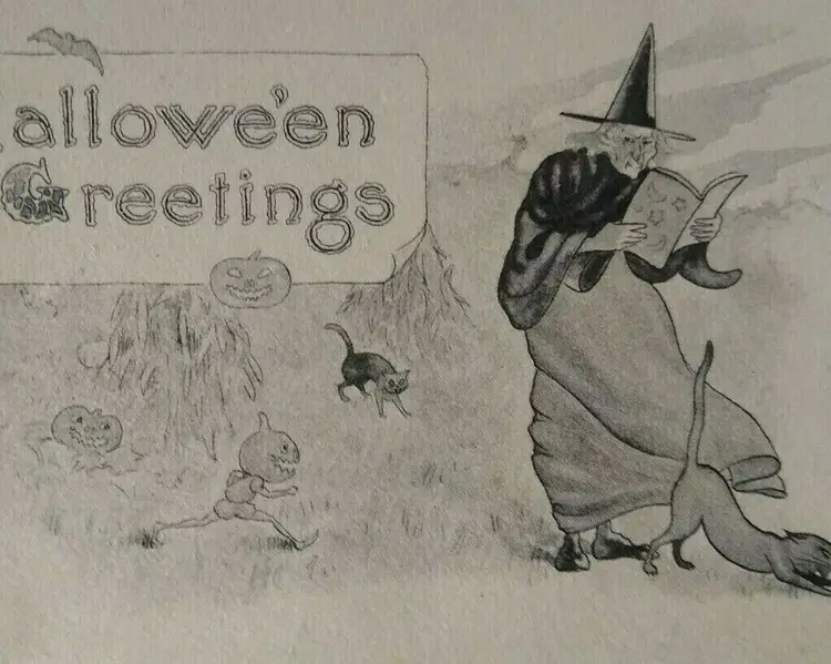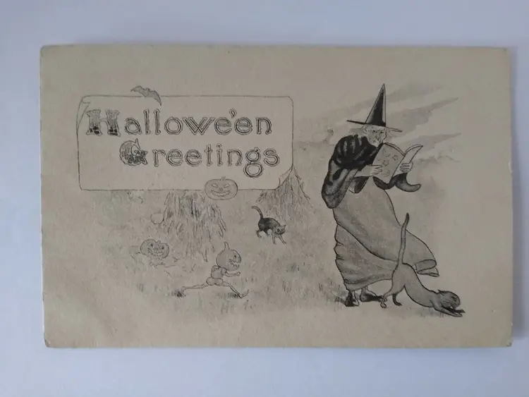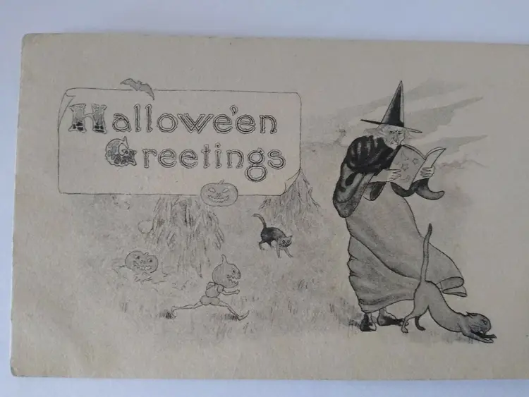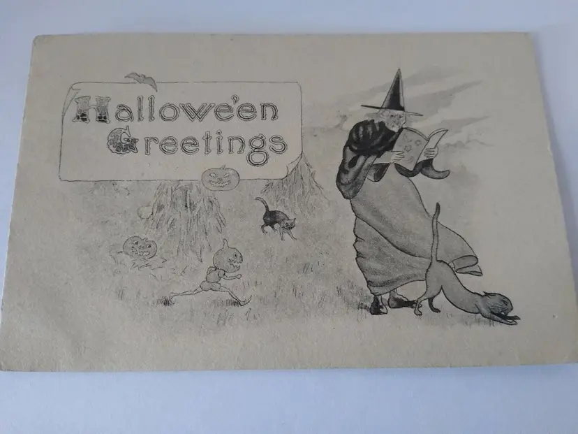 Unit of Sale: Single Unit Artist: Unknown Number of Items in Set: 1 Antique: Halloween Occasion: Halloween Signed: No Material: Paper Year Manufactured: 1913 Original/Licensed Reprint: Original Brand/Publisher: Barton & Spooner Subject: Fantasy Vintage: Halloween Postcard Personalize: No Type: Printed (Lithograph) Era: Pre-War (Pre-1914) Theme: Black Cat, Fantasy, Goblins, Hay Stacks, Witch Features: Divided Back, Embossed Time Period Manufactured: 1900-1919 Country/Region of Manufacture: United States Postage Condition: Yes Original: Postcard