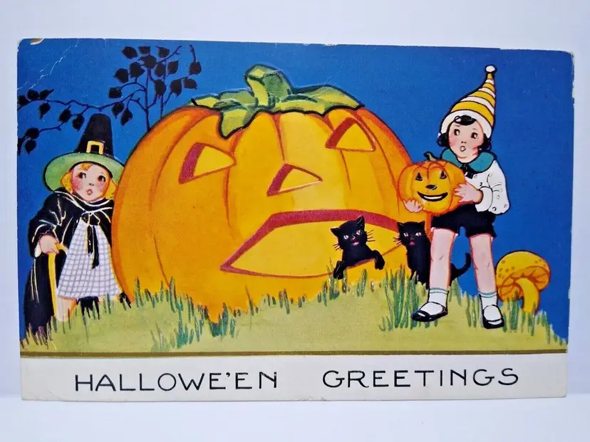 Size: Standard (5.5 x 3.5 in) Custom Bundle: No Personalize: No Type: Printed (Lithograph) Year Manufactured: 1926 Number of Items in Set: 1 Signed: No Original/Licensed Reprint: Original Occasion: Halloween Time Period Manufactured: 1900-1919 Unit of Sale: Single Unit Era: Pre-War (Pre-1914) Artist: Unknown Country/Region of Manufacture: United States Material: Paper Theme: Pumpkin, Animals, Art, Fantasy, Greetings, Holiday, Children & Infants, Mushroom, JOL, Pilgrim Features: Divided Back, Embossed Subject: Fantasy Postage Condition: Posted Brand/Publisher: Whitney Franchise: Whitney Antique: Halloween Vintage: Halloween Postcard Original: Postcard