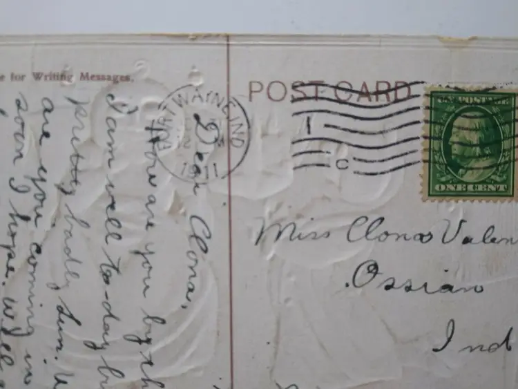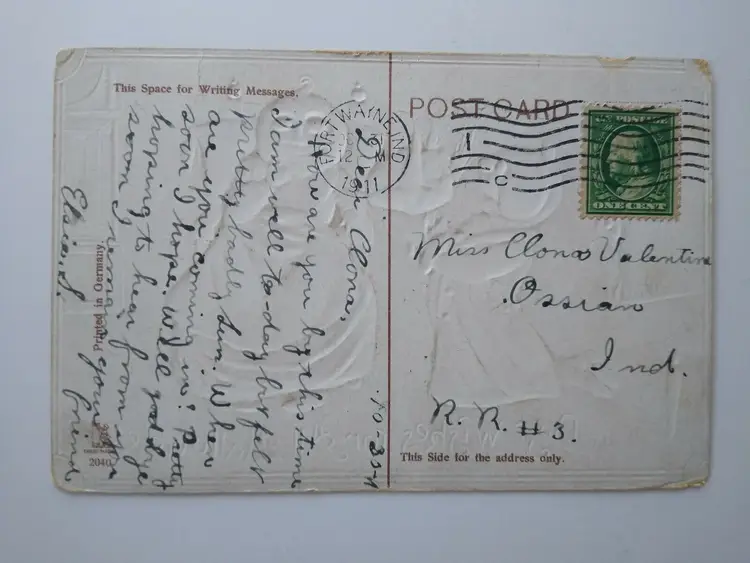 Antique vintage original embossed Halloween postcard. Has corner creases and age wear. Posted with circa 1911 Fort Wayne, Indiana cancel and stamp. Printed in Germany and series 2040 on back. Stock #538.