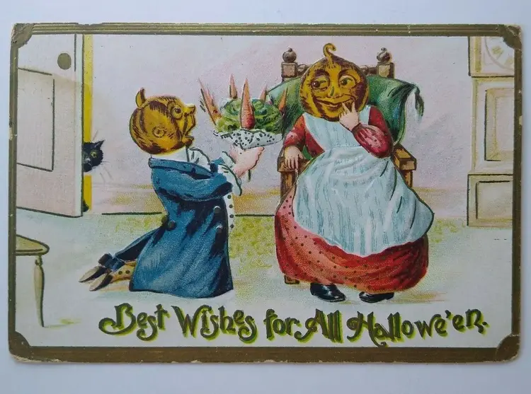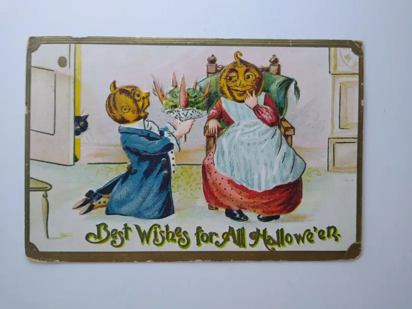 Size: Standard (5.5 x 3.5 in) Country/Region of Manufacture: Unknown Custom Bundle: No Material: Paper Theme: Art, Fantasy, Greetings, Holiday Type: Printed (Lithograph) Features: Divided Back, Embossed Subject: Anthropomorphic Number of Items in Set: 1 Postage Condition: Yes Original/Licensed Reprint: Original Occasion: Halloween Time Period Manufactured: 1900-1919 Unit of Sale: Single Unit Era: Pre-War (Pre-1914) Brand/Publisher: Gottschalk Artist: Unknown Year Manufactured: 1911 Antique: Halloween Vintage: Halloween Postcard Original: Postcard