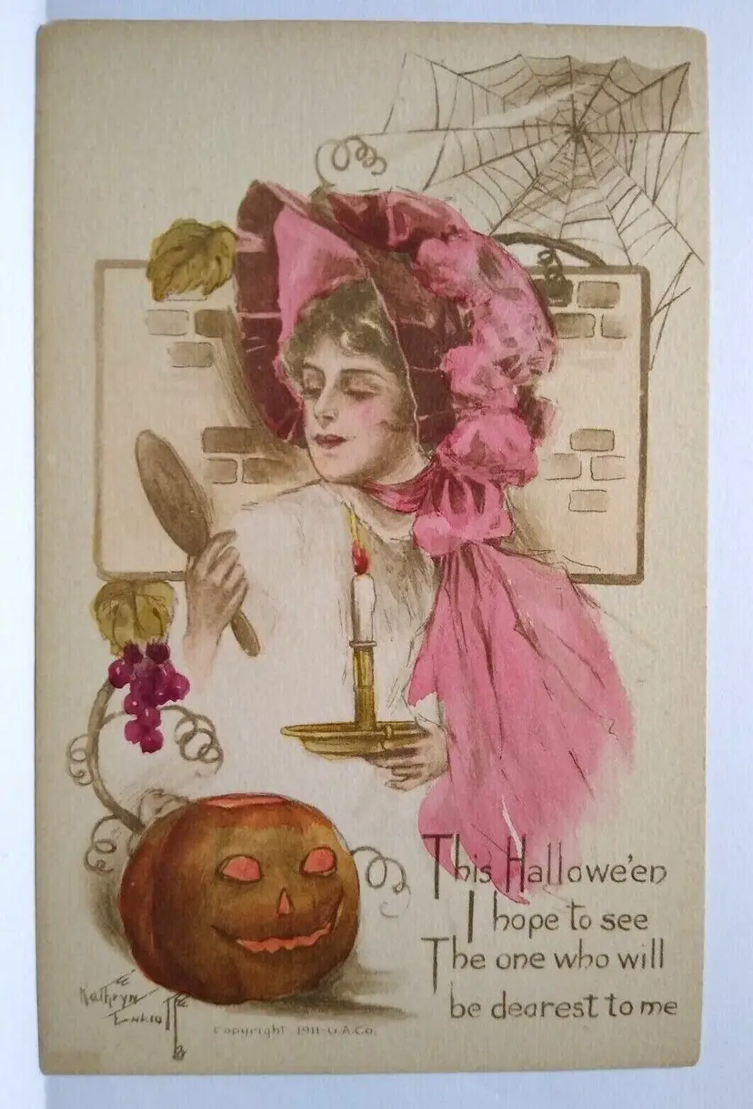 Size: Standard (5.5 x 3.5 in) Artist: Kathryn Elliott Country/Region of Manufacture: United States Custom Bundle: No Material: Paper Theme: JOL, Pumpkin, Mirror, Artist Signed, Hand Tinted, Art, Fantasy, Greetings, Holiday, People Personalize: No Type: Printed (Lithograph) Features: Divided Back, Hand Colored Print Year Manufactured: 1911 Subject: Victorian Number of Items in Set: 1 Signed: Yes Postage Condition: Unposted Signed By: Kathryn Elliott Original/Licensed Reprint: Original Occasion: Halloween Time Period Manufactured: 1900-1919 Unit of Sale: Single Unit Era: Pre-War (Pre-1914) Brand/Publisher: Gibson Art Franchise: Gibson Antique: Halloween Vintage: Halloween Postcard Original: Postcard