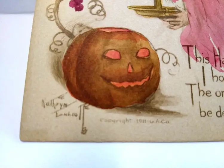 Hand tinted version by artist Kathryn Elliott for Gibson Art. Signed on front. Antique vintage original Halloween postcard. Non posted. Has light wear to corners. Dated 1911. Stock #663.