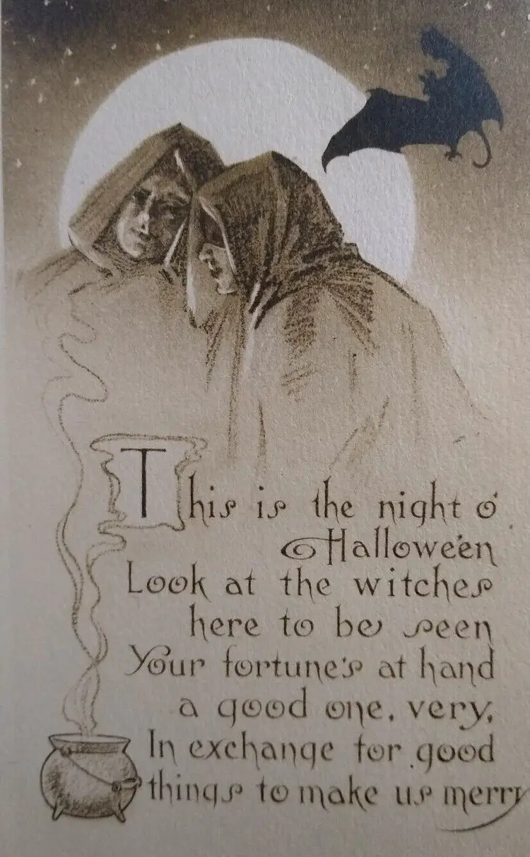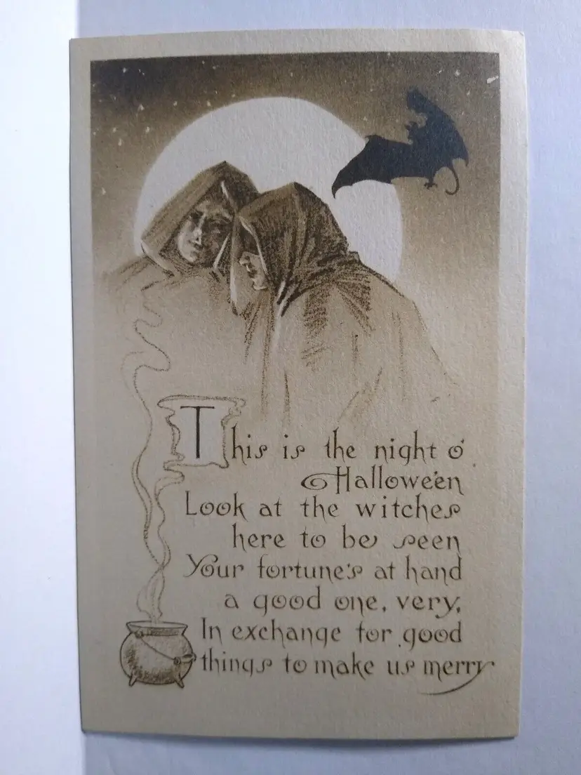 Artist: Kathryn Elliott Number of Items in Set: 1 Unit of Sale: Single Unit Antique: Halloween Occasion: Halloween Size: Standard (5.5 x 3.5 in) Signed: No Custom Bundle: No Material: Paper Year Manufactured: 1911 Original/Licensed Reprint: Original Franchise: Gibson Brand/Publisher: Gibson Arts Subject: Gothic Vintage: Halloween Postcard Type: Printed (Lithograph) Era: Pre-War (Pre-1914) Theme: Art, Fantasy, Greetings, Holiday, Bat, Moon, Stars, Goth, Cape Features: Divided Back Time Period Manufactured: 1900-1919 Country/Region of Manufacture: United States Postage Condition: Yes Original: Postcard