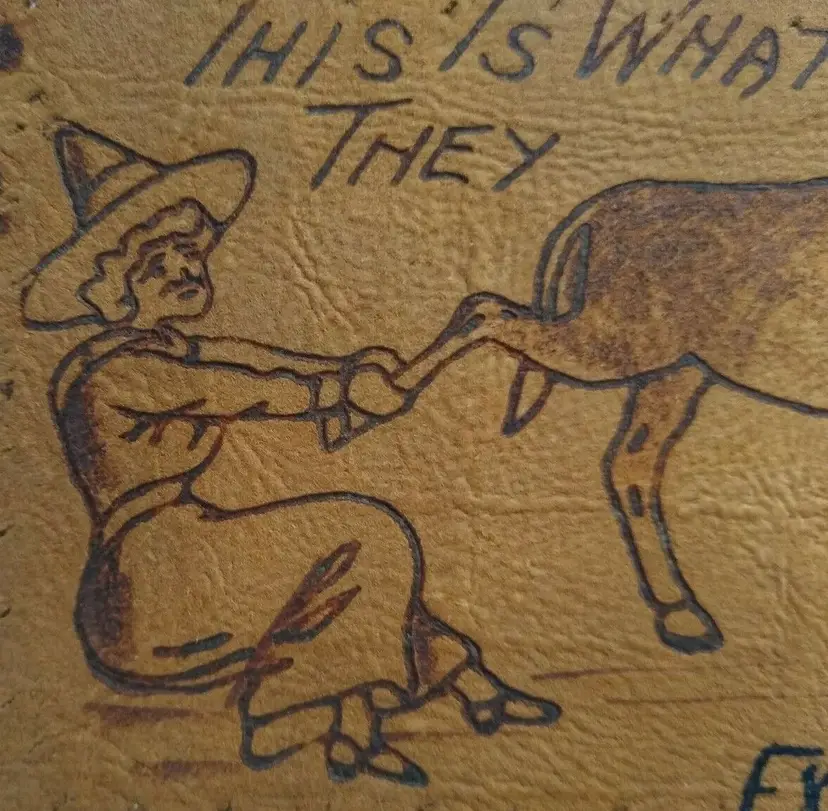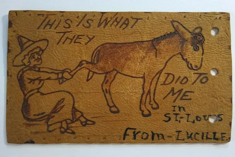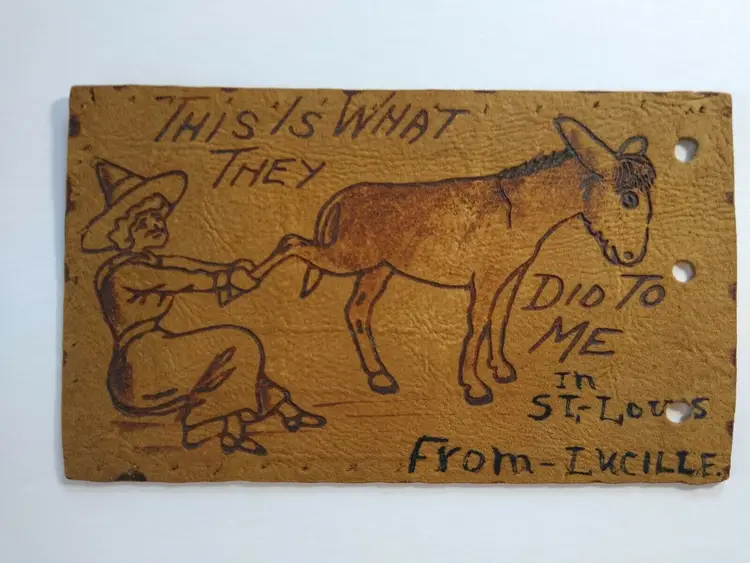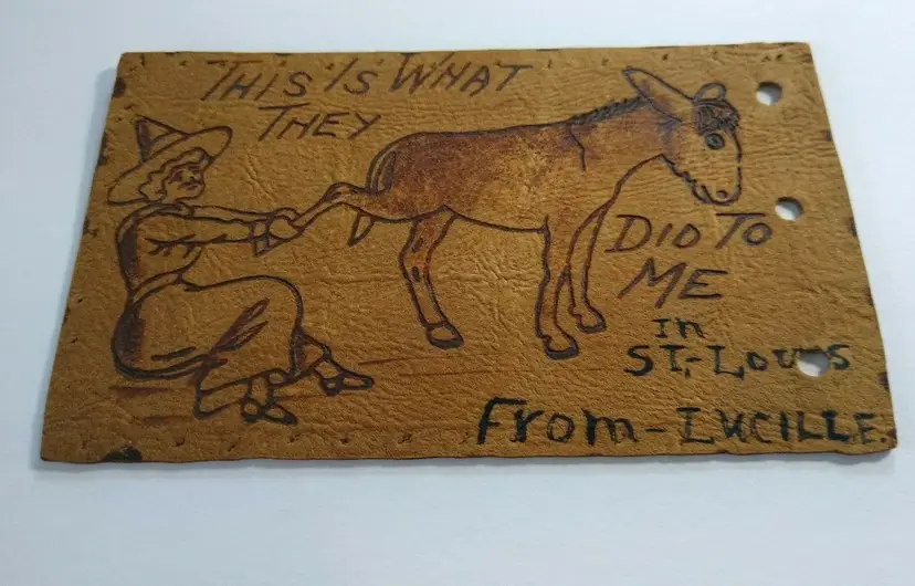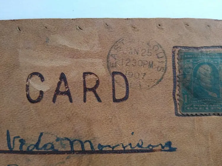 Antique vintage original postcard. This is an early leather card with Halloween theme. Has punch holes on right side and tack holes around the top, bottom, and left side. Not sure why?. Appears to has some custom text on bottom? Circa 1907 East St. Louis, Illinois cancel and stamp. Stock #208.