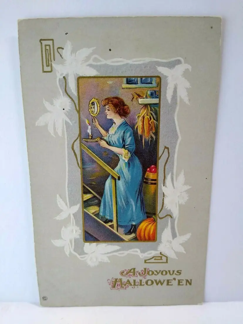 Size: Standard (5.5 x 3.5 in) Artist: Unknown Country/Region of Manufacture: Unknown Custom Bundle: No Material: Paper Theme: Staircase, Mirror, Art, Fantasy, Greetings, Holiday Type: Printed (Lithograph) Features: Divided Back, Embossed Year Manufactured: 1910 Subject: Victorian Number of Items in Set: 1 Postage Condition: Unposted Original/Licensed Reprint: Original Occasion: Halloween Time Period Manufactured: 1900-1919 Unit of Sale: Single Unit Era: Pre-War (Pre-1914) Brand/Publisher: Stecher Antique: Halloween Vintage: Halloween Postcard Original: Postcard