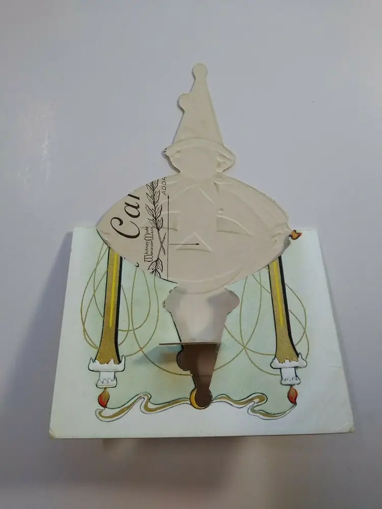 This is a die-cut design and is made to stand up. Well they never stood up well and I think very few of these were made. The cuts you see are original and made this way. Photos show how it looks as a regular card and when displayed with a small object to held keep it upright. Embossed details. Never posted. Some corner creases and age wear. Writing on back. Stock#523.