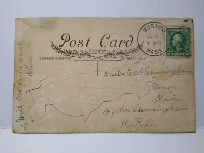Special rare series made by Whitney. This is a die-cut design and is made to stand up. Embossed details. Has spotting and age wear. Posted with Boston, Massachusetts cancel and stamp. Stock# 564.