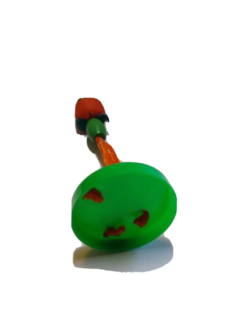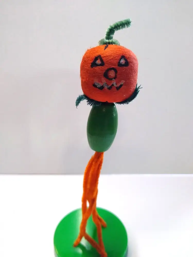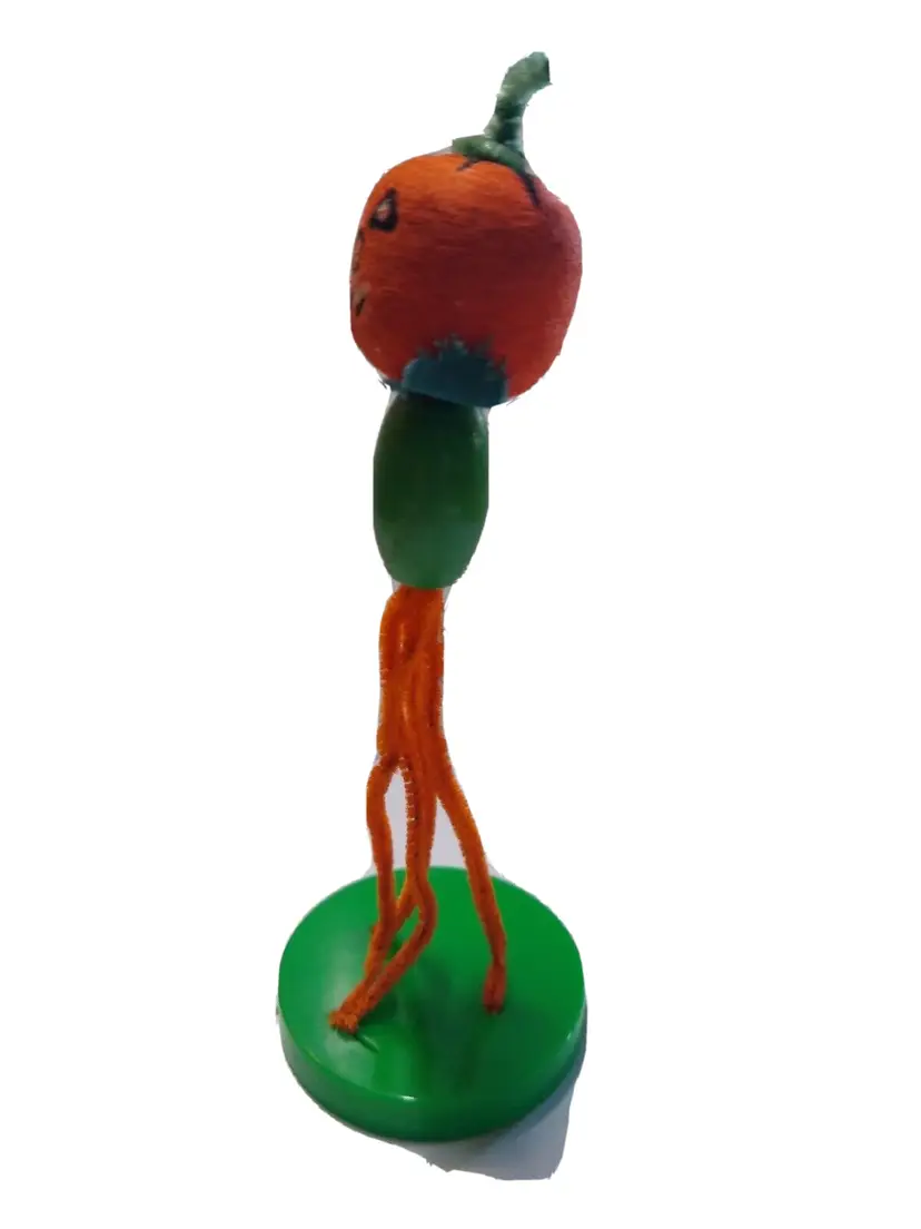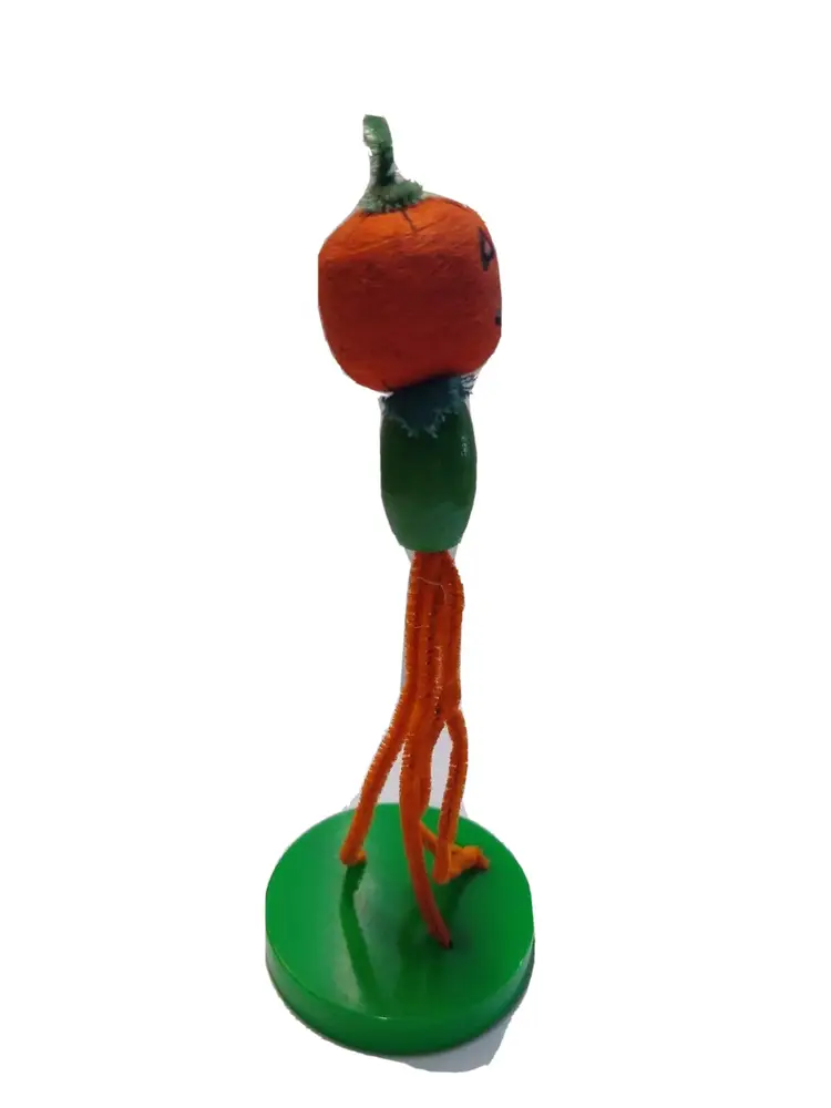 Vintage Halloween strange looking Witch decoration. Has squid like pipe cleaner legs, wood body, plastic base, and assorted fabrics. Size is 5.25" tall. Excellent condition. Have a matching witch version also for sale in our shop.