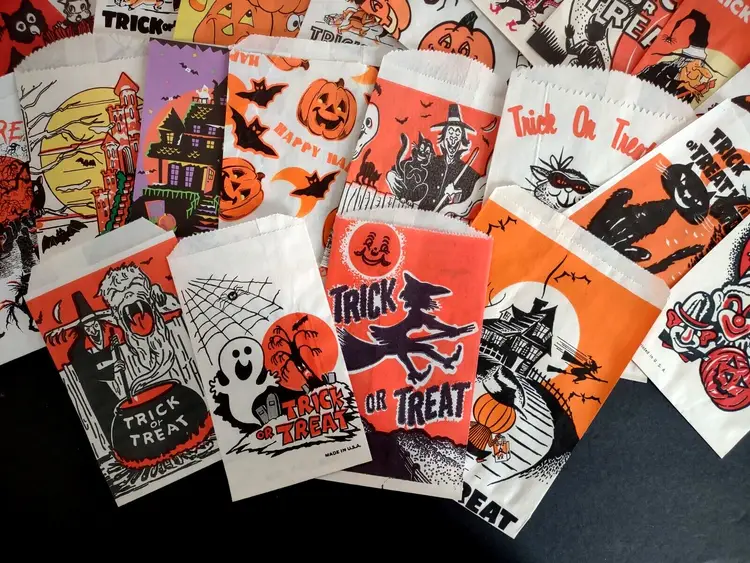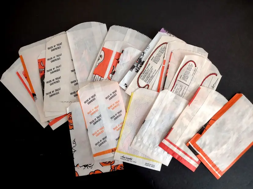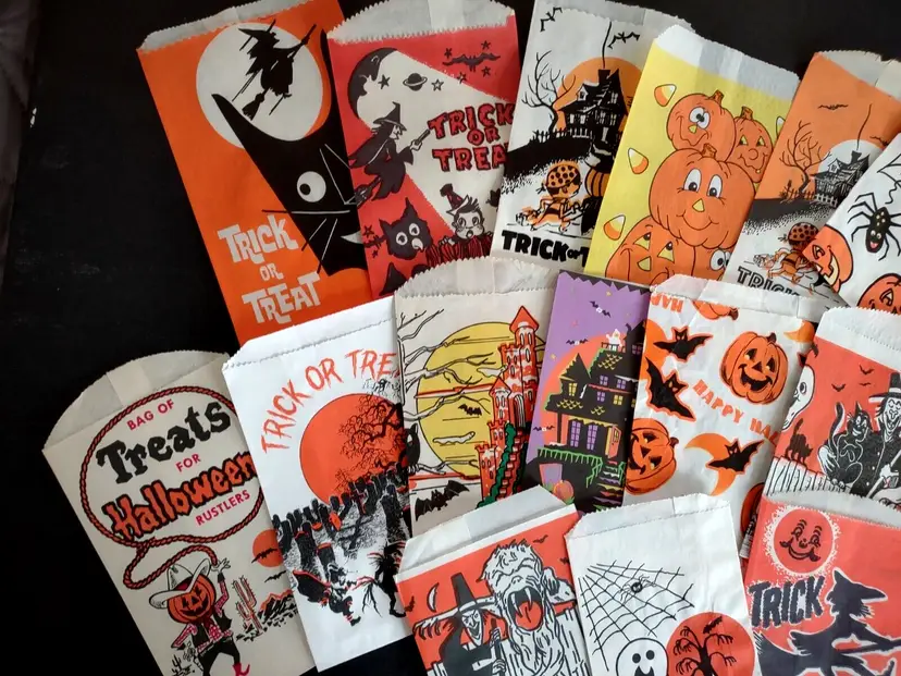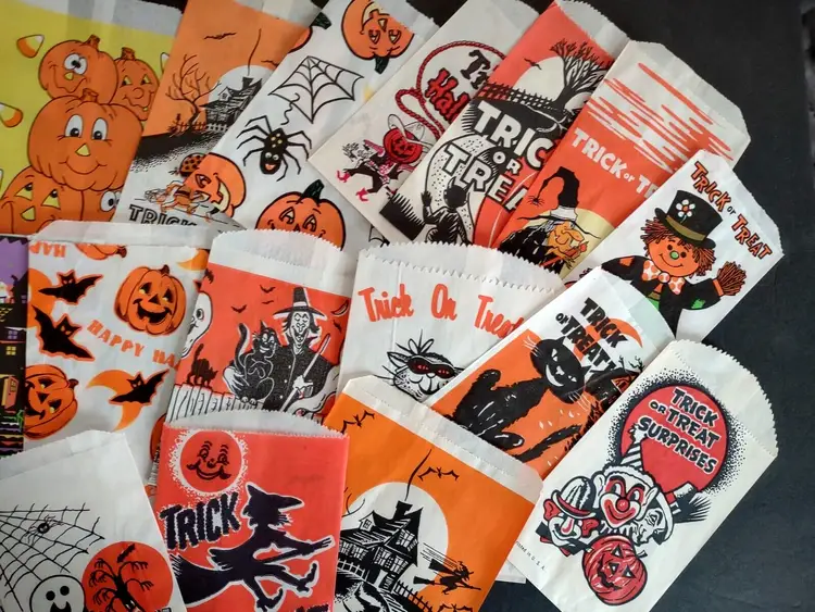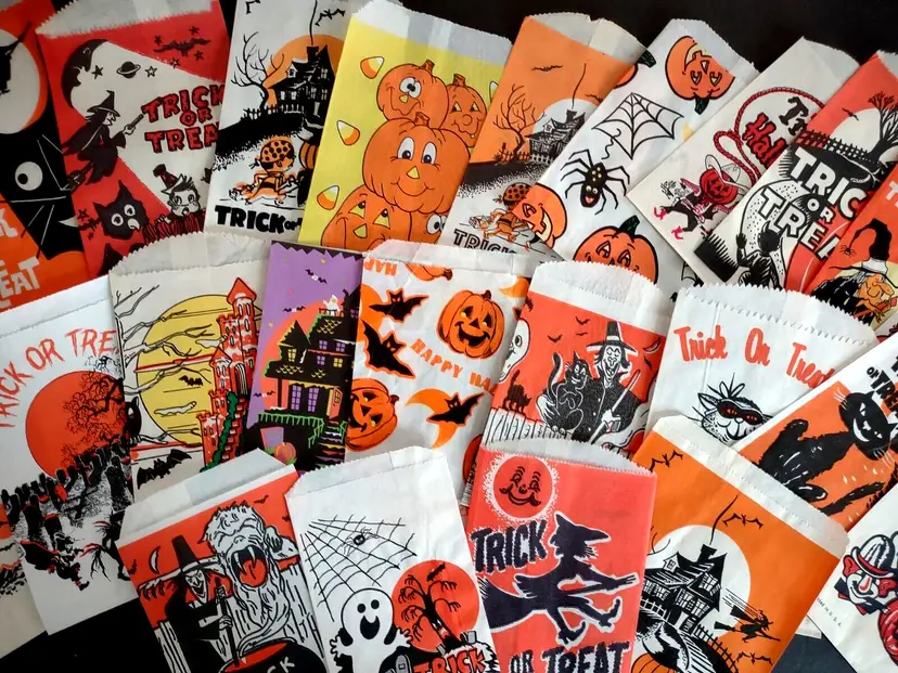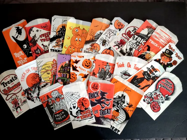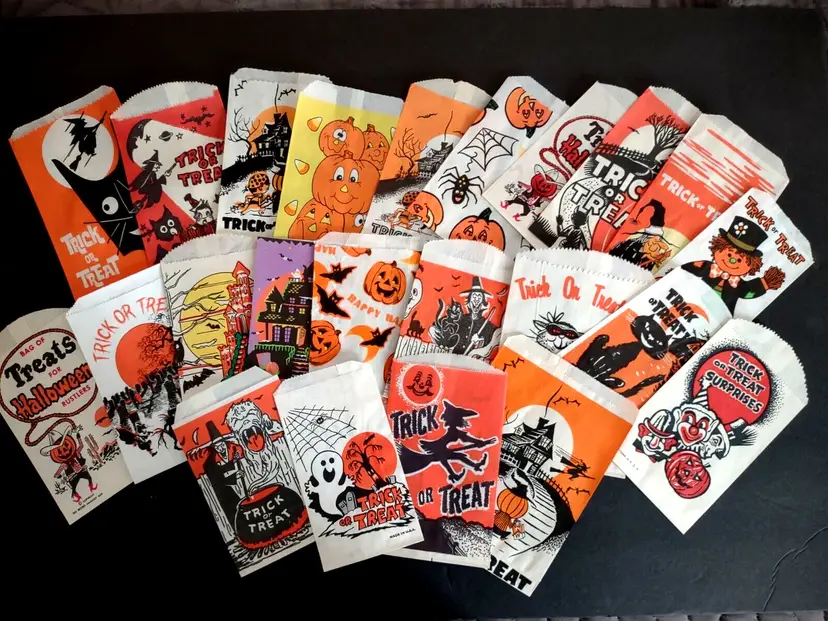 Big lot of (23) different vintage Halloween trick or treat paper or glassine bags. UNUSED old stock. Some do have wrinkles and storage wear.