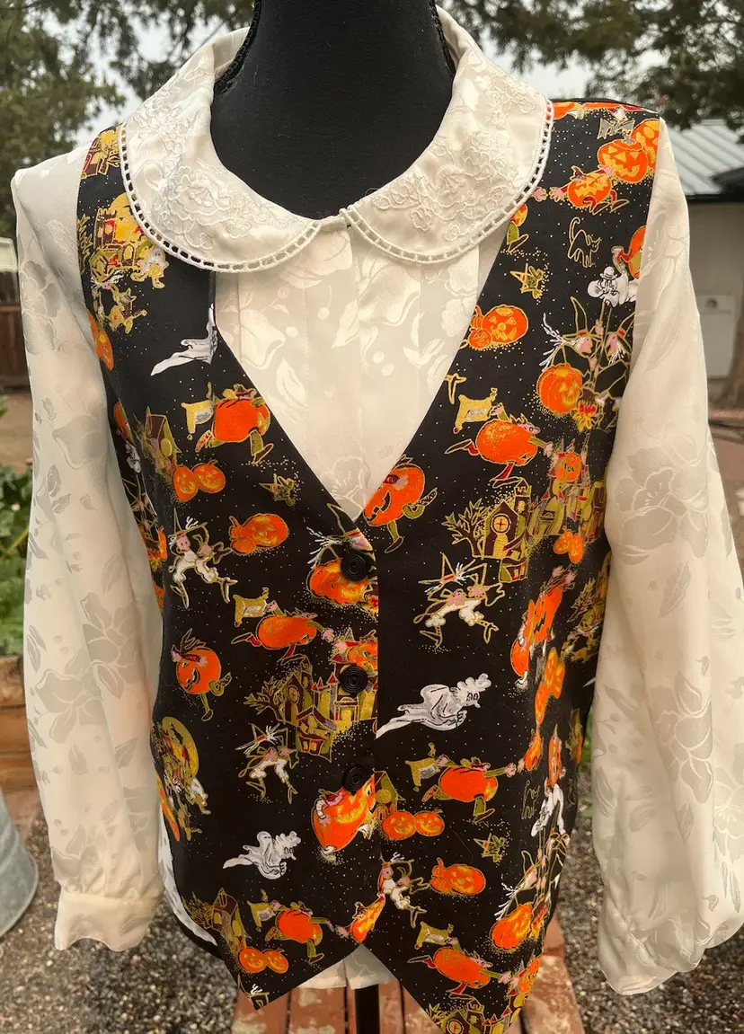 Halloween vest, with optional blouse Size medium, new , multi-colored , witches, pumpkin, ghosts 19” long, 19” chest Blouse is size 10, in excess conditioner