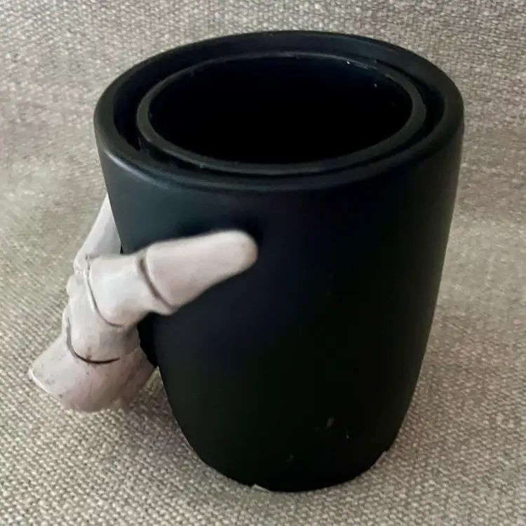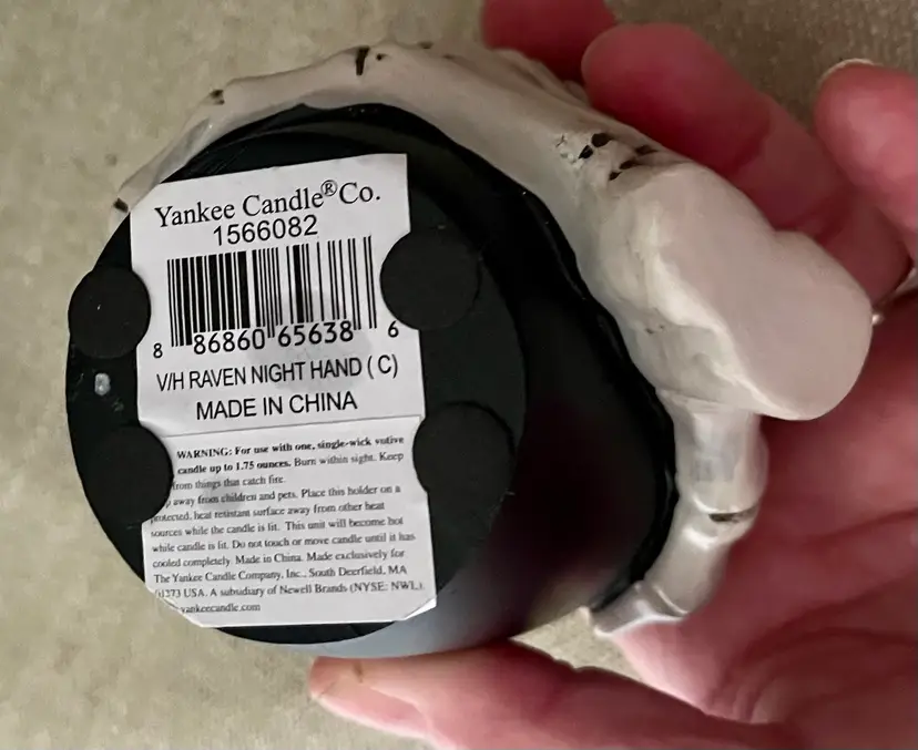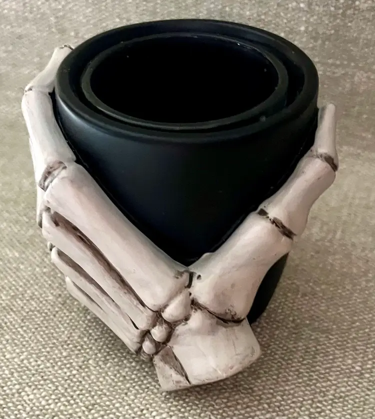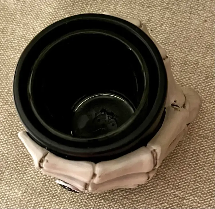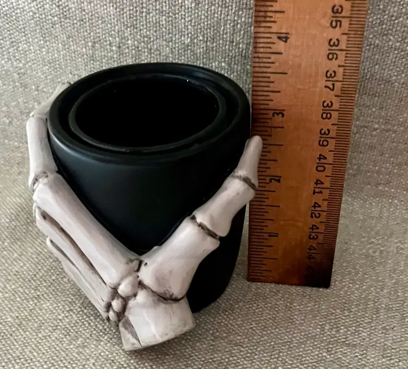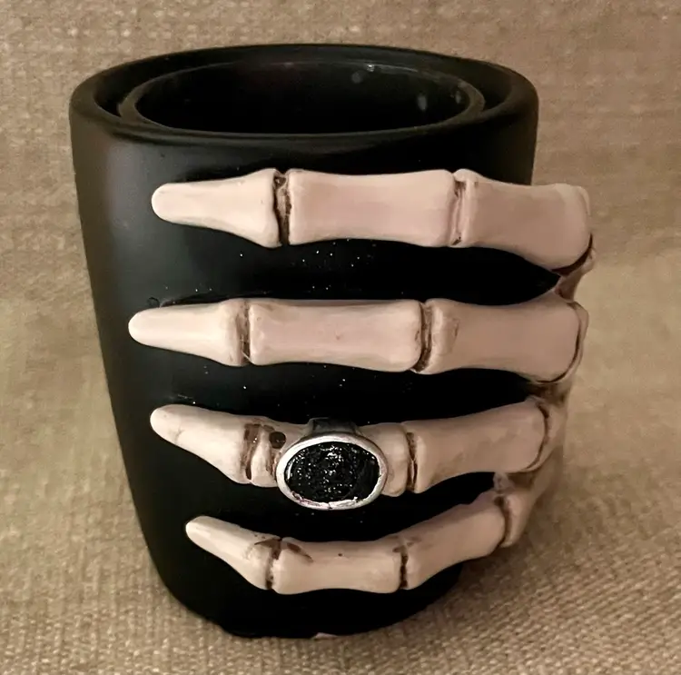 The Halloween Yankee Candle Skeleton Hand Votive Holder is a medium-sized candle holder designed to add a spooky touch to your decorations. Made of resin and glass, this black and white primarly colored holder is suitable for use with a votive candle or tea light ~ even battery operated style. With a Gothic style and a matte finish, this piece is ideal for Halloween decor. Made in China in 2017, this Yankee Candle product will come boxed for shipping purposes (does NOT include an original packaging box.