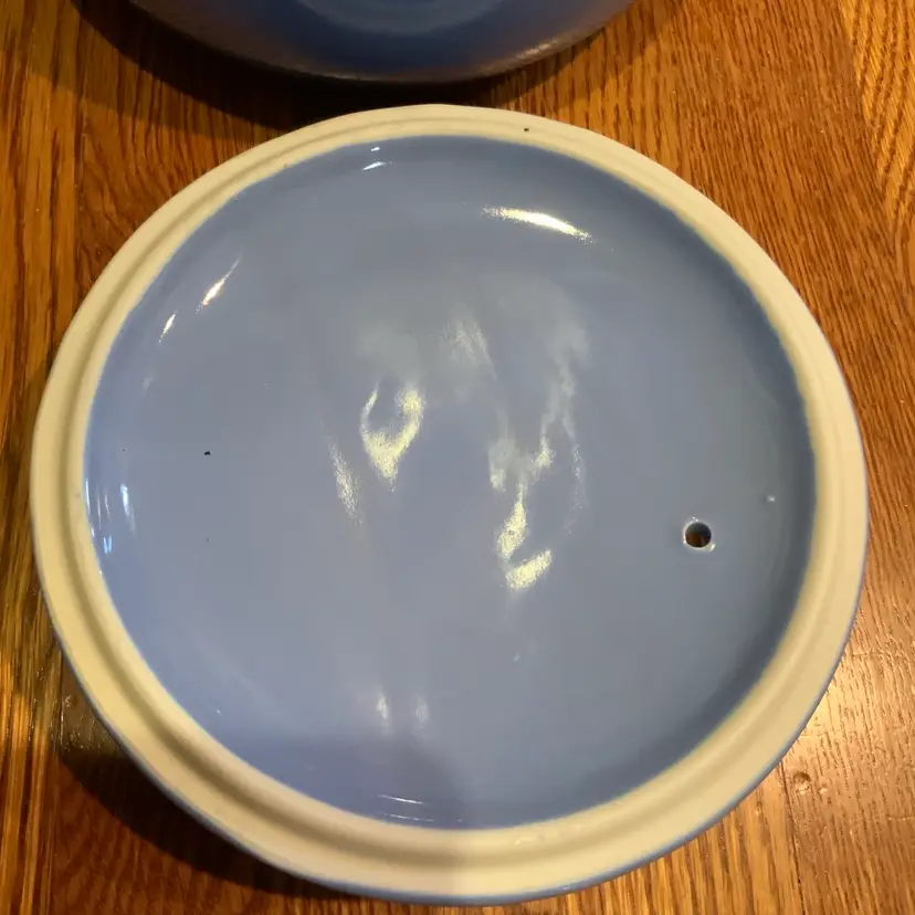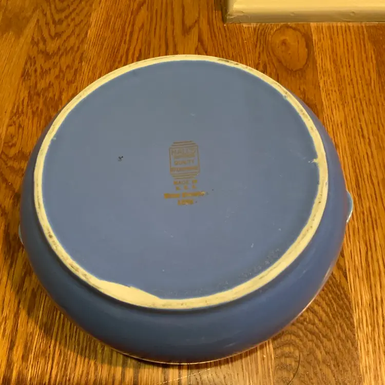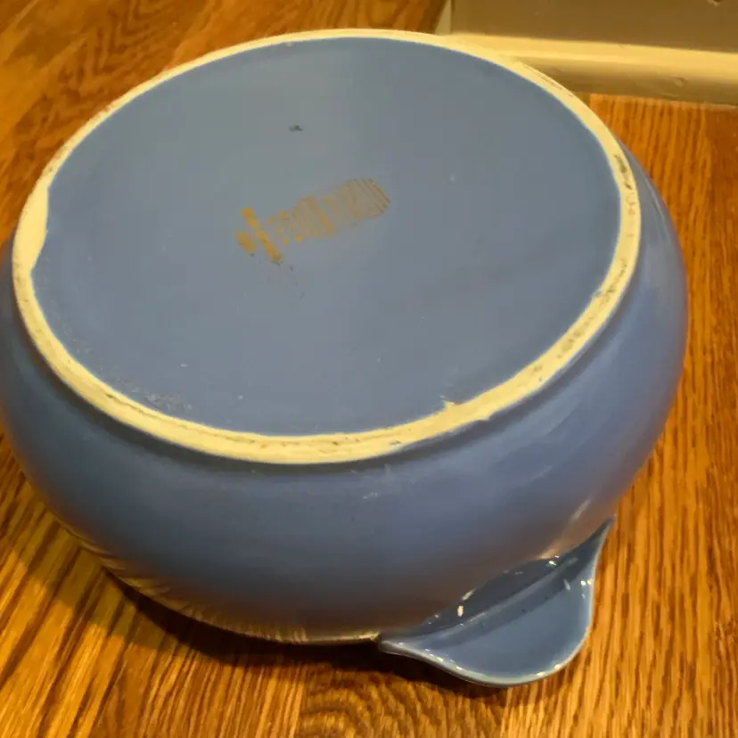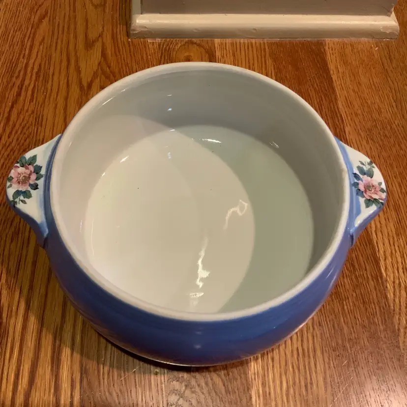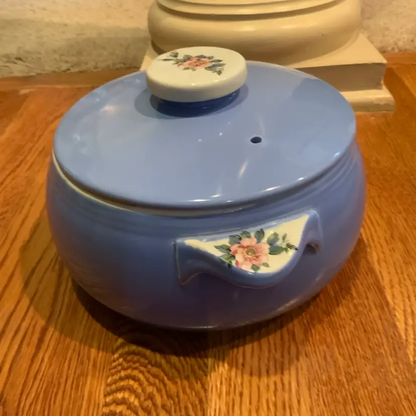 Halls kitchenware Casserole Bowl with Lid Pattern is Rose Parade Blue with floral handles and knob Vintage Made in USA No Chips or Cracks