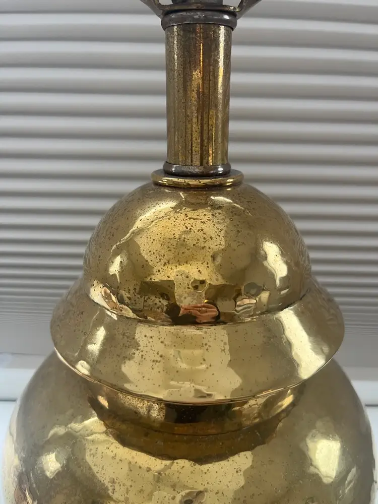 Vintage hammered brass table lamp with an urn-shaped body and dark wood base. Classic mid-century style with a warm brass finish and natural patina that gives it great character.