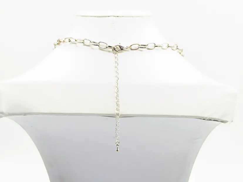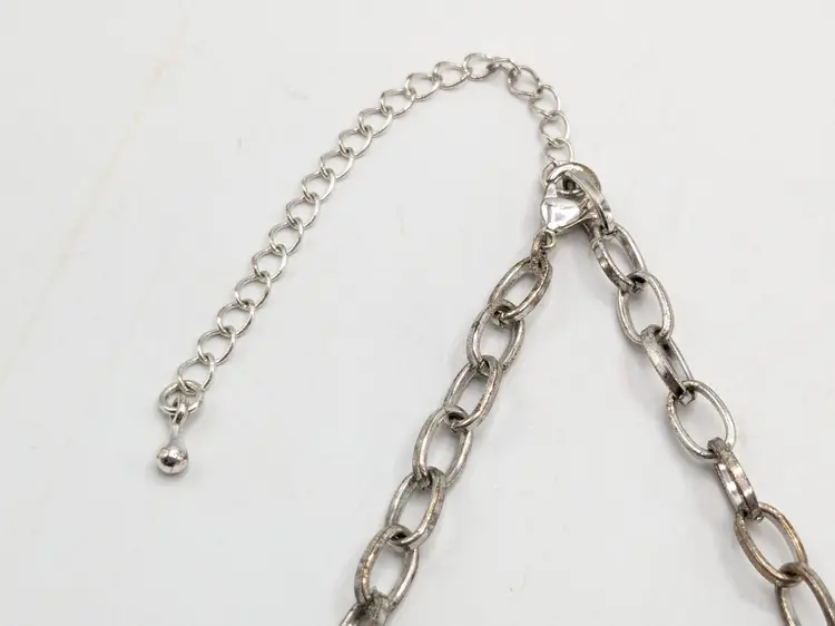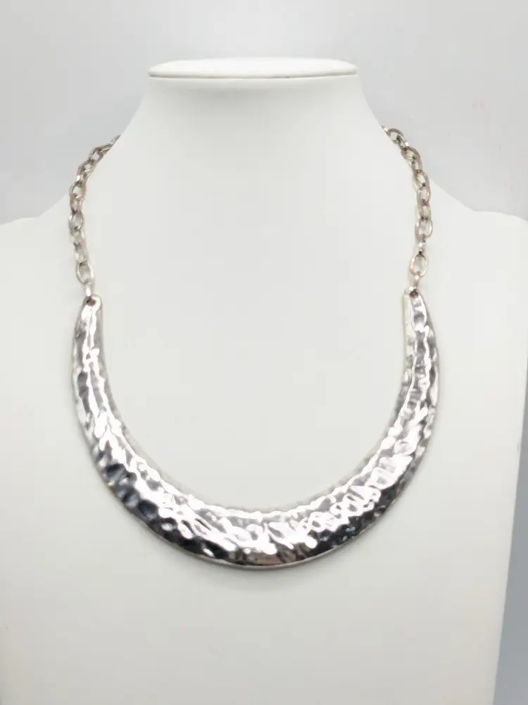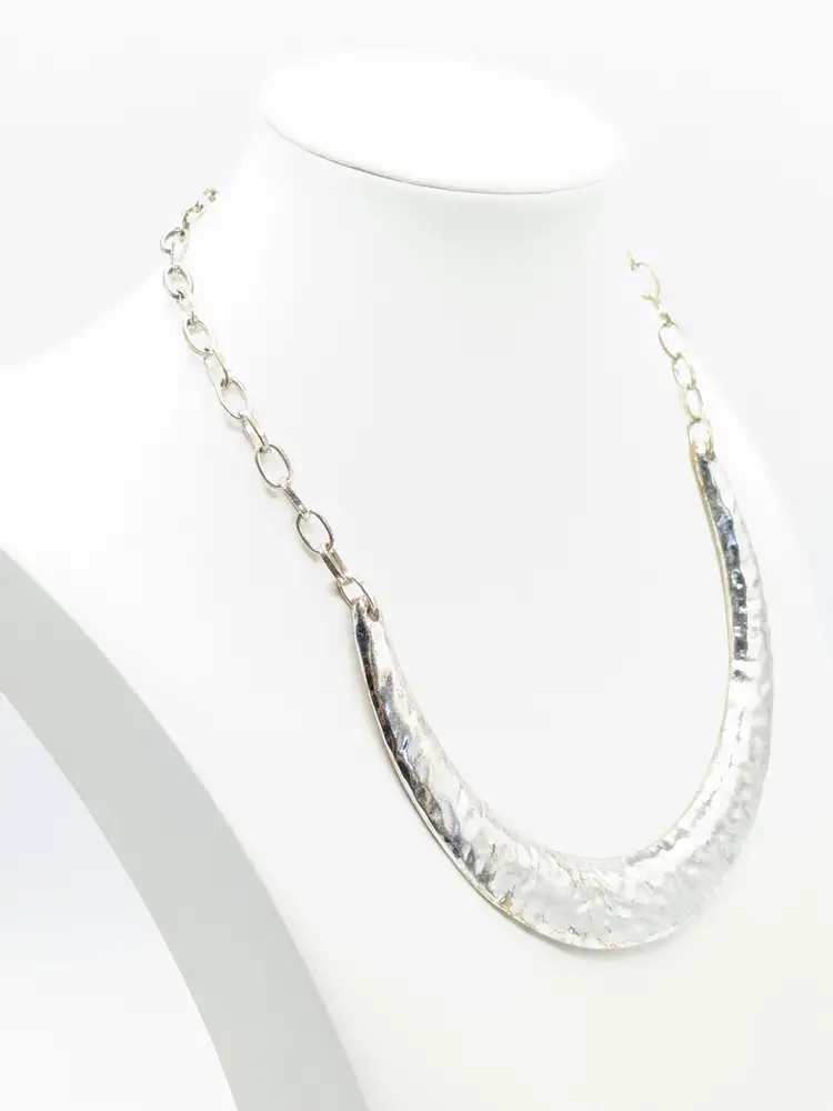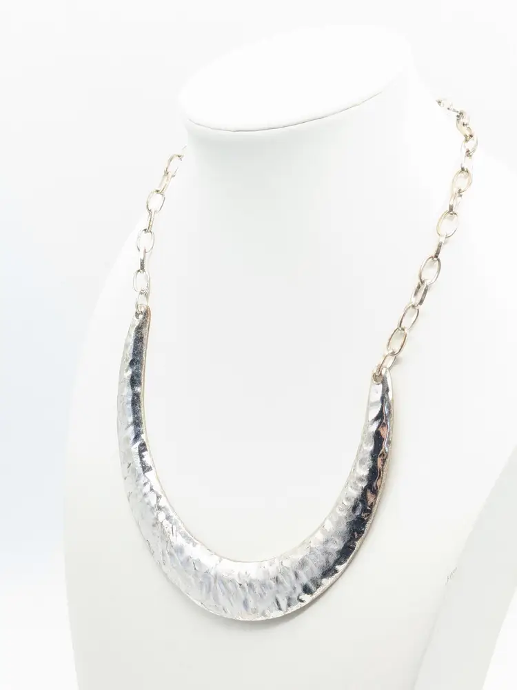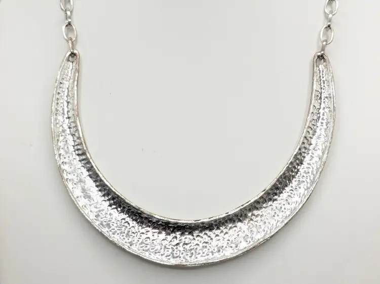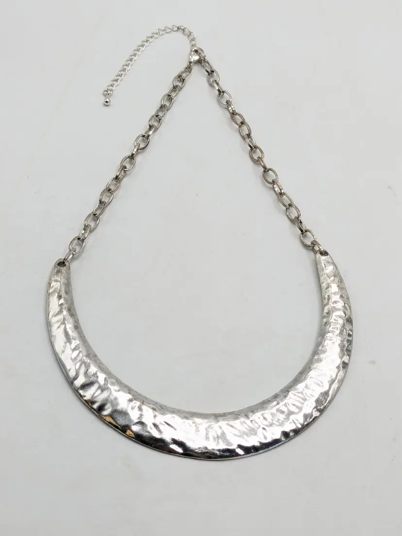 Good condition. Stylish hammered silver tone crescent necklace with chain. Perfect for adding a bold touch to any outfit. Measures 16" + 3" extension. (EN2)