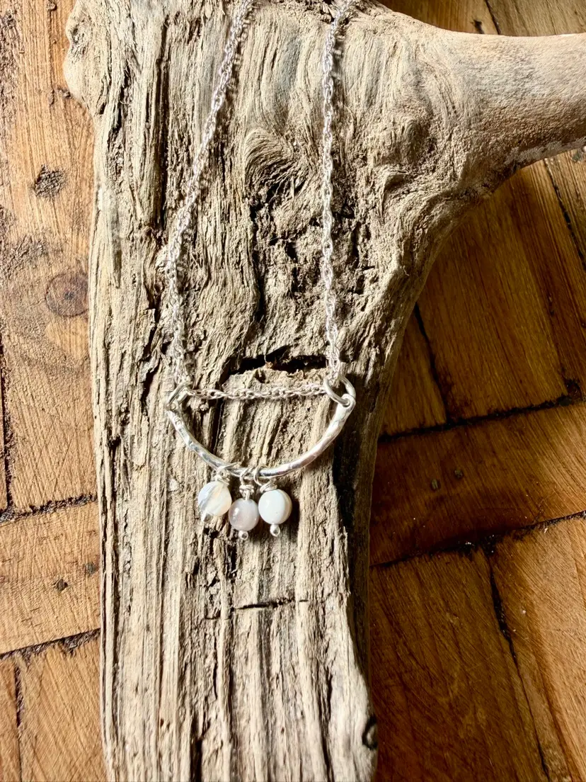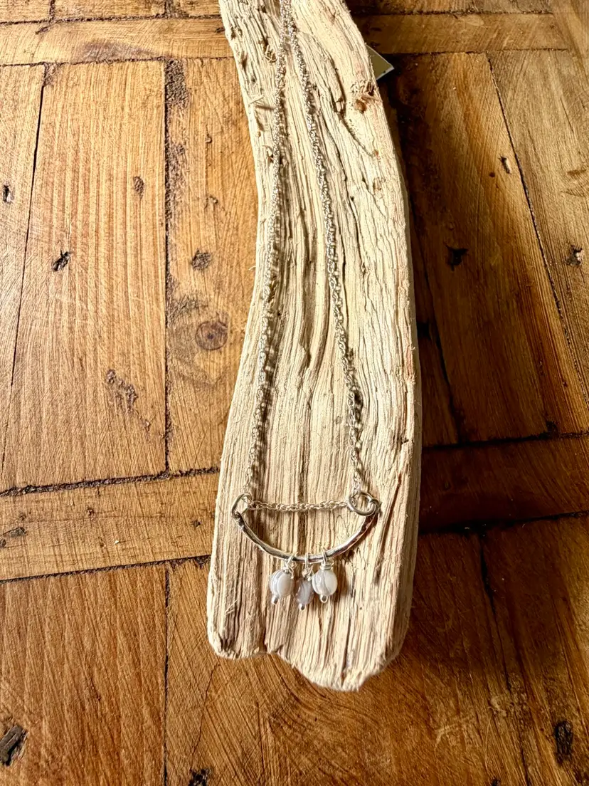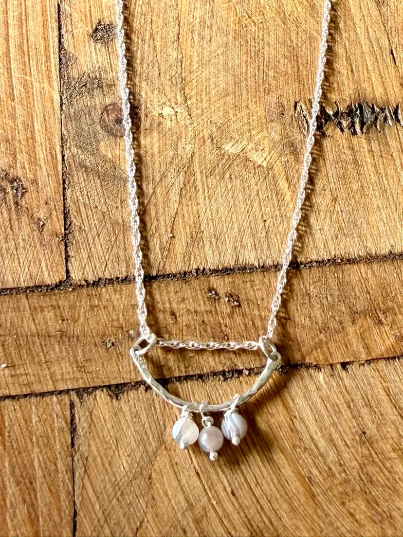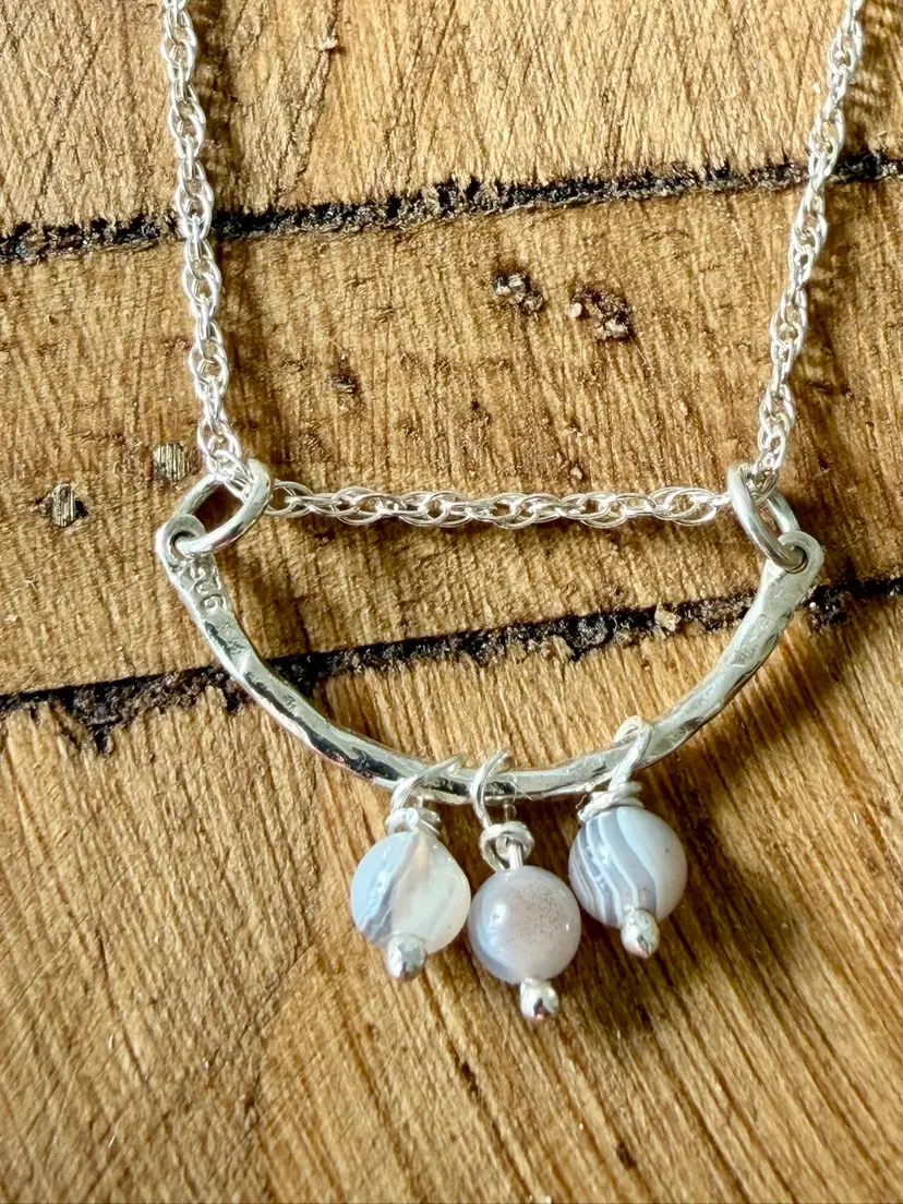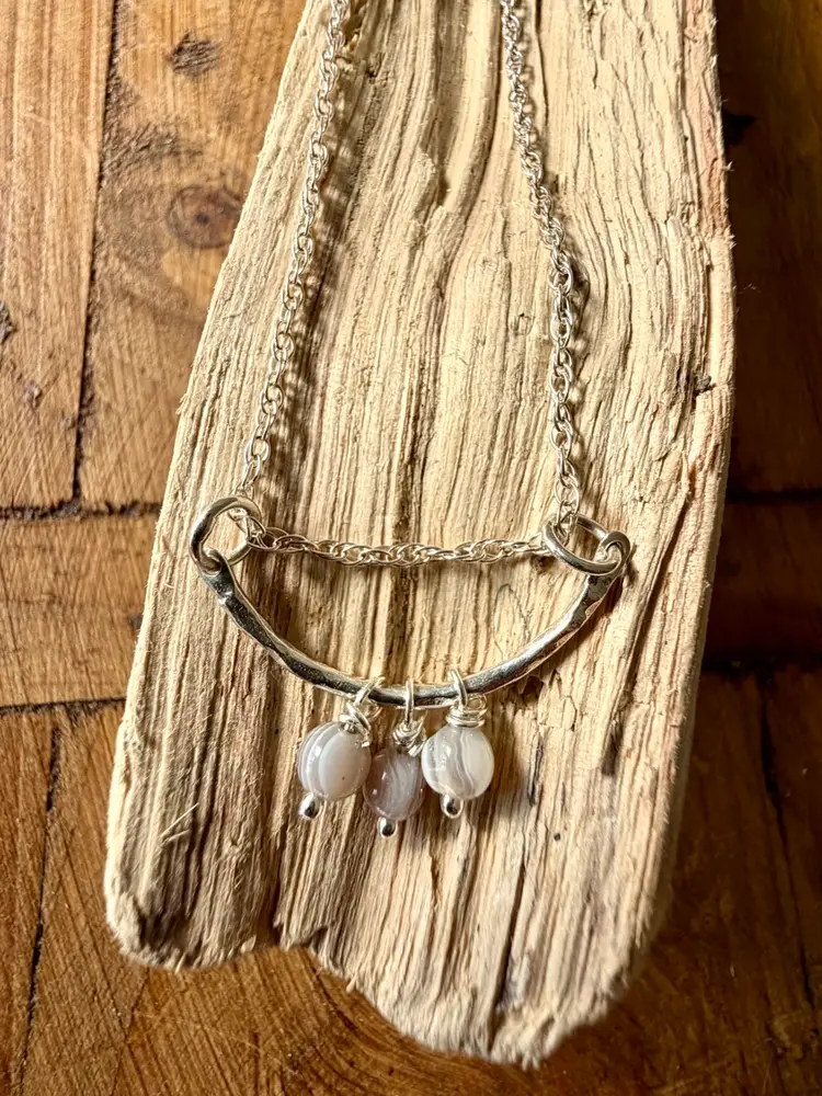18”Silver 925 Chain 1” Curved Sterling Bar Three Hand Wire Wrapped Botswana Drops