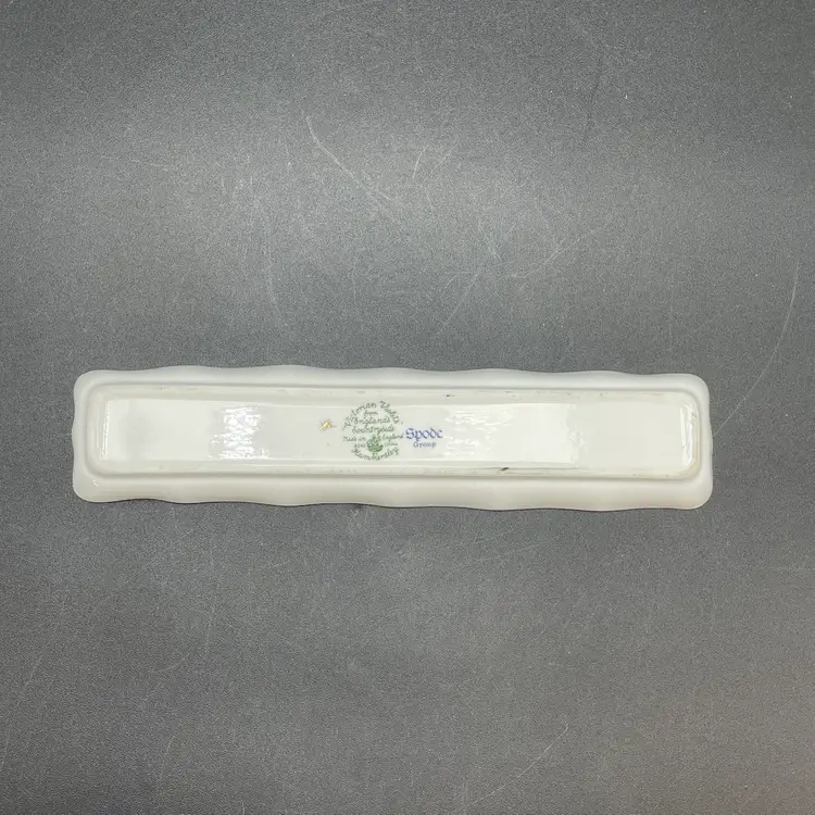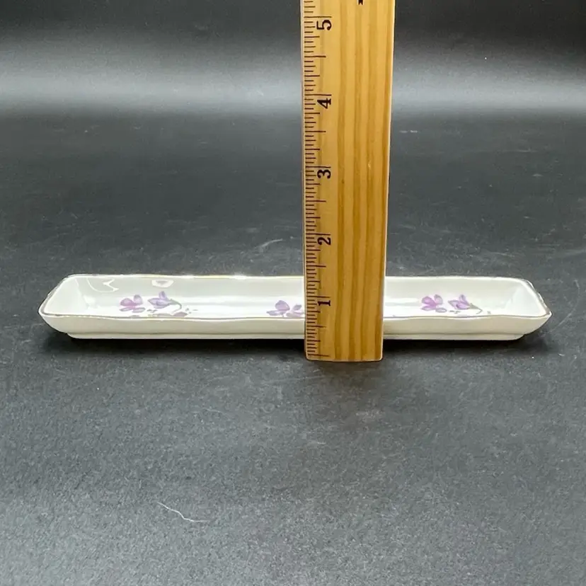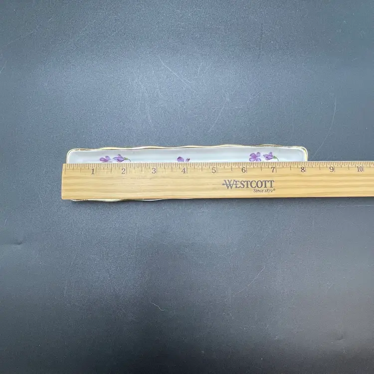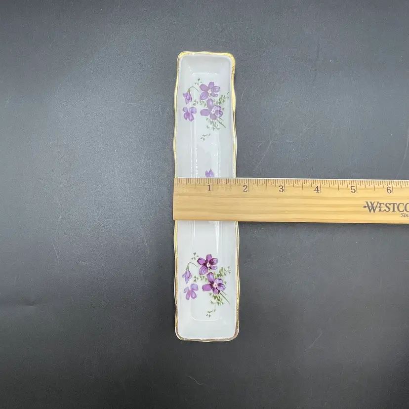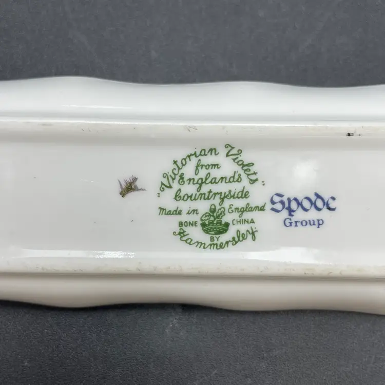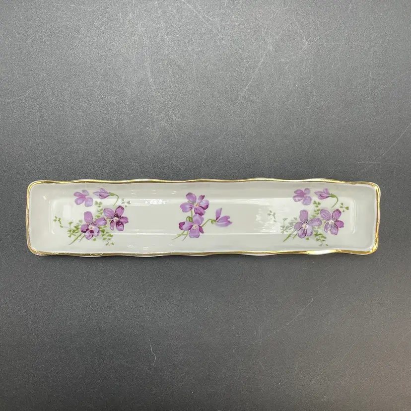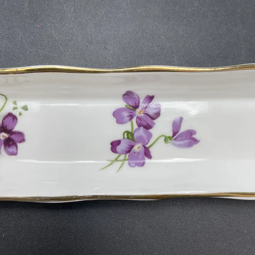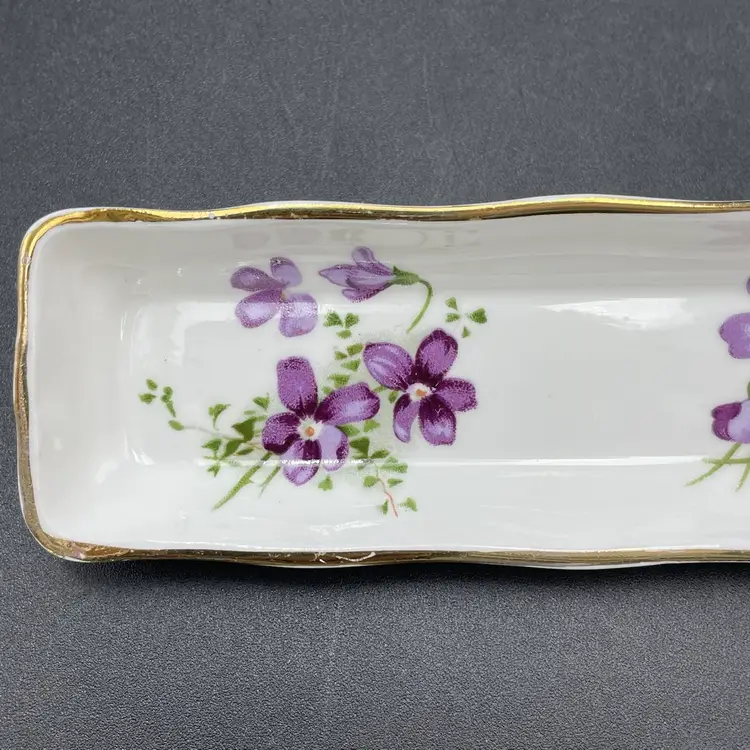 This is a vintage Hammersley Victorian Violets bone china mint tray or trinket dish. Marked on the bottom. Made in England. Measures approximately 8" long x 2" wide x .5" deep. No chips or cracks.