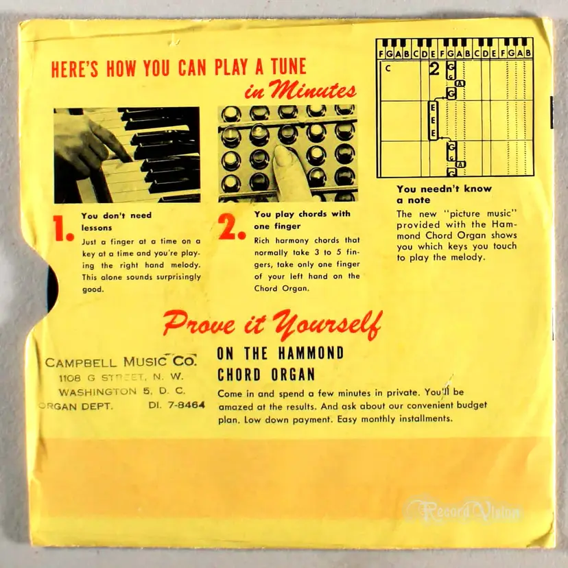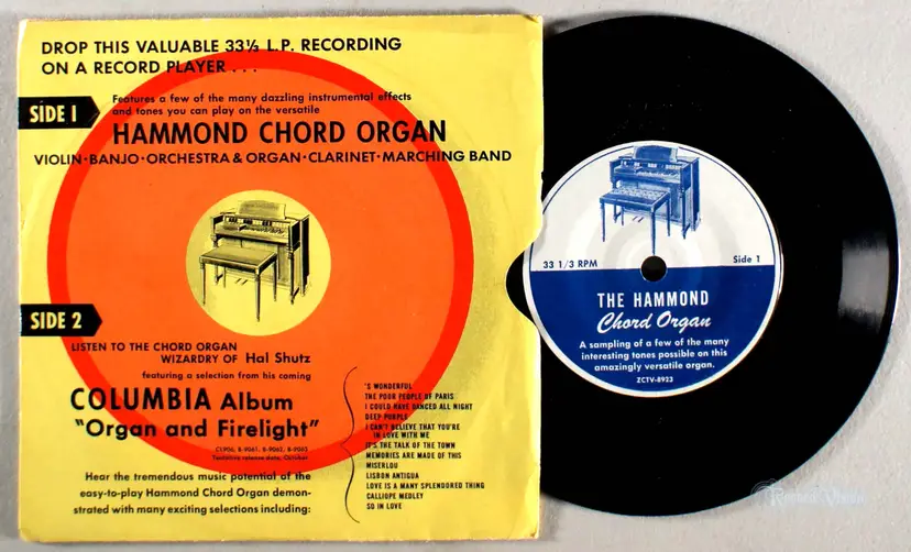 Hammond Chord Organ Sampler features a few of the many dazzling instrument effects and tones you can play on the versitile Hammond Chord Organ. Listen to the chord organ wizardry of Hal Shutz featuring a selection from his then-upcoming Columbia album Organ and Firelight. Hear the tremendous music potential of the organ.