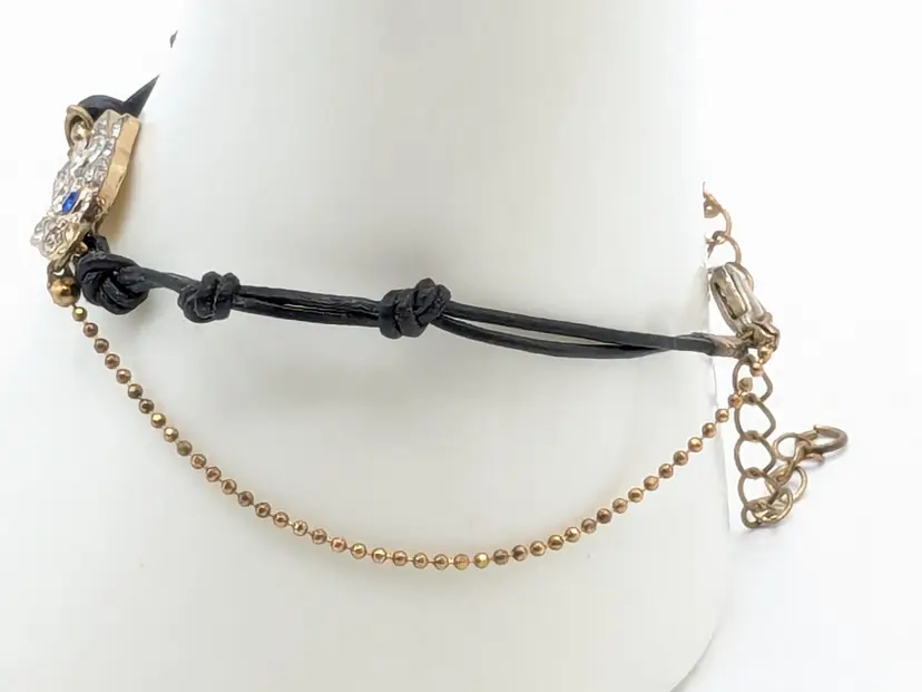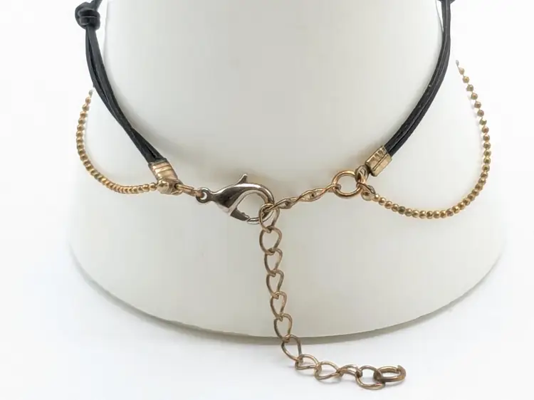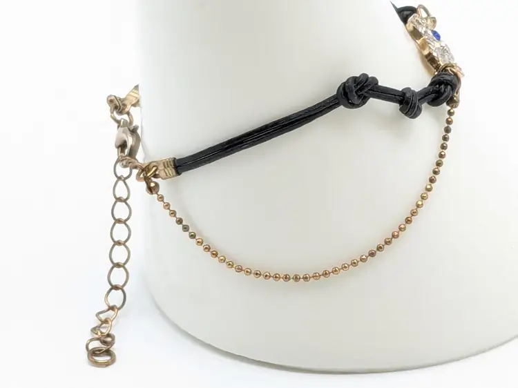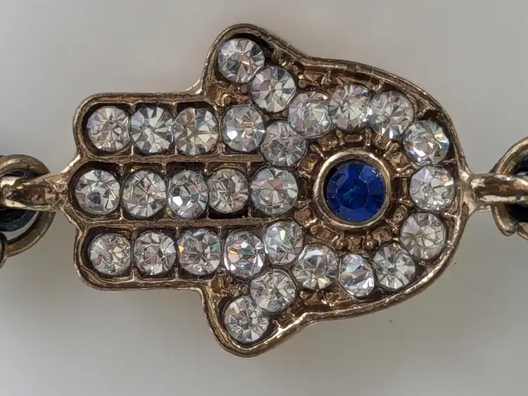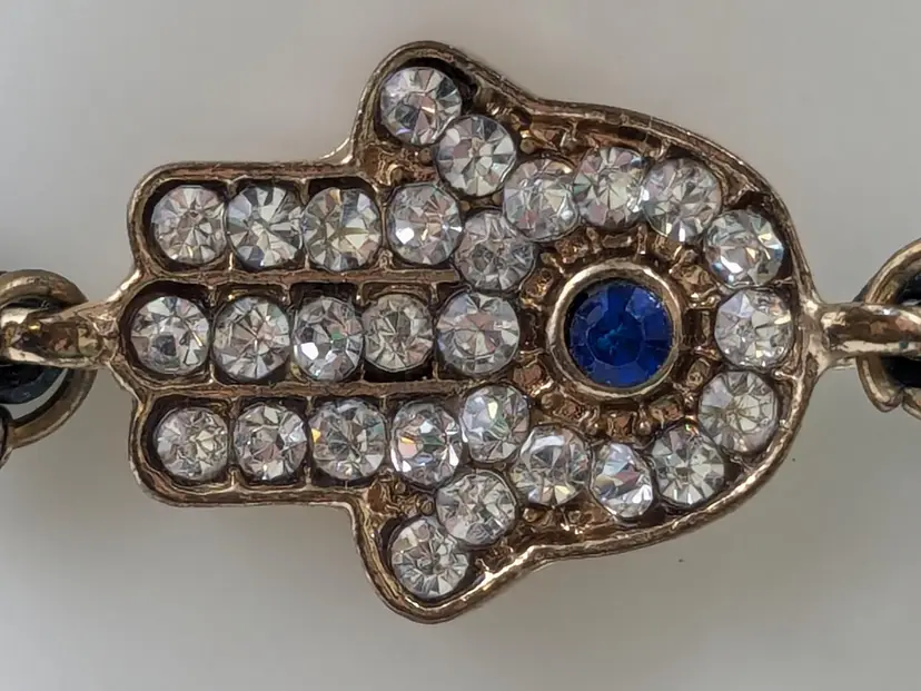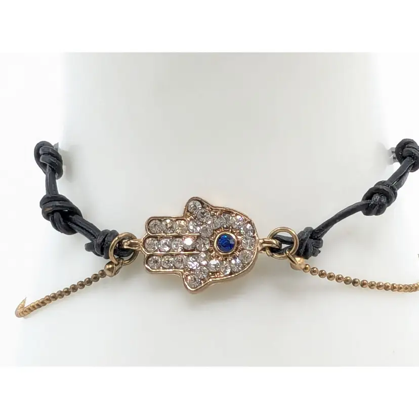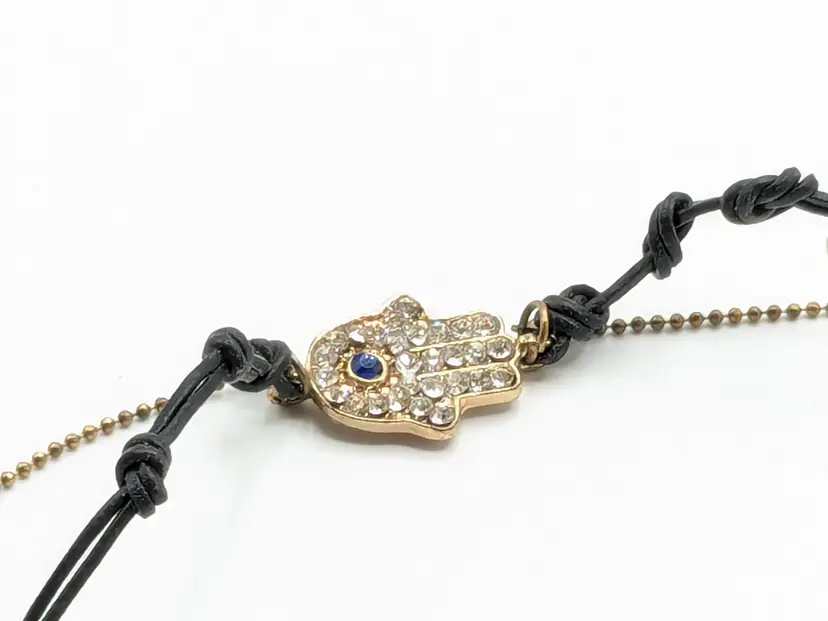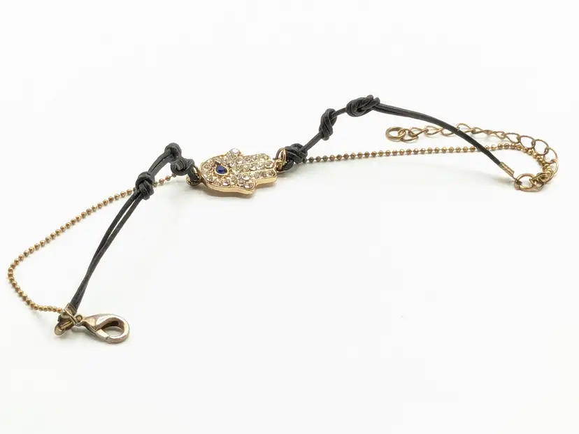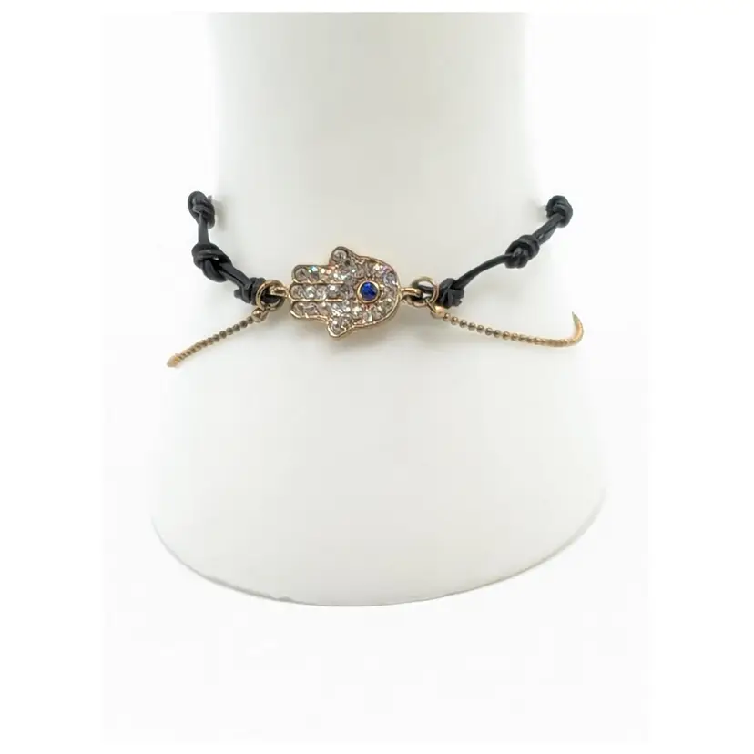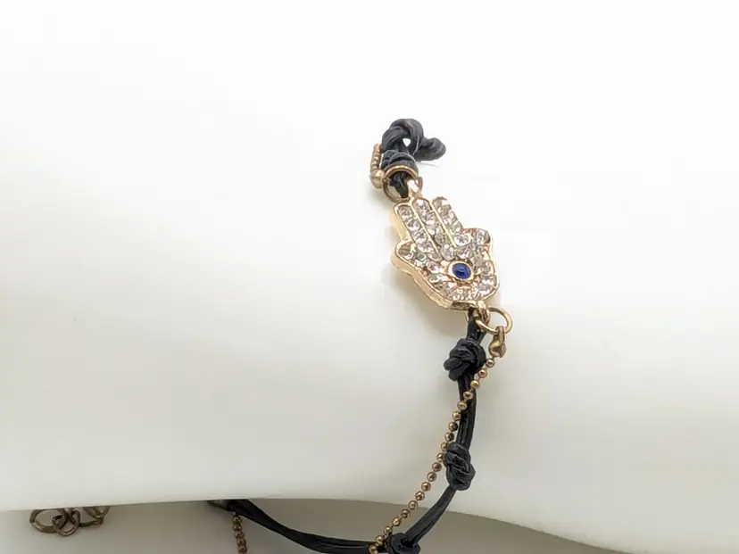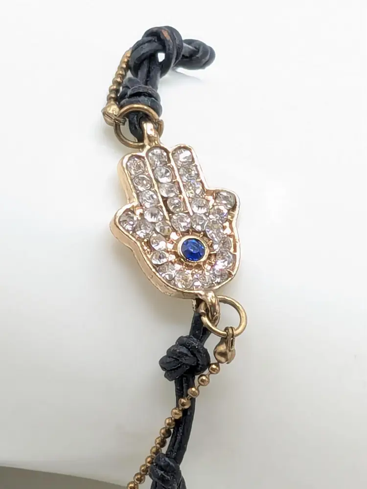 Stylish bracelet featuring a Hamsa hand charm adorned with sparkling rhinestones and a blue center stone. The charm is set on a black cord. Great condition. Ideal for adding a touch of protection and elegance to your outfit. Measures up to a size 8 1/2". (EN1)