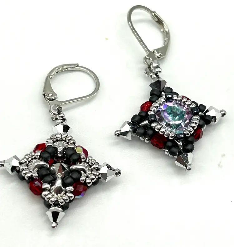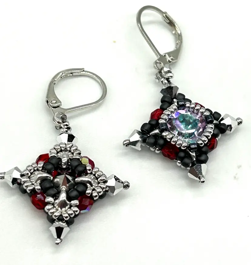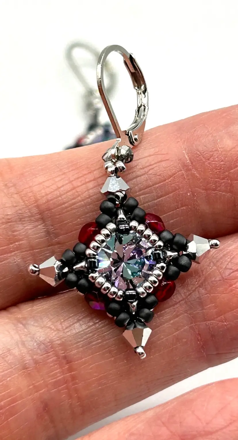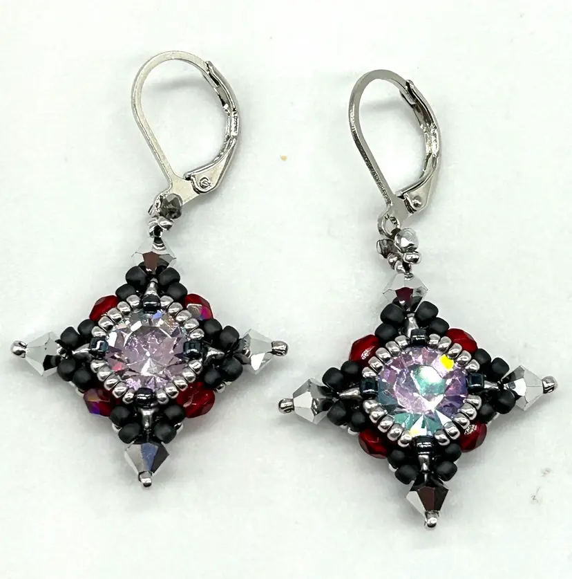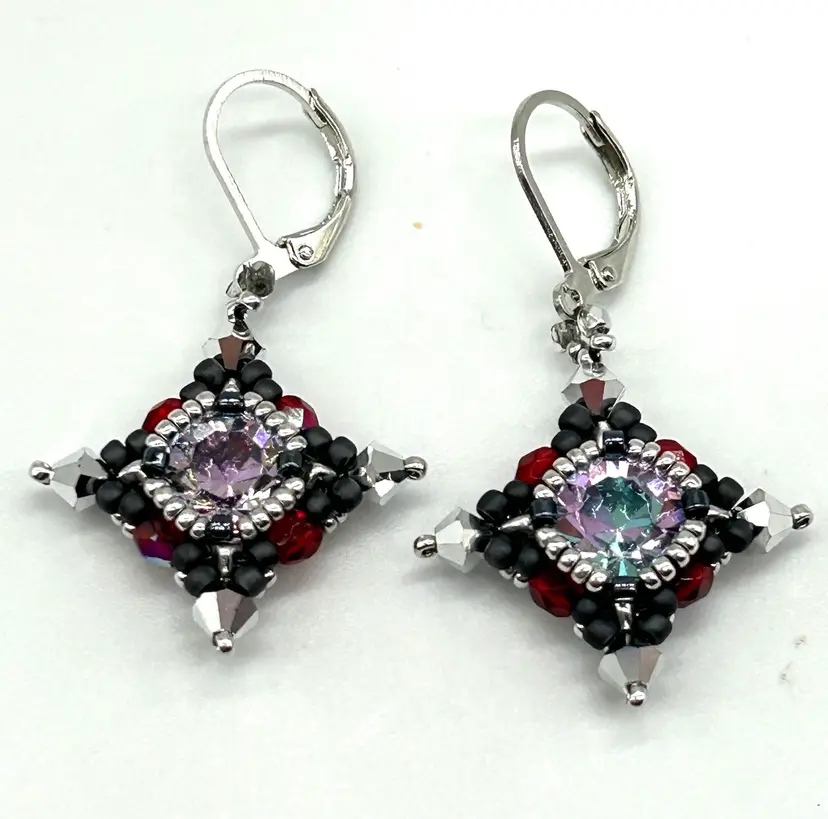 Hand beaded by me in my Seattle studio these earrings are as light as a feather Earrings measure 1.75” long and are hung from a pair of pewter colored lever backs