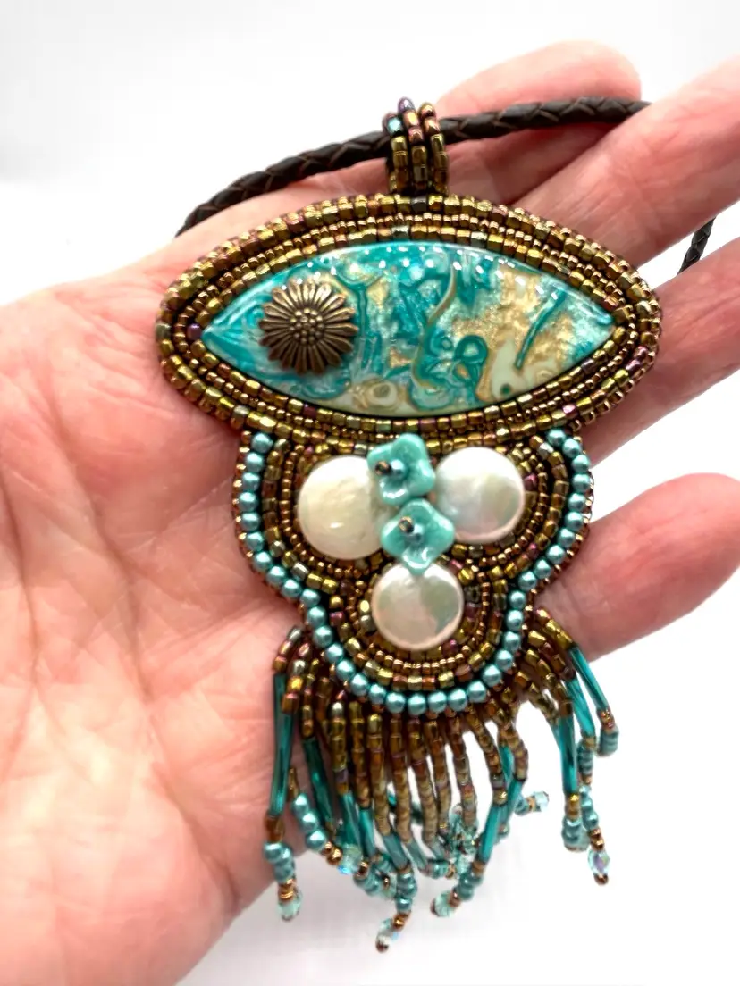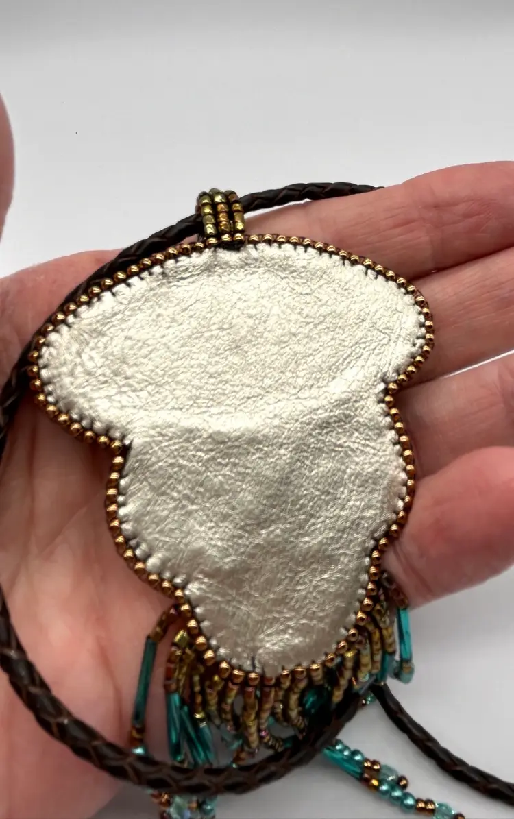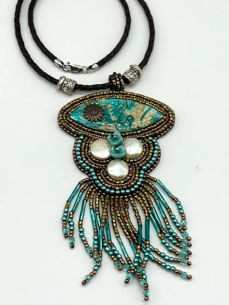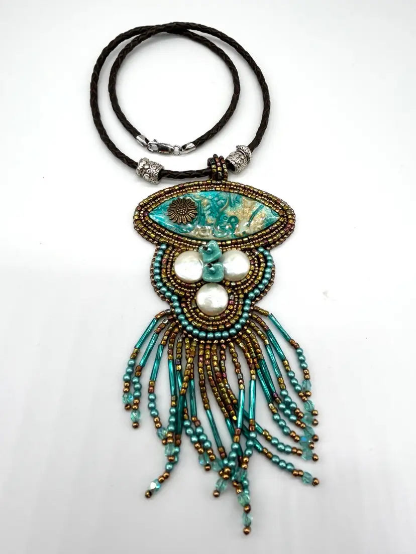 Focal is hung on a braided leather cord with a sterling silver clasp. Measures 16” long and the focal is 4.75” long.