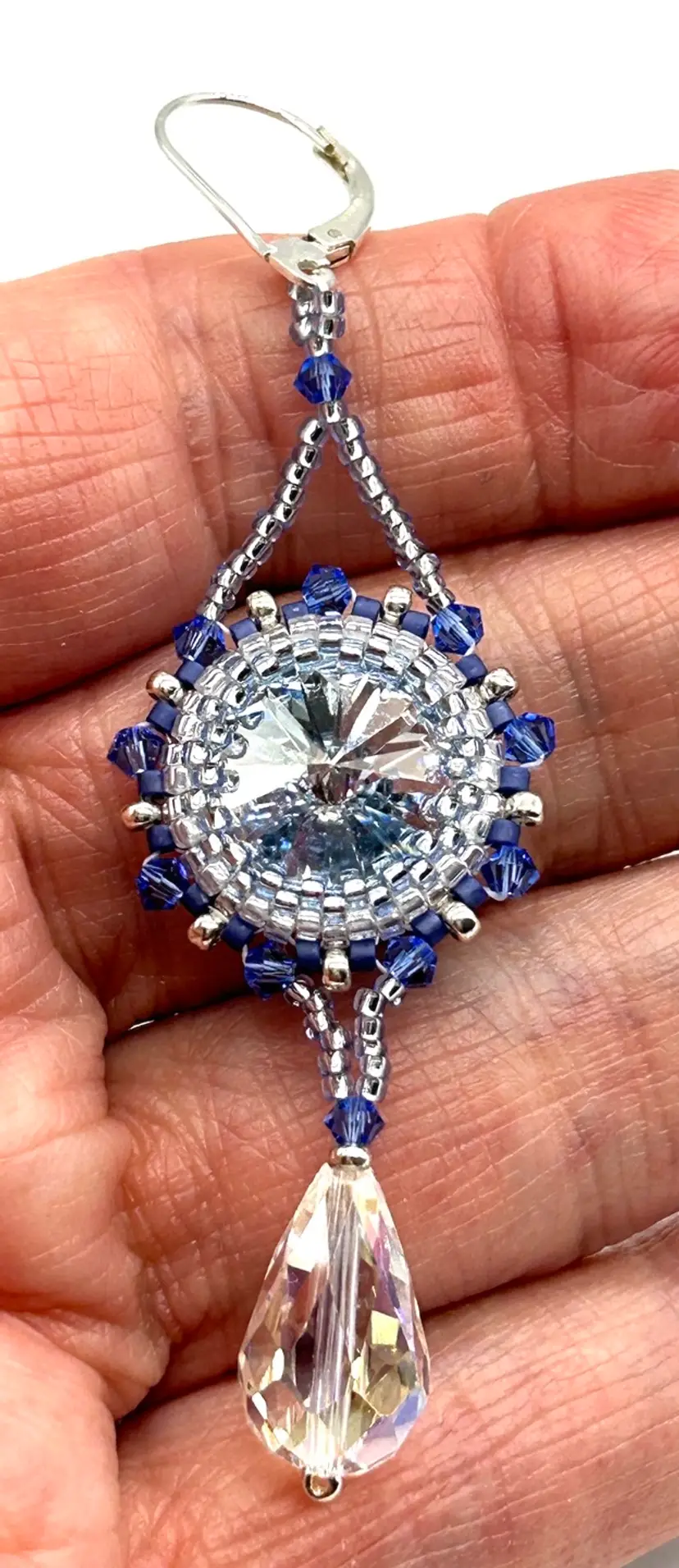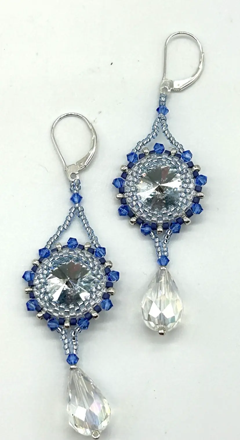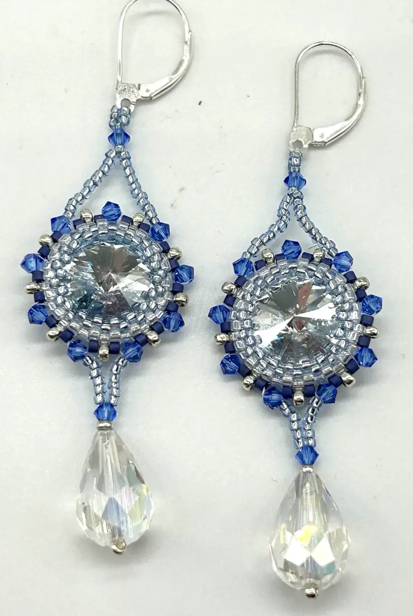 Hand beaded by me in my Seattle studio these beautiful earrings are perfect for a summer dinner or party. Swarovski Rivoli’s combined with Miyuki seed beads and Swarovski bicones with a crystal drop. The earrings are silver plated and are as light as a feather. Earrings measure 3” long