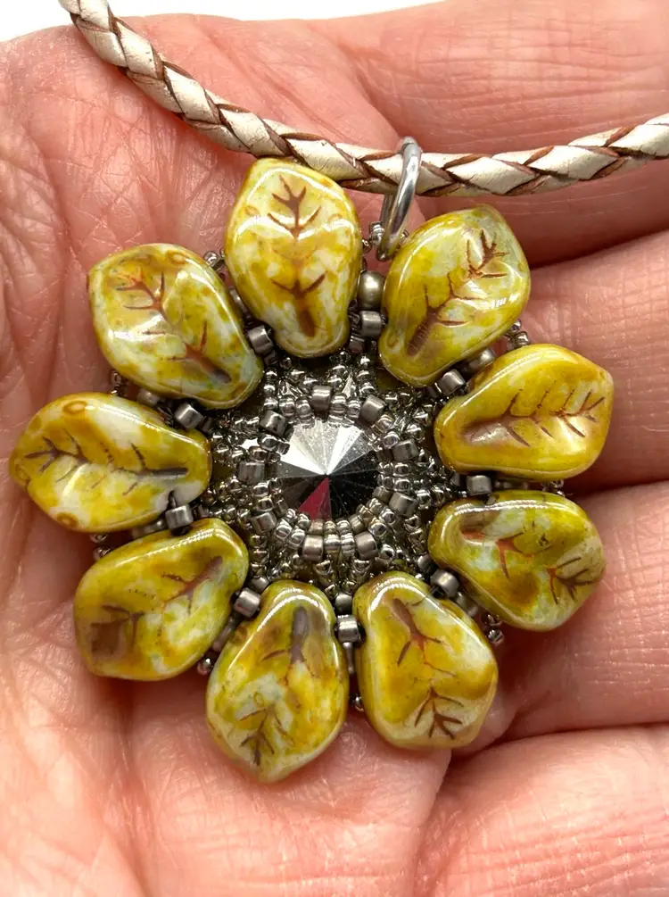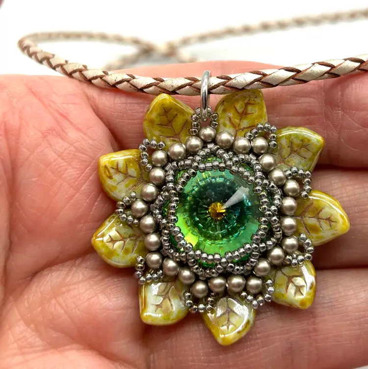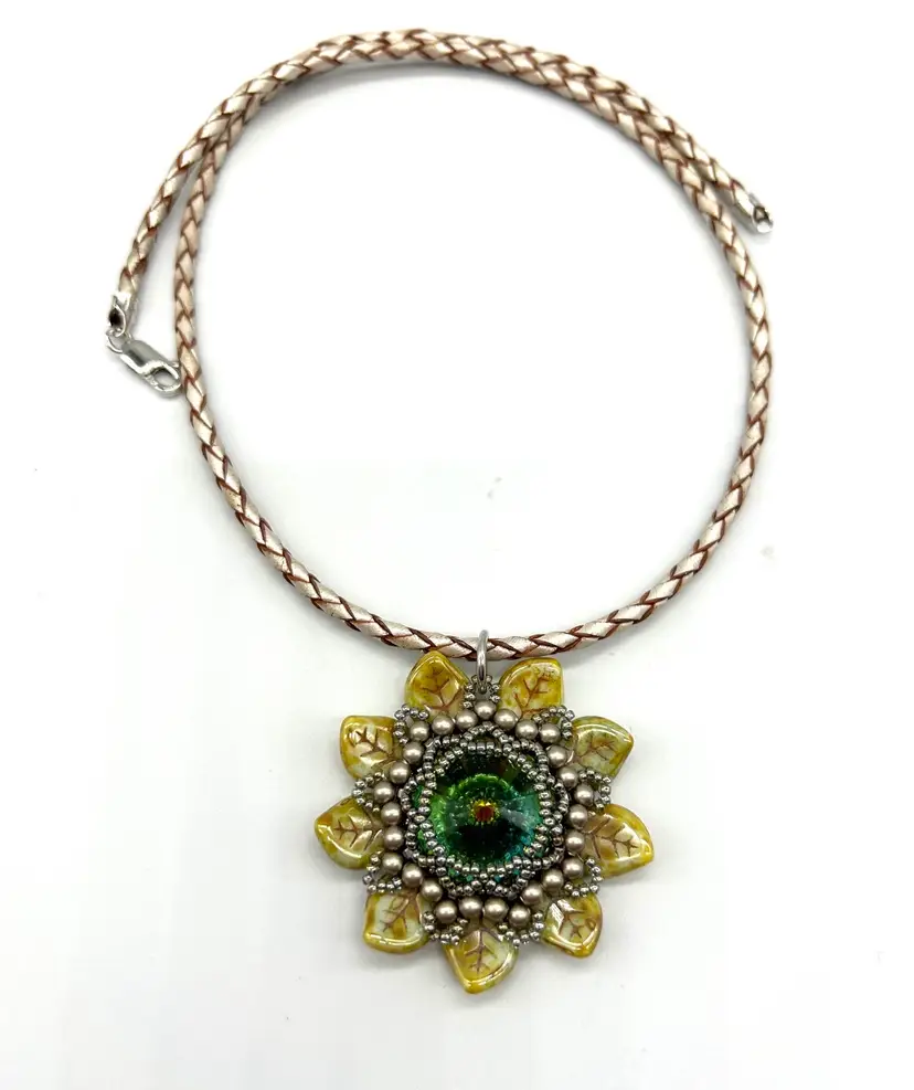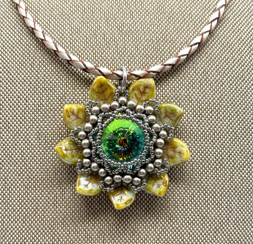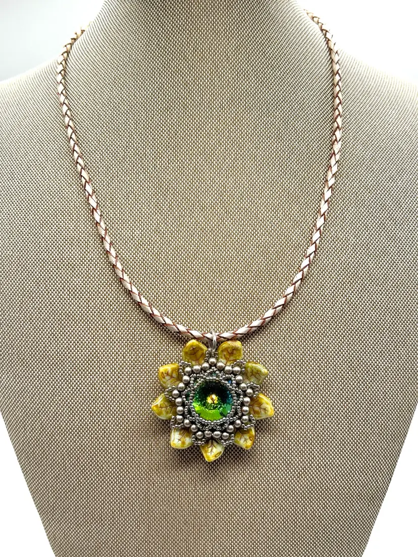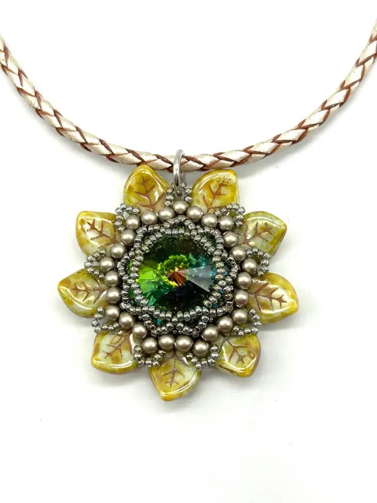 Beautiful hand beaded Swarovski Rivoli sunflower necklace Cord is a champagne braided leather cord with a sterling silver lobster clasp Cord measures 16” long Flower measures 1.75” in diameter Light weight and easy to wear!
