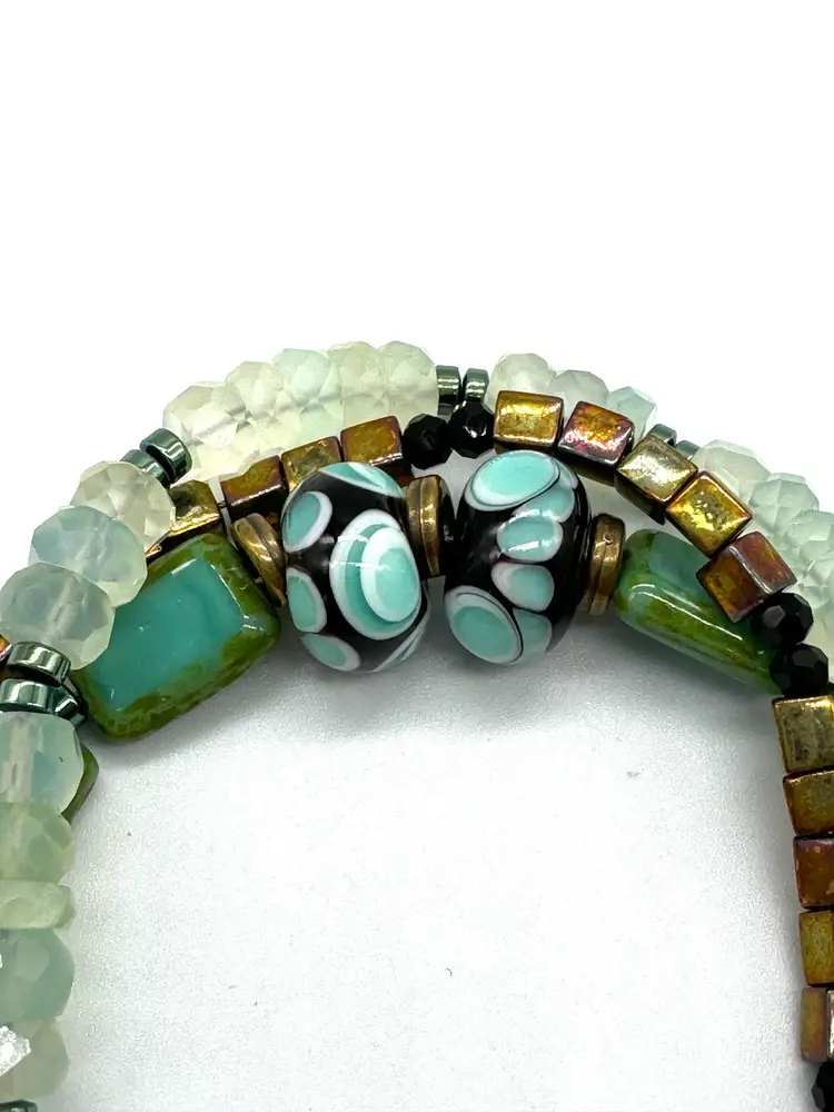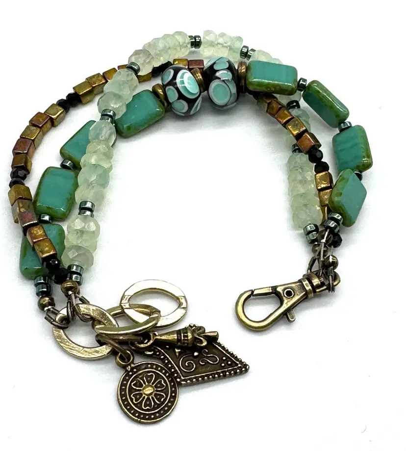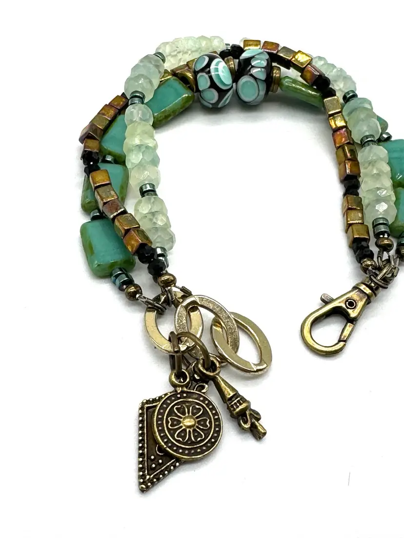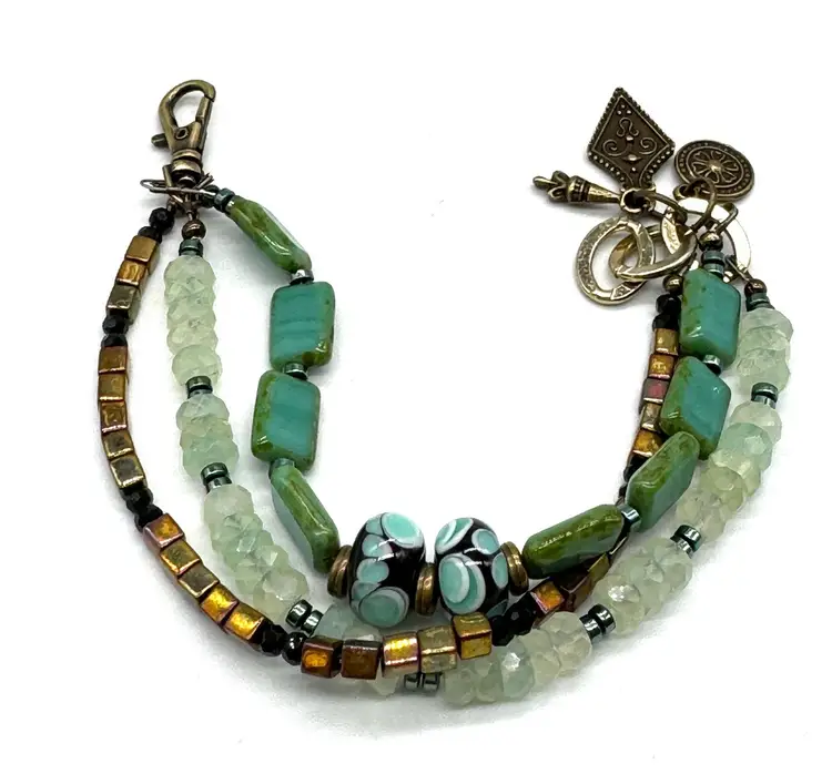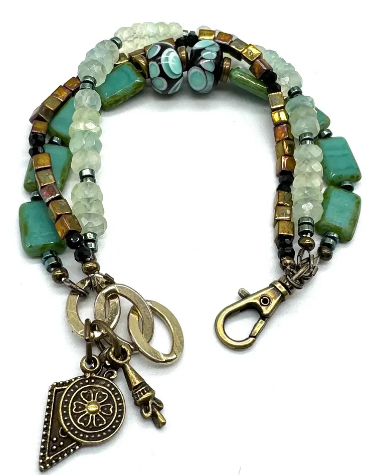 Hand made by me in my Seattle studio, this amazing bracelet is sure to get you noticed. Natural Chalcedony beads combined with Czech glass beads, this bracelet will fit 6.5” 7.25” up to 8” there are three different loops For the clasp. The charms dangling from the bracelet are an antique bronze in color.