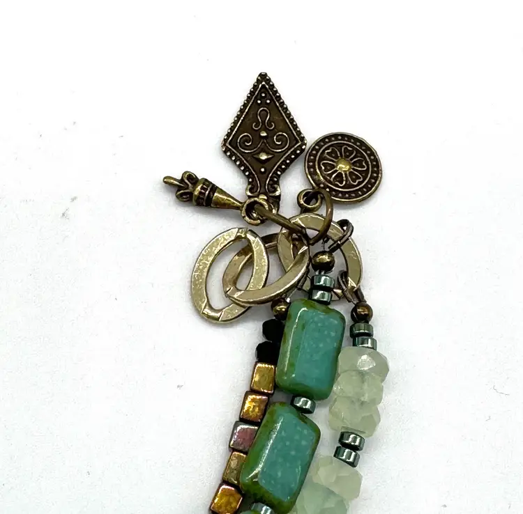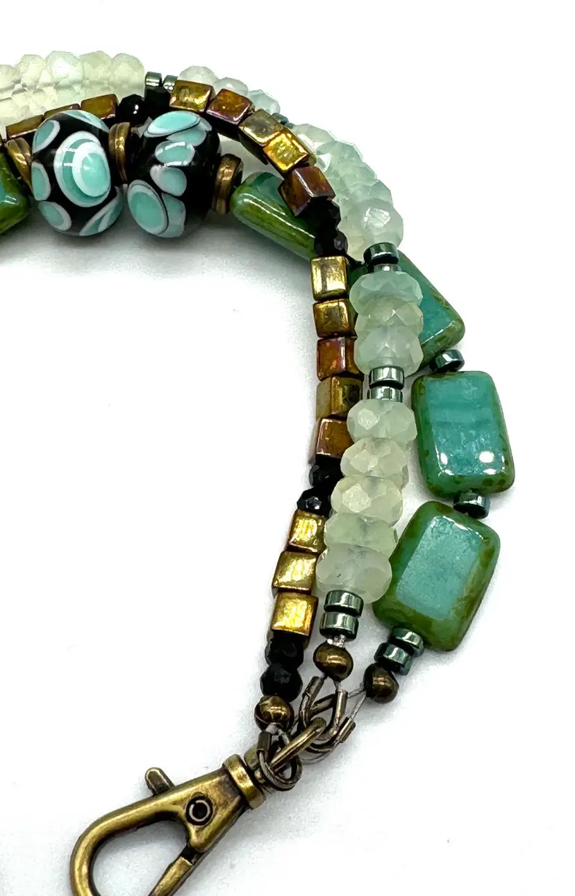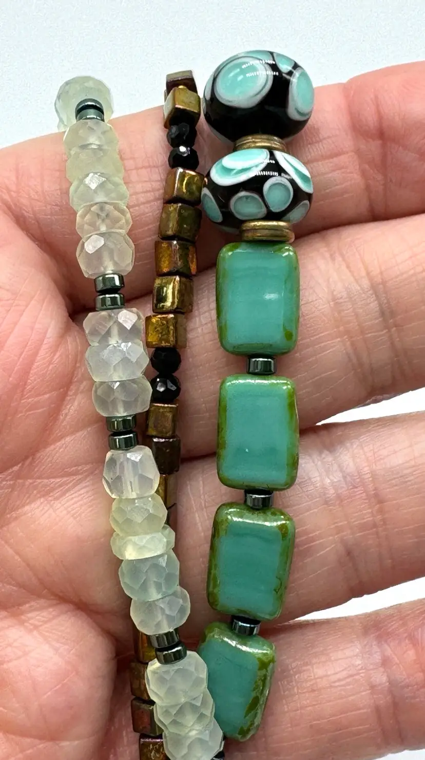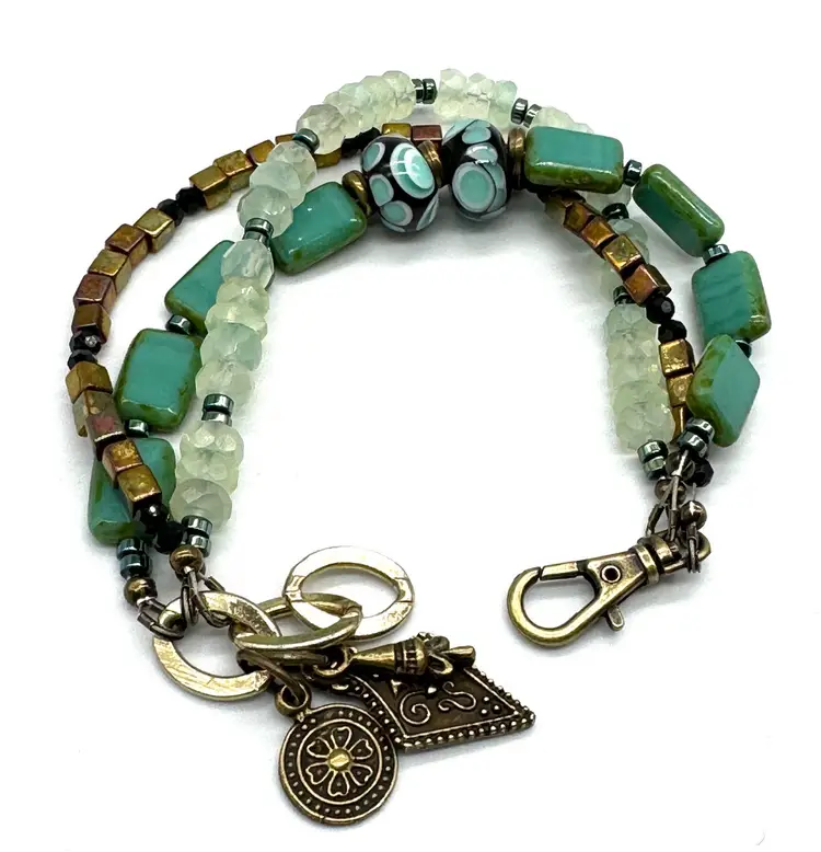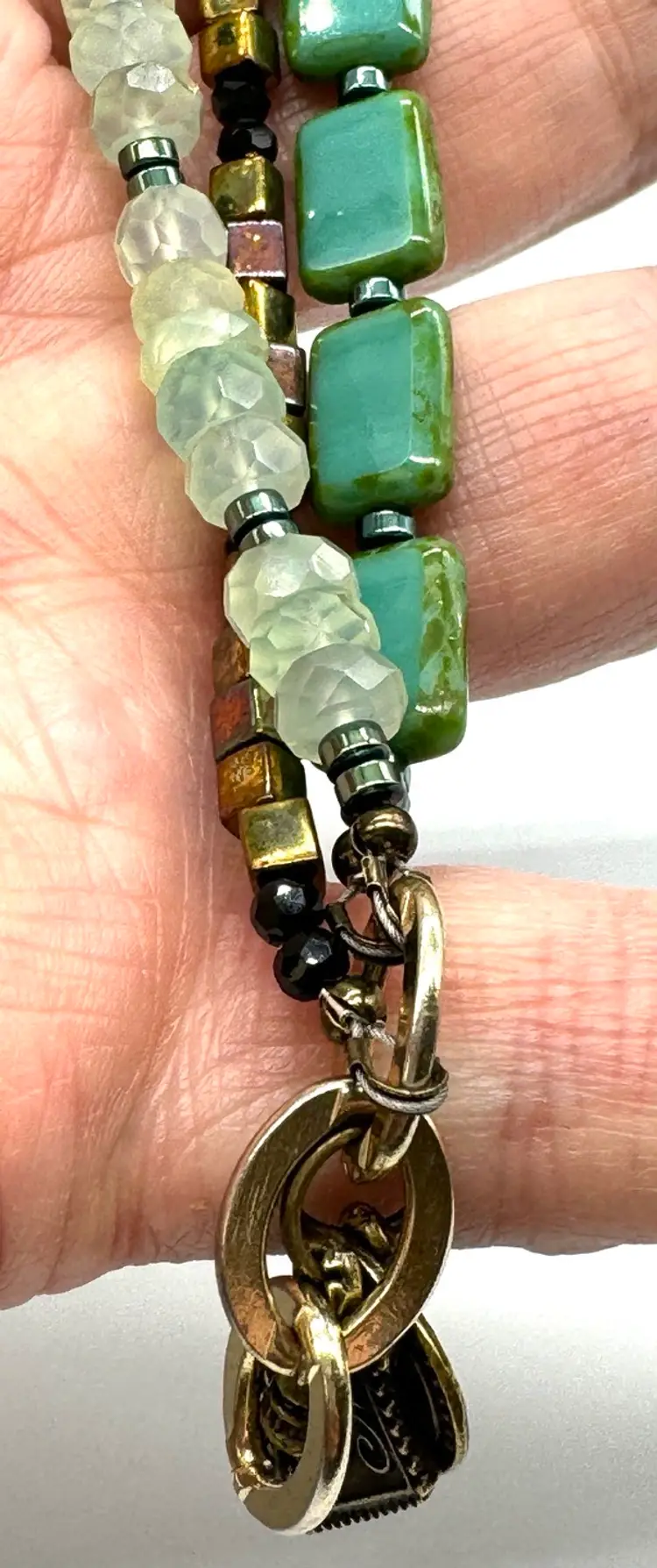Hand made by me in my Seattle studio, this amazing bracelet is sure to get you noticed. Natural Chalcedony beads combined with Czech glass beads, this bracelet will fit 6.5” 7.25” up to 8” there are three different loops For the clasp. The charms dangling from the bracelet are an antique bronze in color.
