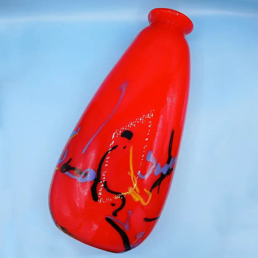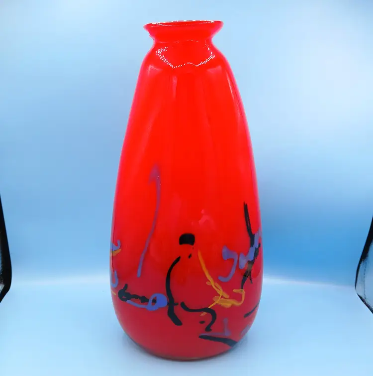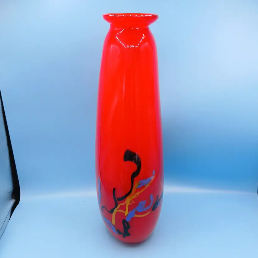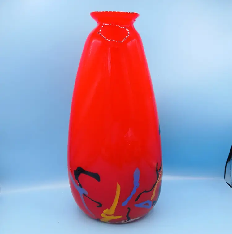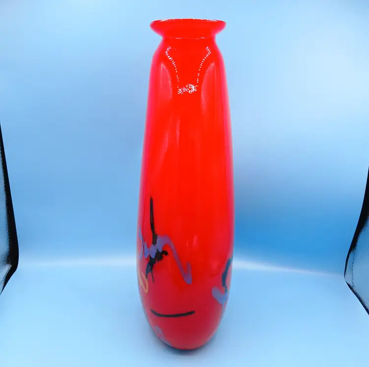 I picked up this particular vase because I love the abstract art on the front of it that looks like a person sitting in the space. The colors are extremely vibrant and the yellow, black and blue accents are captivating. The vase has an irregular rim that looks like a manufacturing defect (pictured). It doesn't interfere with display at all. It measures 14" high and 7" across at the widest part. This vase is not signed and the country of origin is uncertain. It's definitely a statement piece that will grab attention anywhere it lives. Thanks for looking!