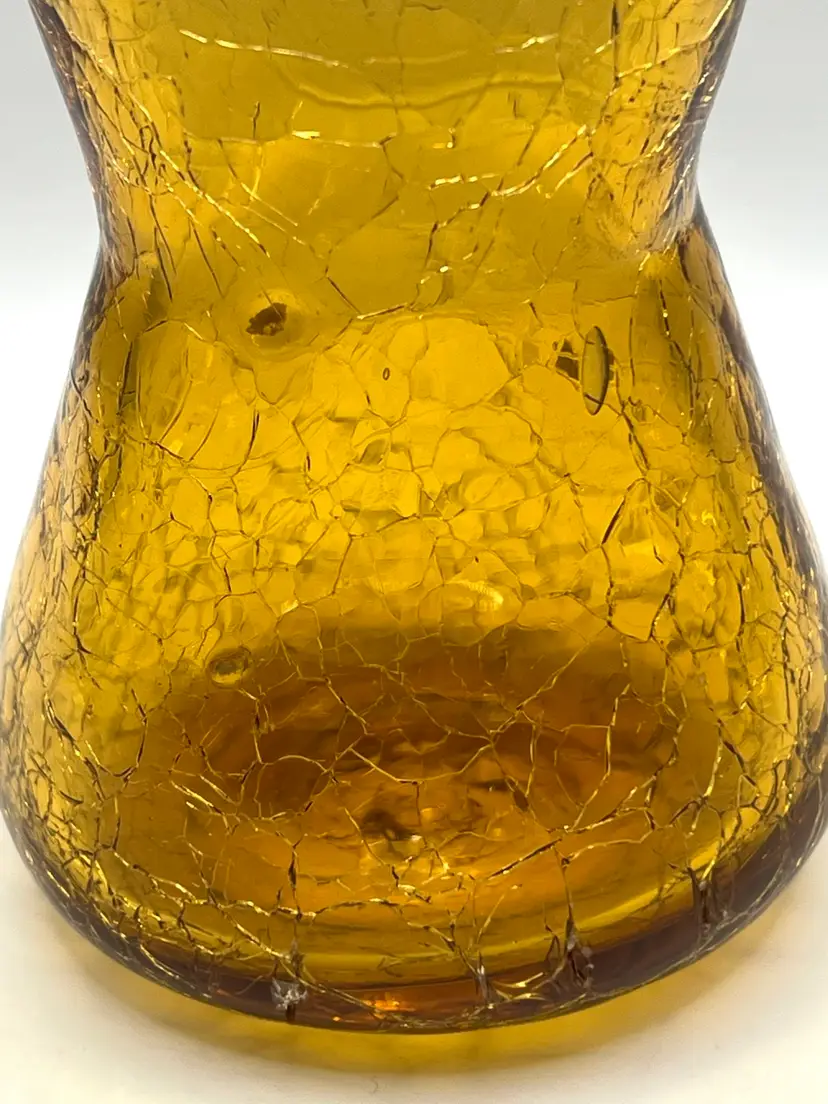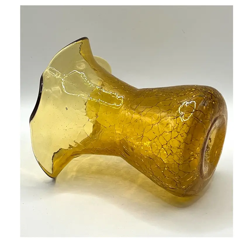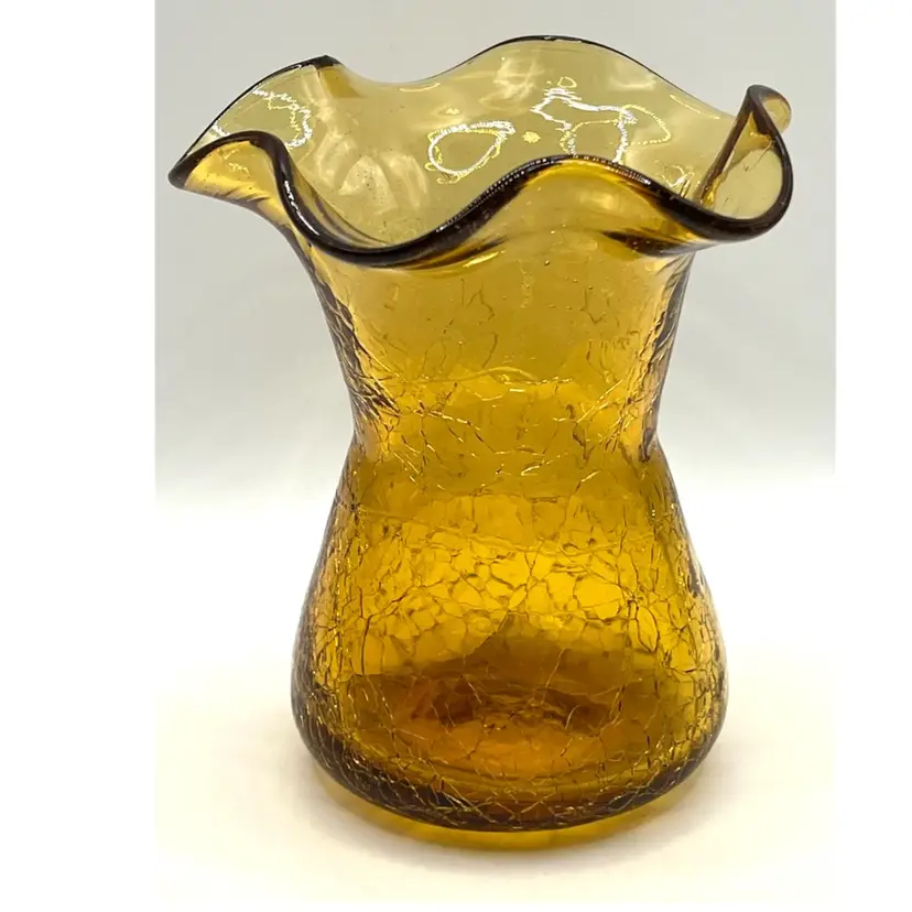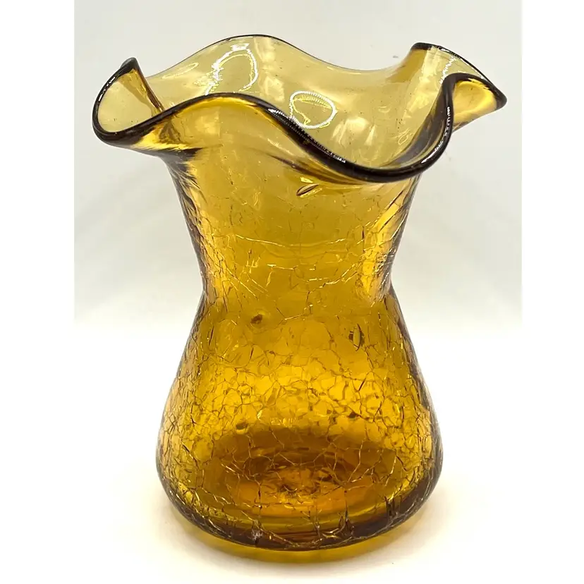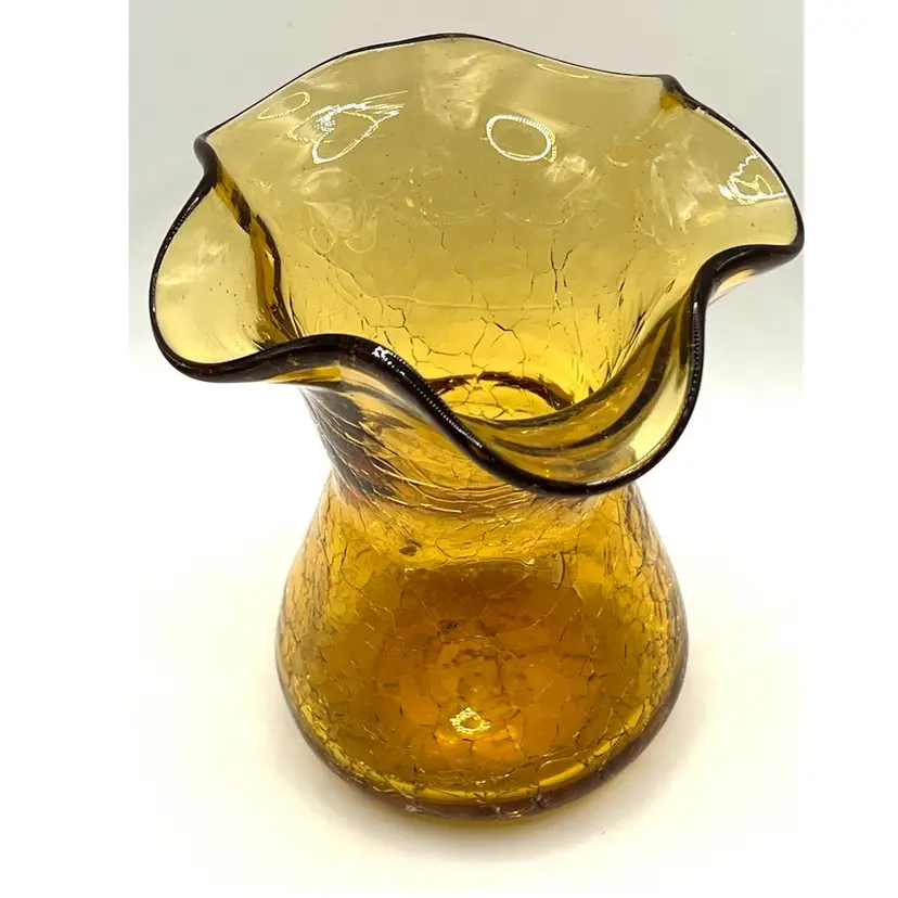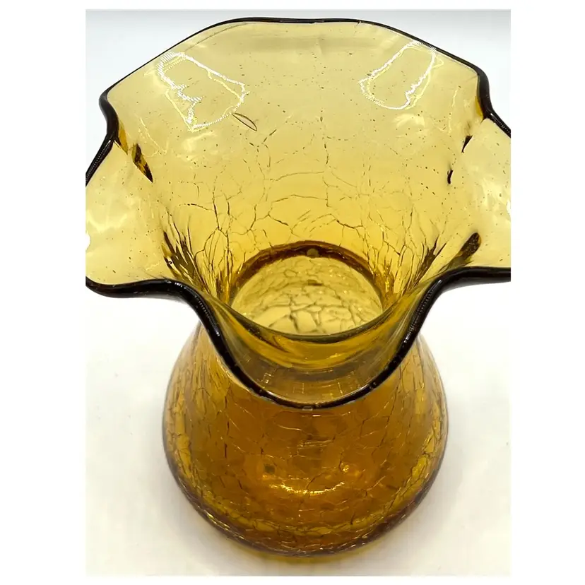 Hand Blown Amber Crackle Glass Ruffled Edges Fluted Rim Vase 4.8 in Height, 4 in Length. No chips