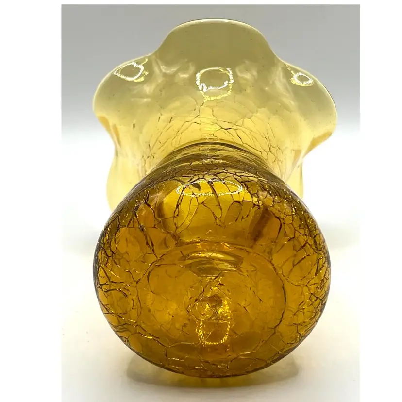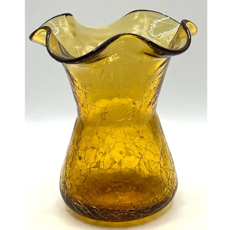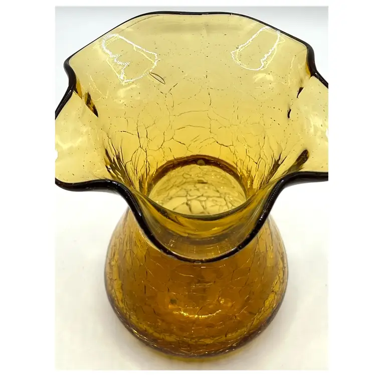 Hand Blown Amber Crackle Glass Ruffled Edges Fluted Rim Vase 4.8 in Height