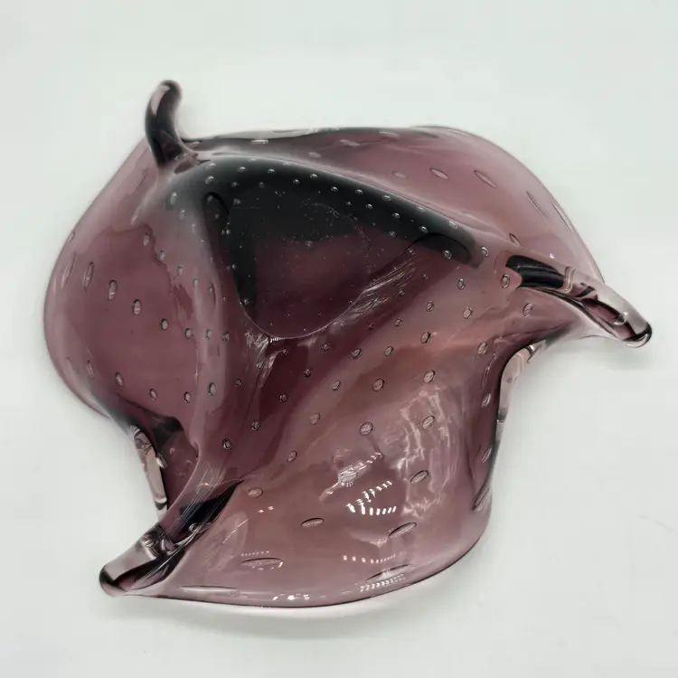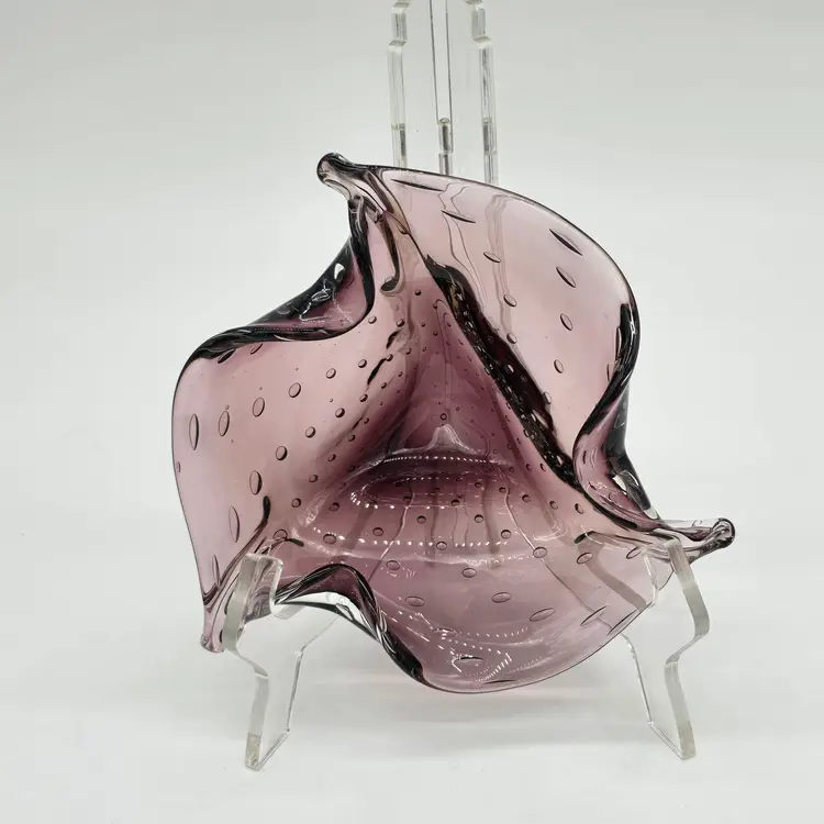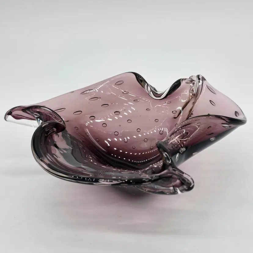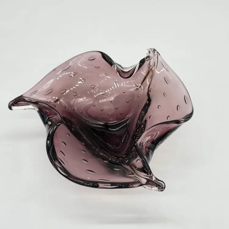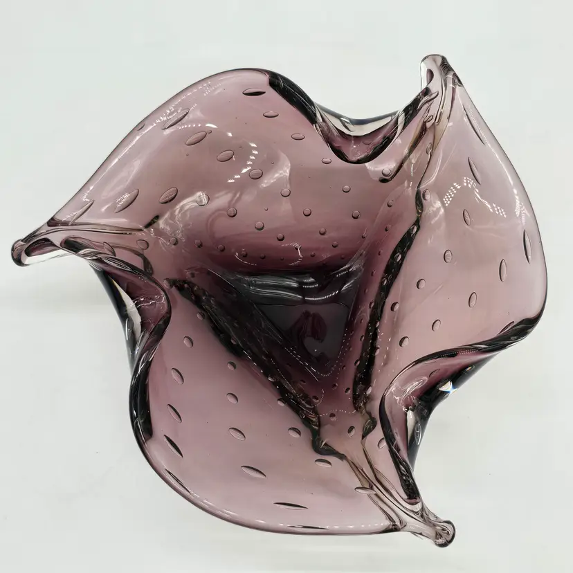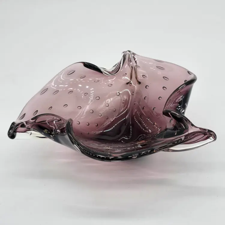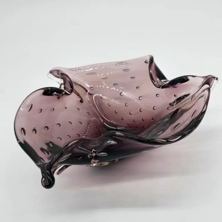 Hand Blown Amethyst Purple Bullicante Folded Art Glass Bowl Polished Bottom