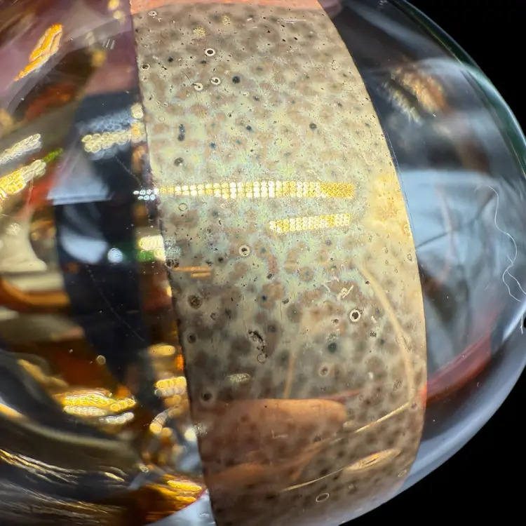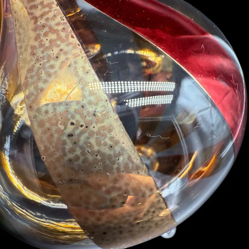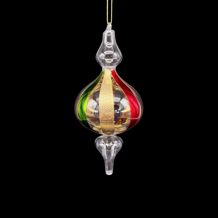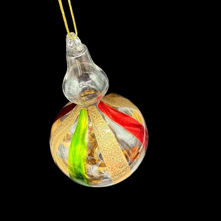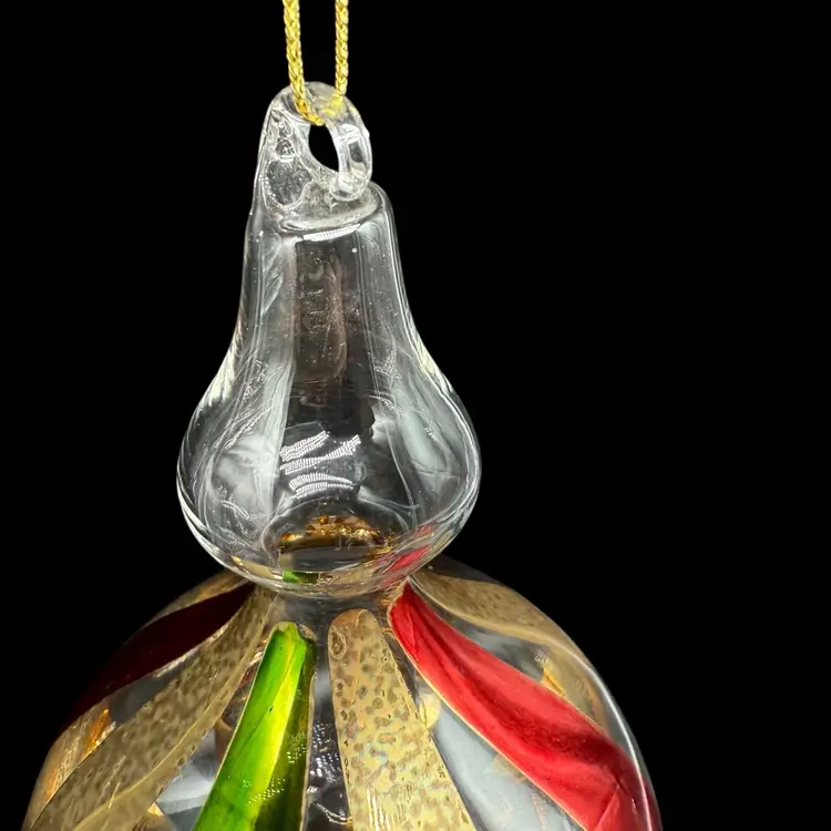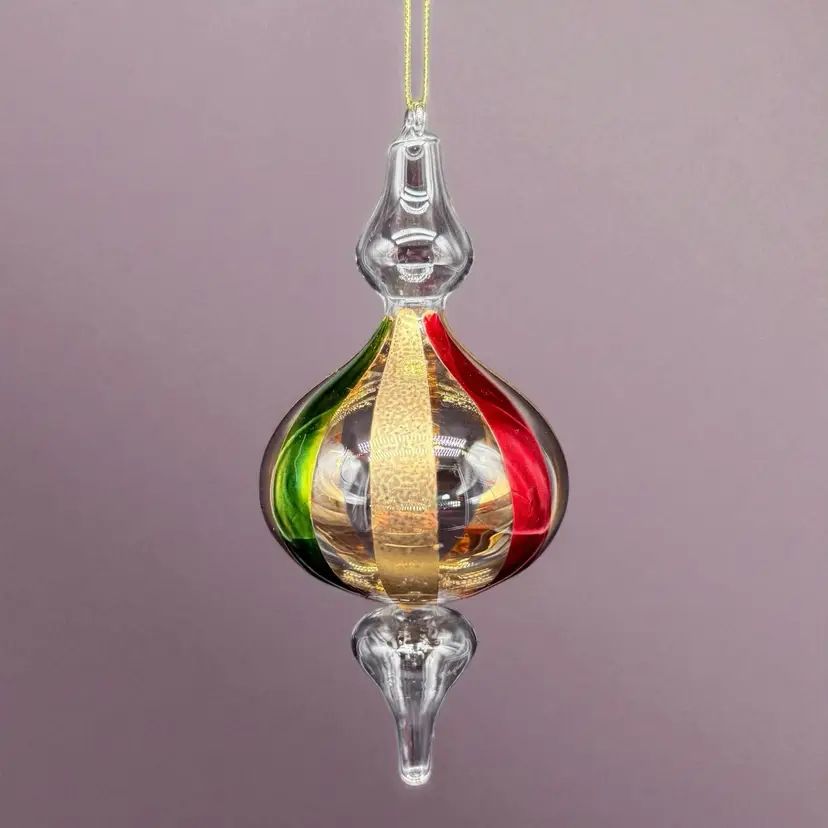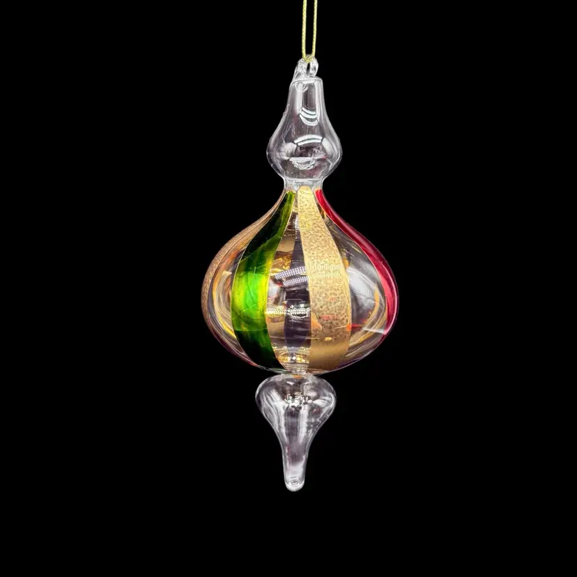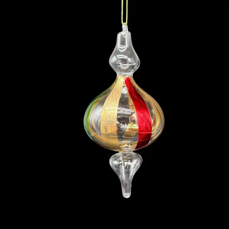 This hand-blown art glass finial holiday Christmas ornament is a unique and colorful addition to any festive decor. The ornament features a striped pattern in red, green, and gold, adding a contemporary touch to your holiday celebrations. Handcrafted with a production technique of hand-blown glass, this vintage piece is sure to bring a touch of magic to your Christmas tree. Perfect for collectors or those looking for a one-of-a-kind ornament to add to their holiday collection, this ornament is a charming and decorative choice for any season.