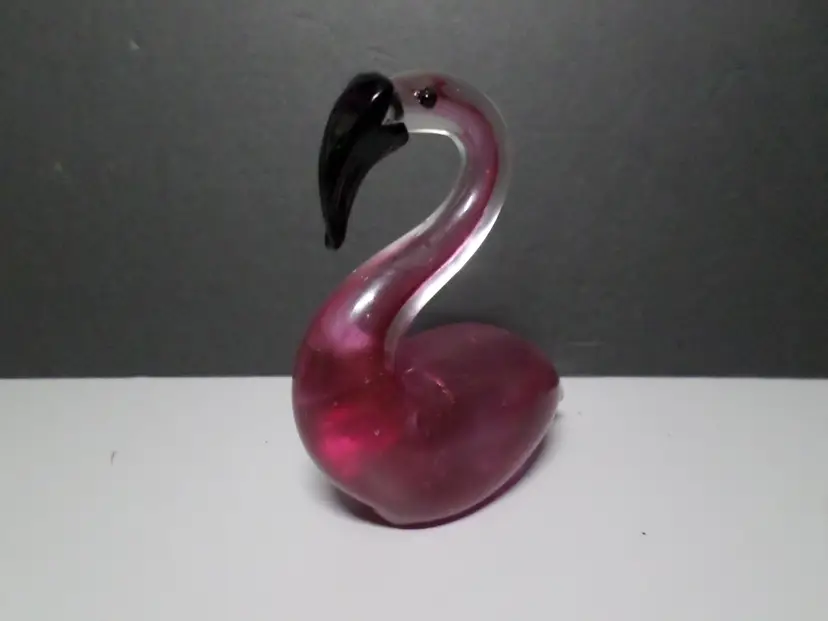 Add a touch of tropical elegance to your home with this beautiful hand-blown art glass flamingo figurine. The graceful curves of the flamingo's neck and body are crafted from stunning pink and clear swirled glass, creating a lovely translucent effect. Its beak is a contrasting black, adding a realistic detail.