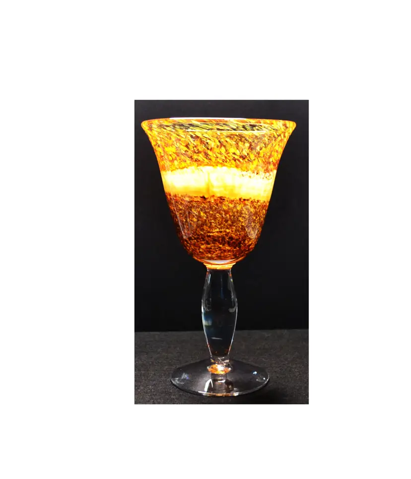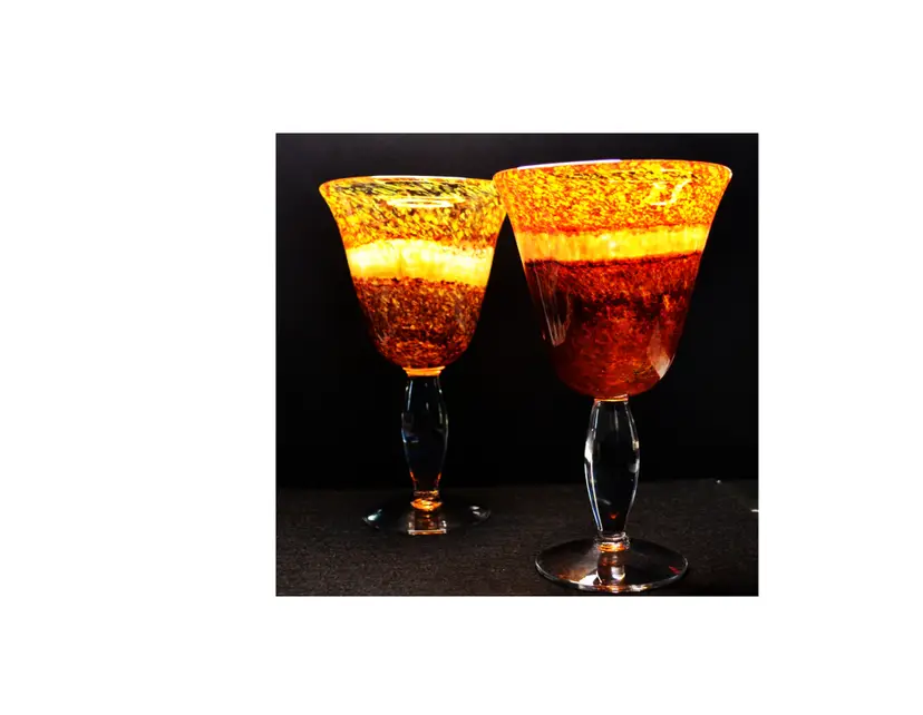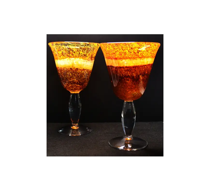 Add a burst of color and craftsmanship to your dining table with this stunning pair of hand-blown art glass goblets. Each goblet glows with molten hues of orange, red, and golden yellow—reminiscent of firelight and autumn sunsets.