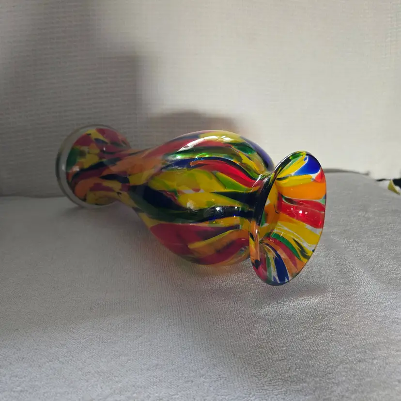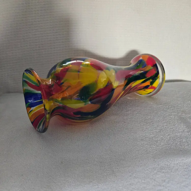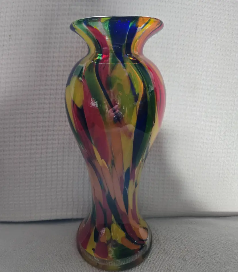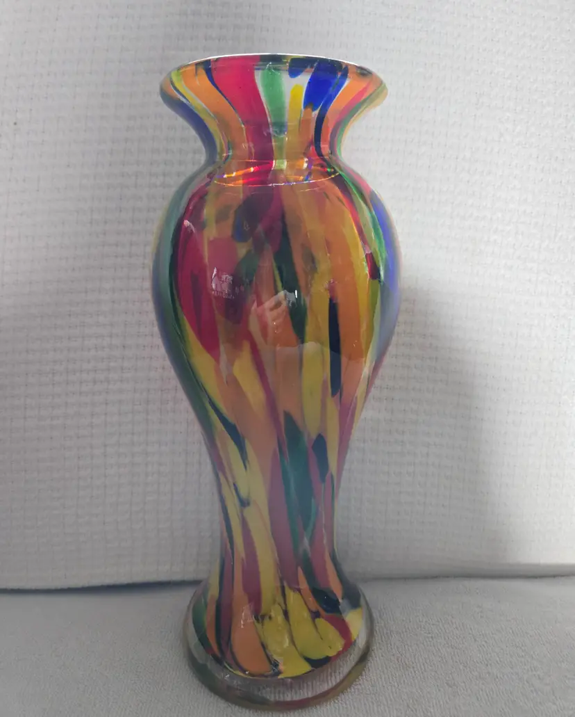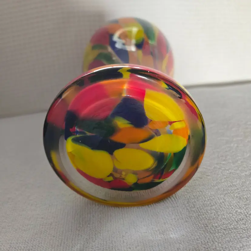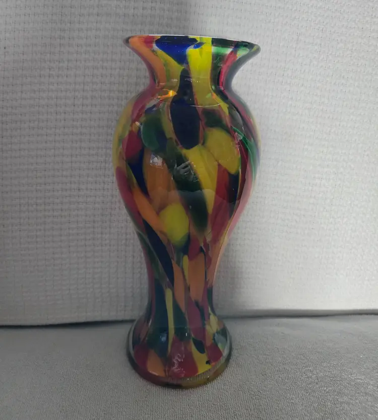 Featuring a multi-colored or splatter design. Often referred to as "End Of Day" or confetti glass. Measures 10 1/4" tall, 3 1/2" opening and 3 1/4" across bottom. In perfect condition. No chips, cracks, or repairs. Absolutely stunning.
