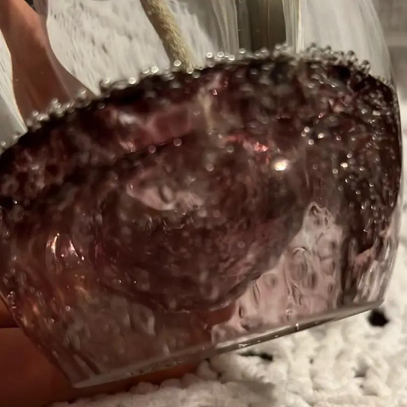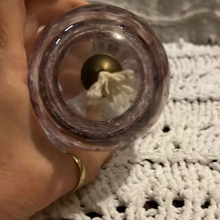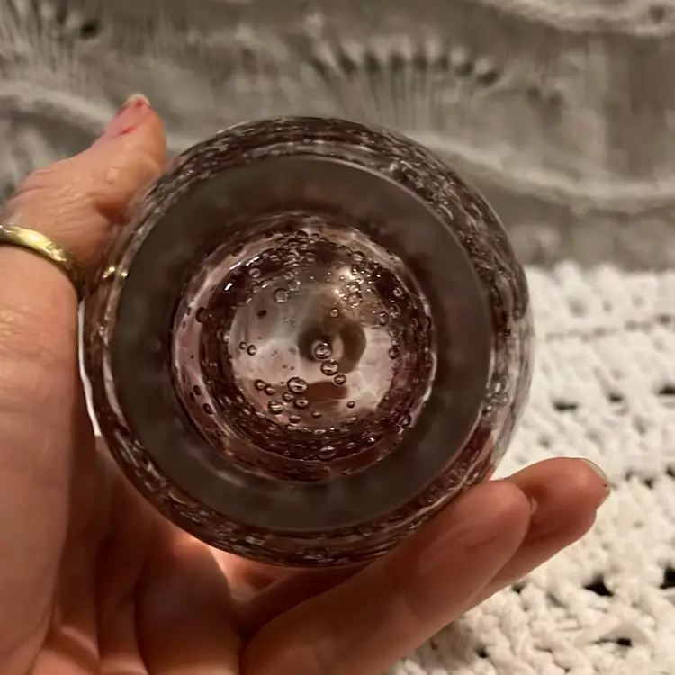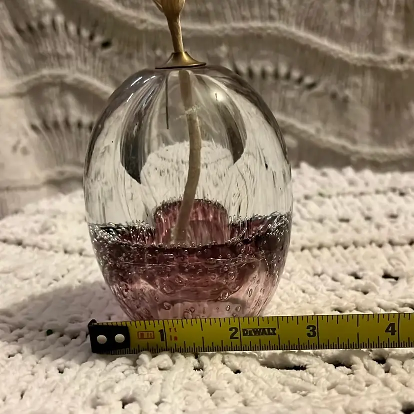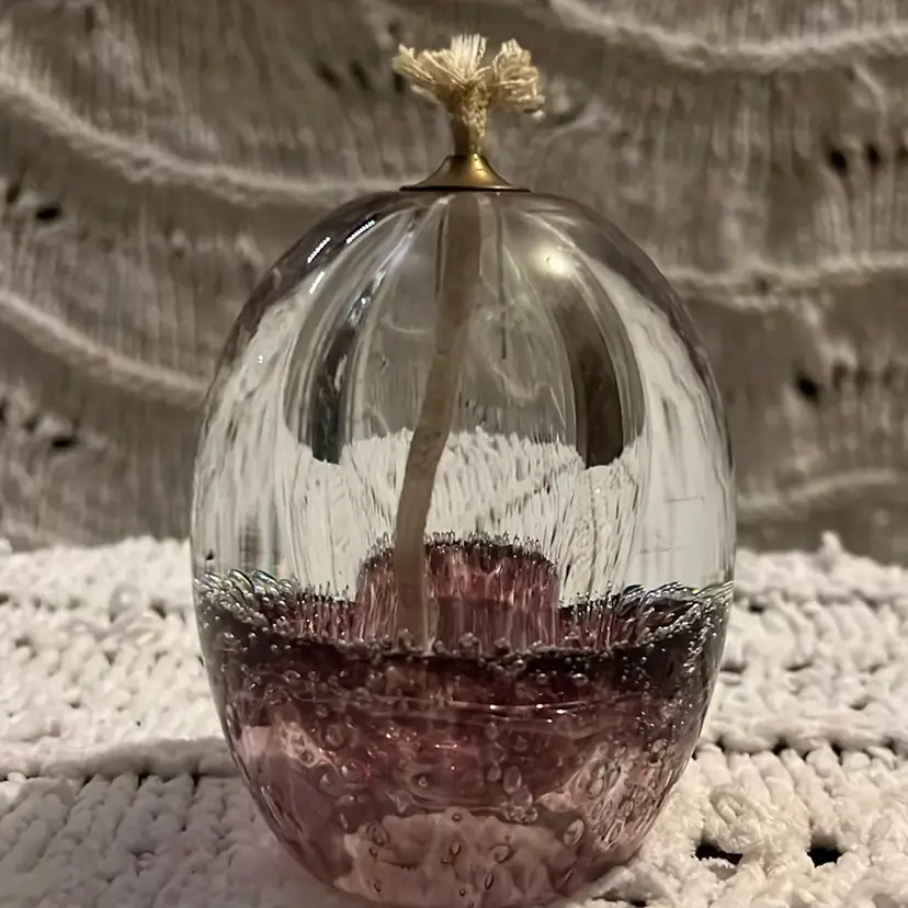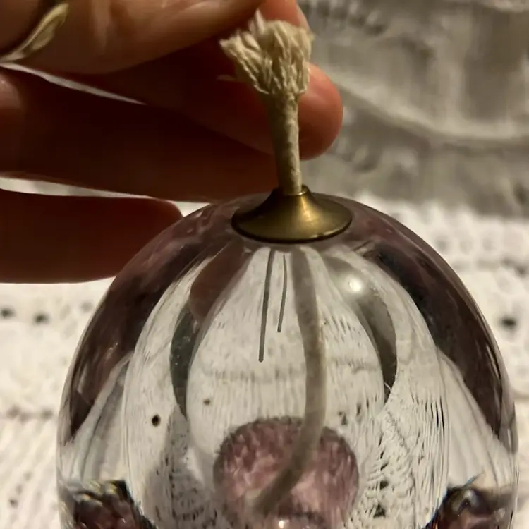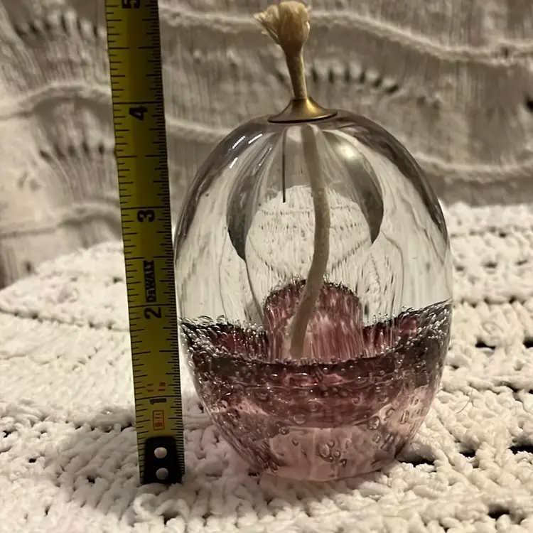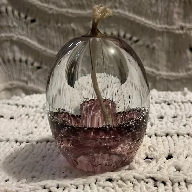 This is a hand blown art glass oil lamp. The bottom color is purple with a clear top. The lamp is made of borosilicate glass, which adds to its durability. The wick is made of fiberglass and is designed to not burn up. The design often features a bubble effect within the glass, which is created by skilled artisans. This piece weighs 1 lbs. 6 oz. it’s about 4 inches tall, not counting the wick and 3 inches wide. These lamps are functional art pieces that can also be used as paperweights or vases.