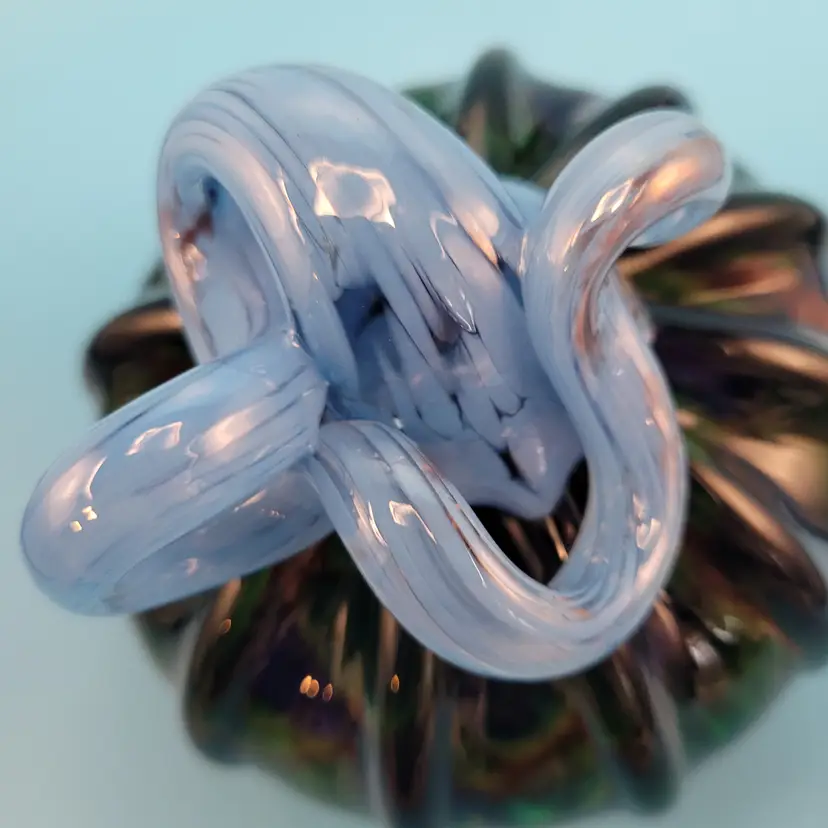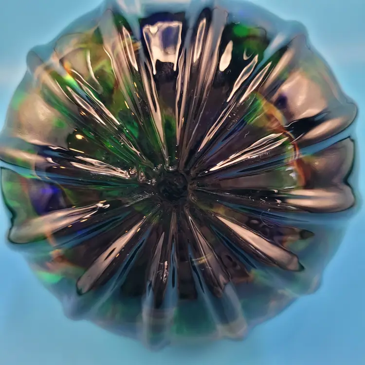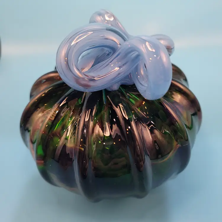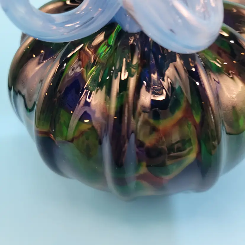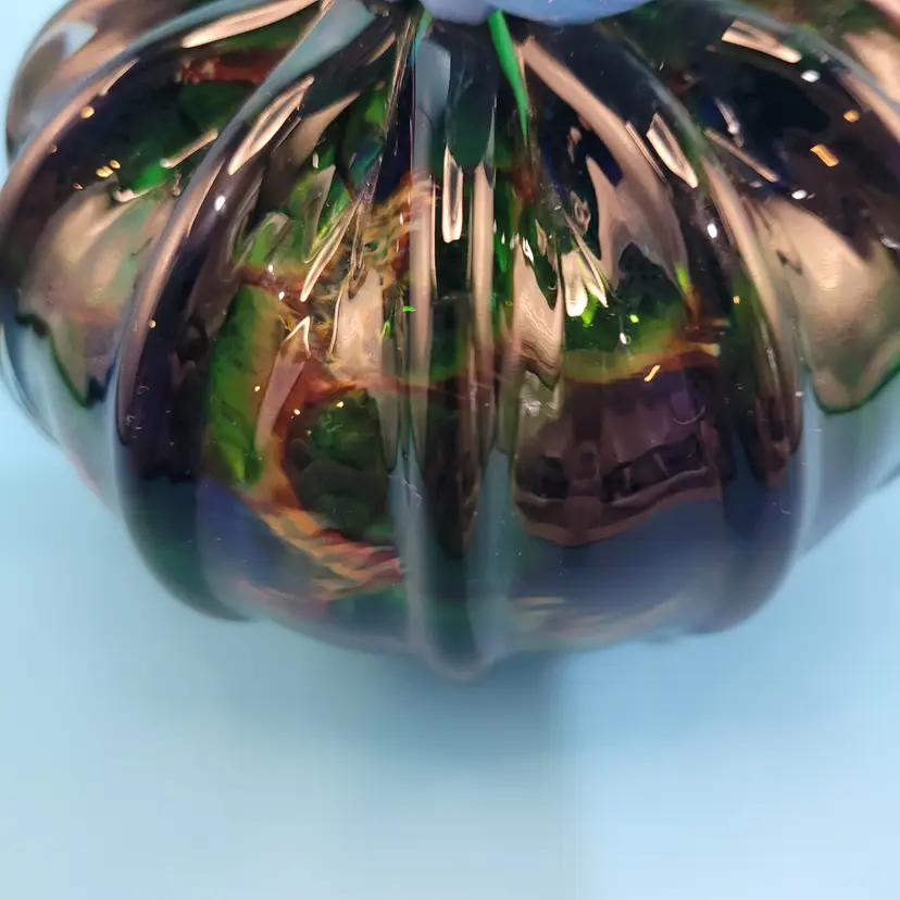 Hand Blown Art Glass Pumpkin Dark Green Body Iridescent Acents Blue Stem