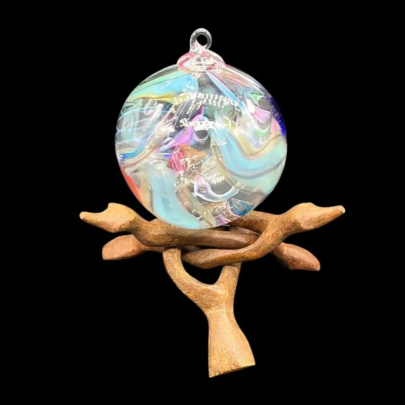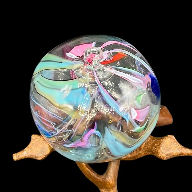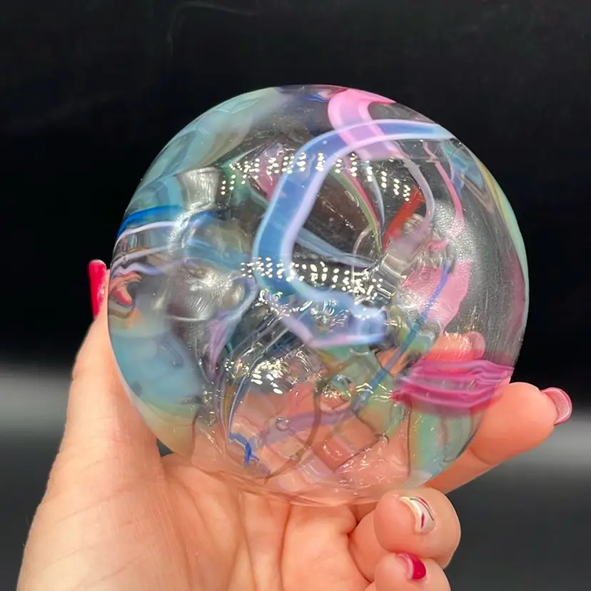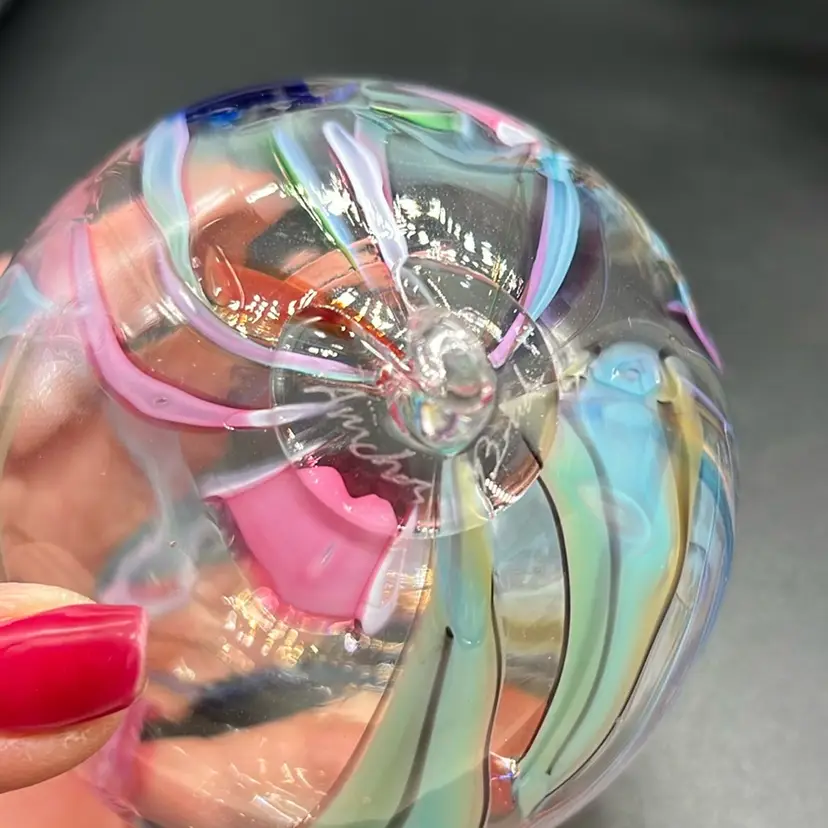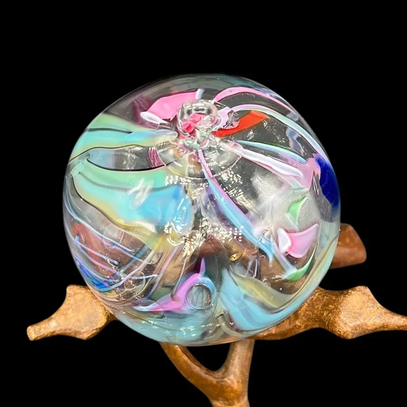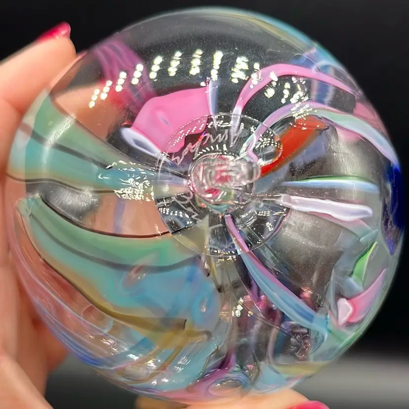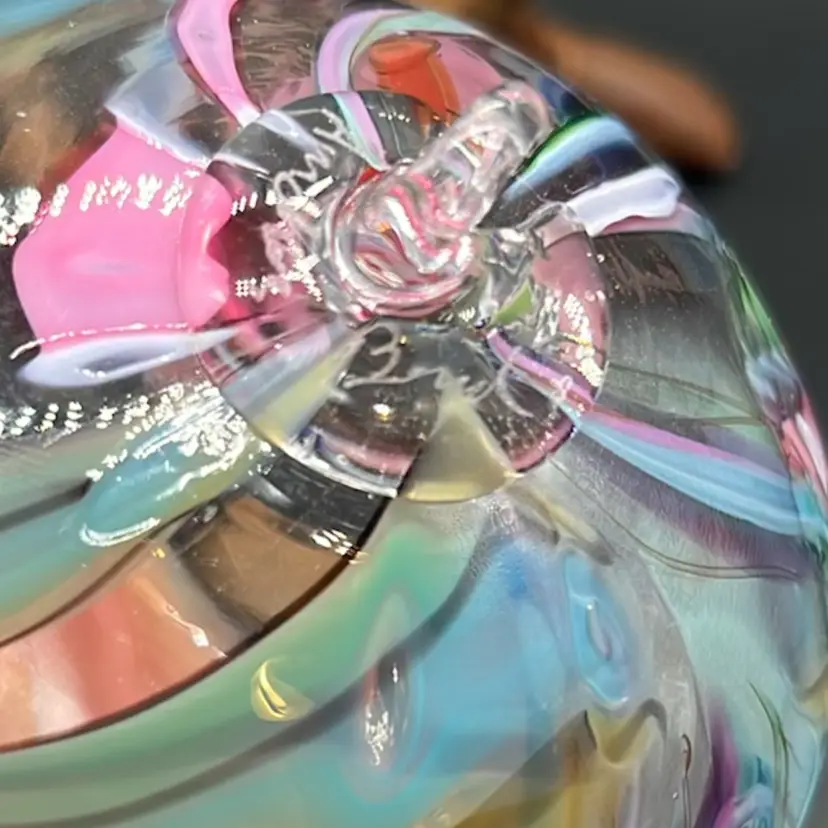 Stunning piece! Rainbow colors swirled within. No chips or cracks. Artist signed. (*stand is not included) Approx: 3”