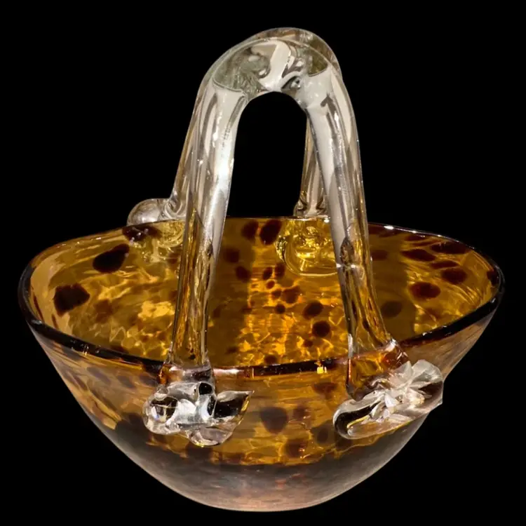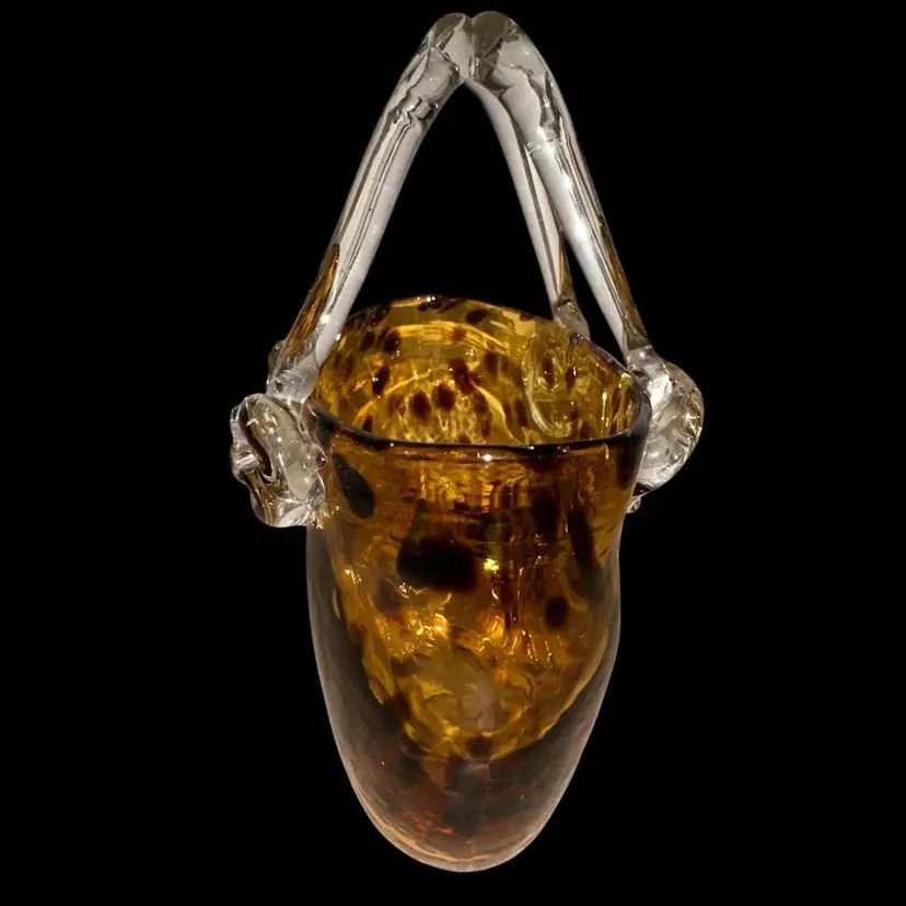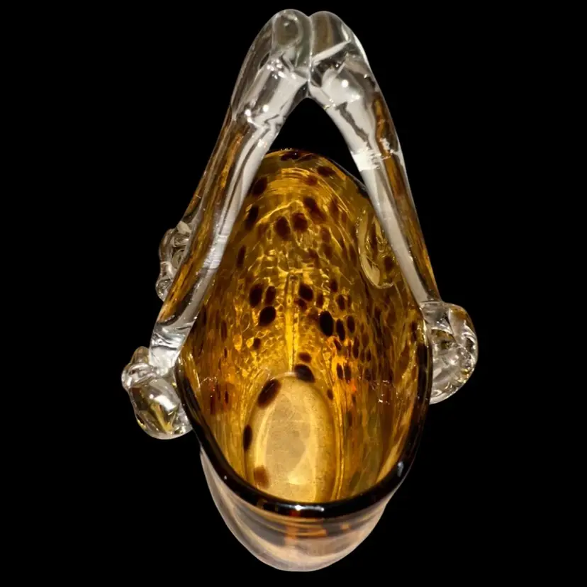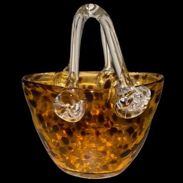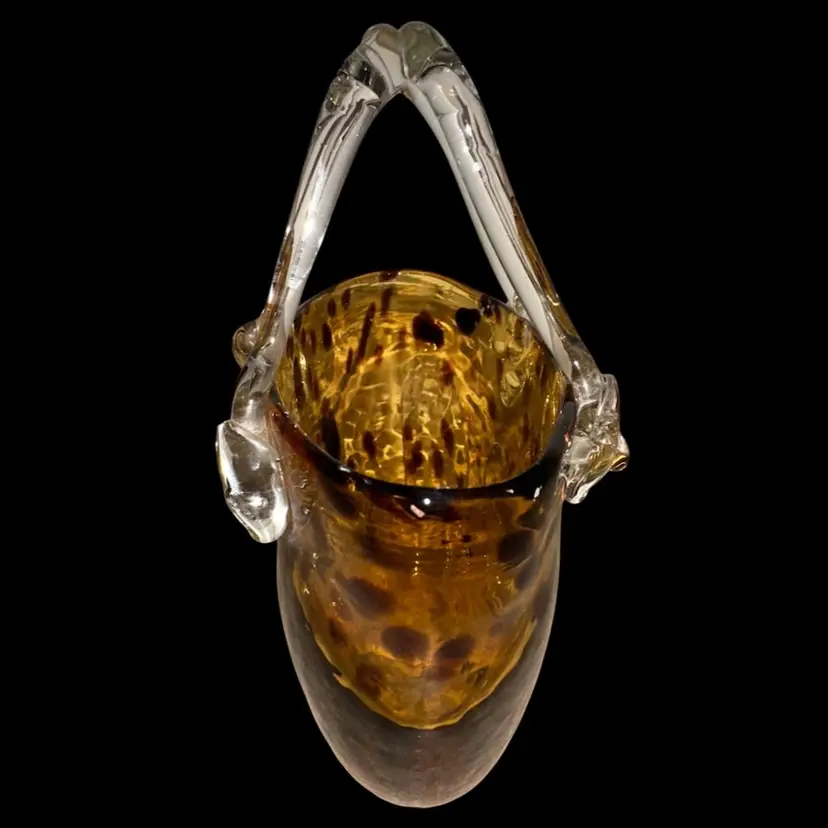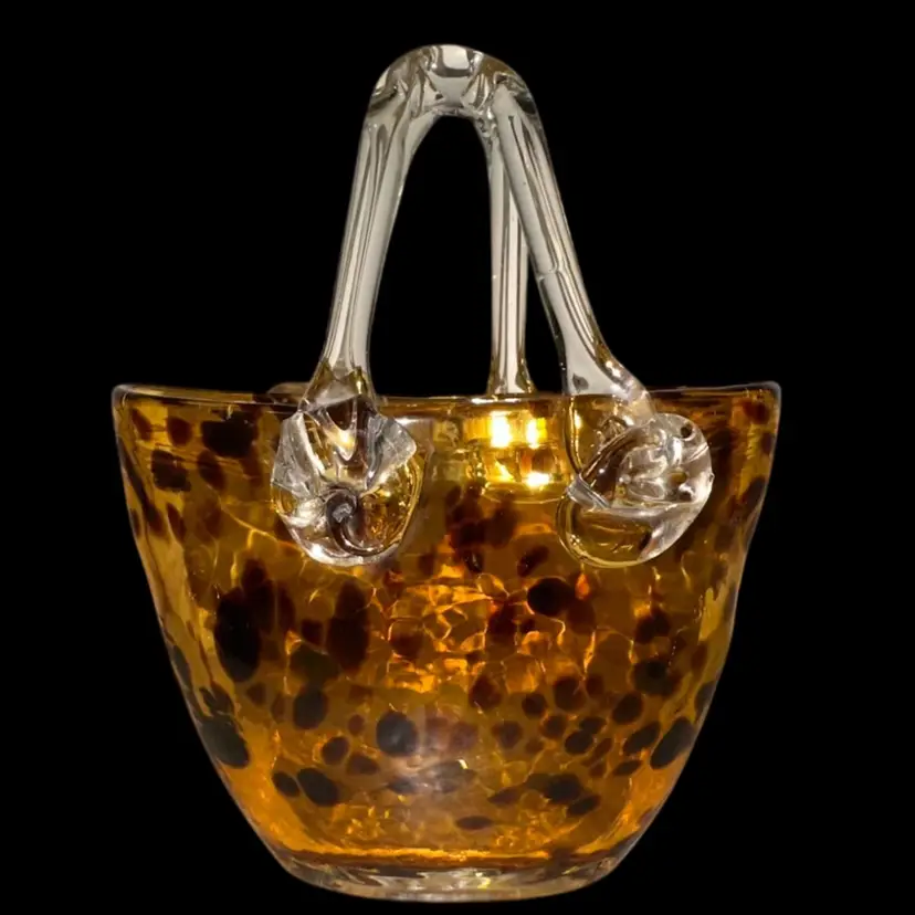 Wow! Hand Blown Art Glass Small Purse Handbag Vase Planter Leopard Print Applied clear handle Clear, amber & brown No issues at all 6 3/4 inches tall, 5 1/2 inches wide, 3 1/2 inches deep