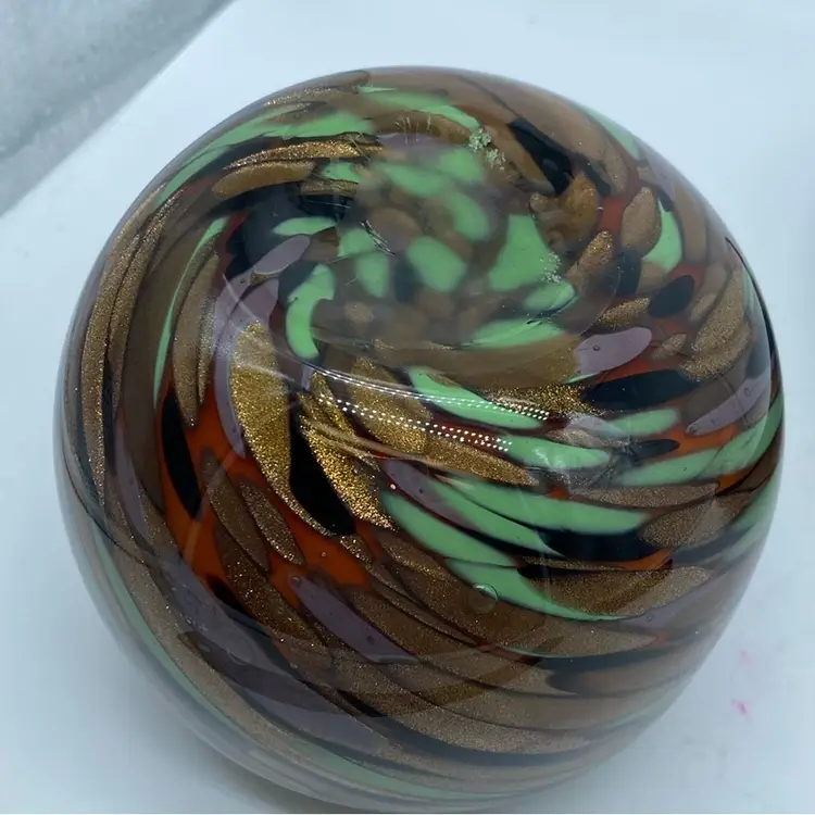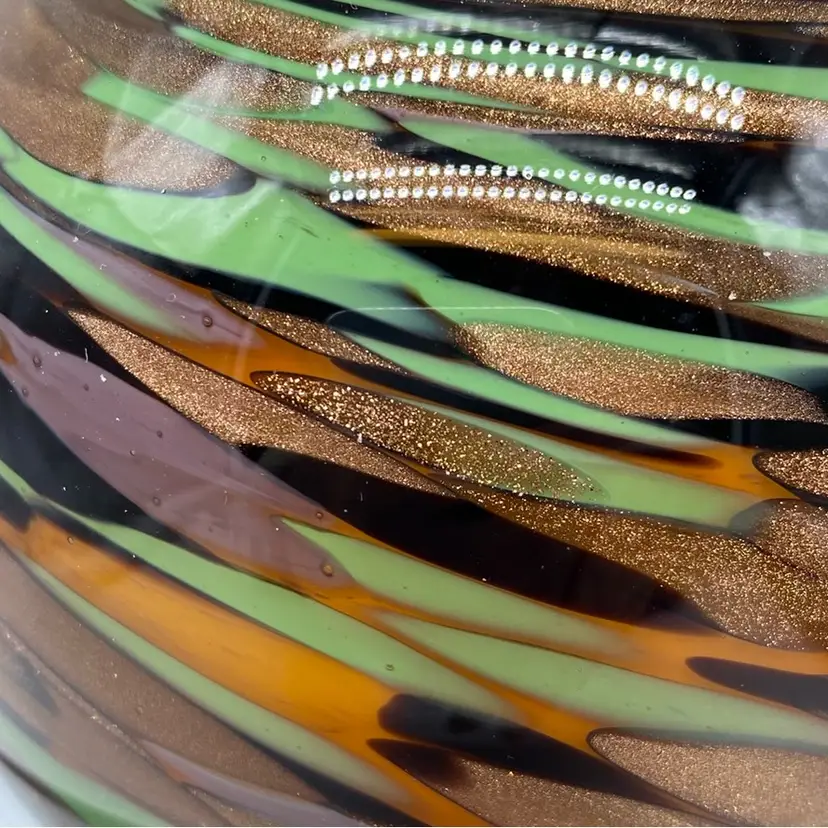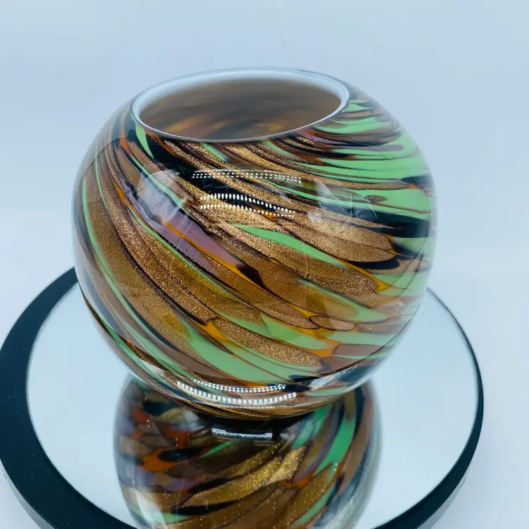 Hand-blown glass is a traditional glassmaking technique where molten glass is inflated into a bubble using a blowpipe. This allows the artist to create organic shapes and intricate designs. The addition of metallic oxides, such as copper, can create glittery effects in the glass.