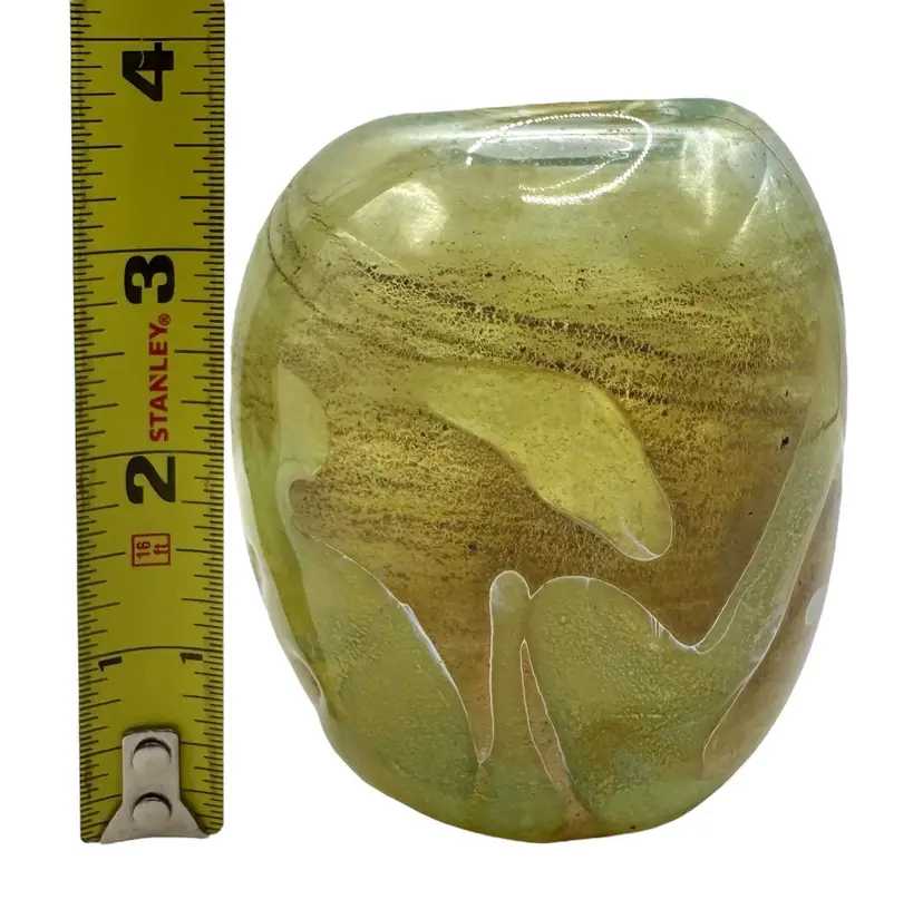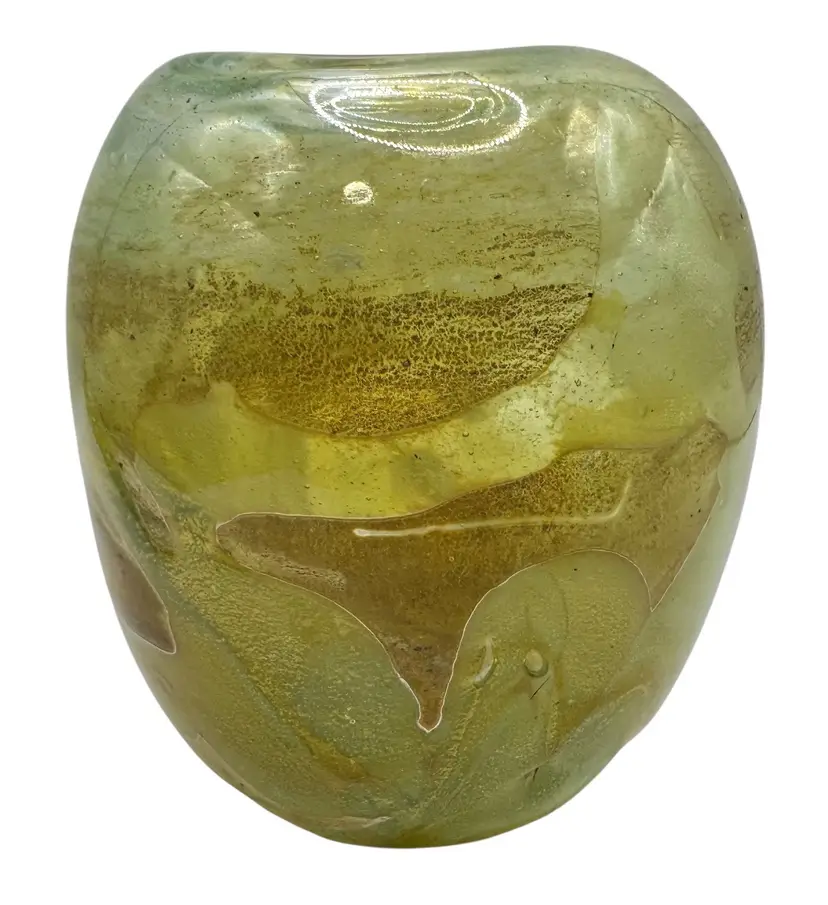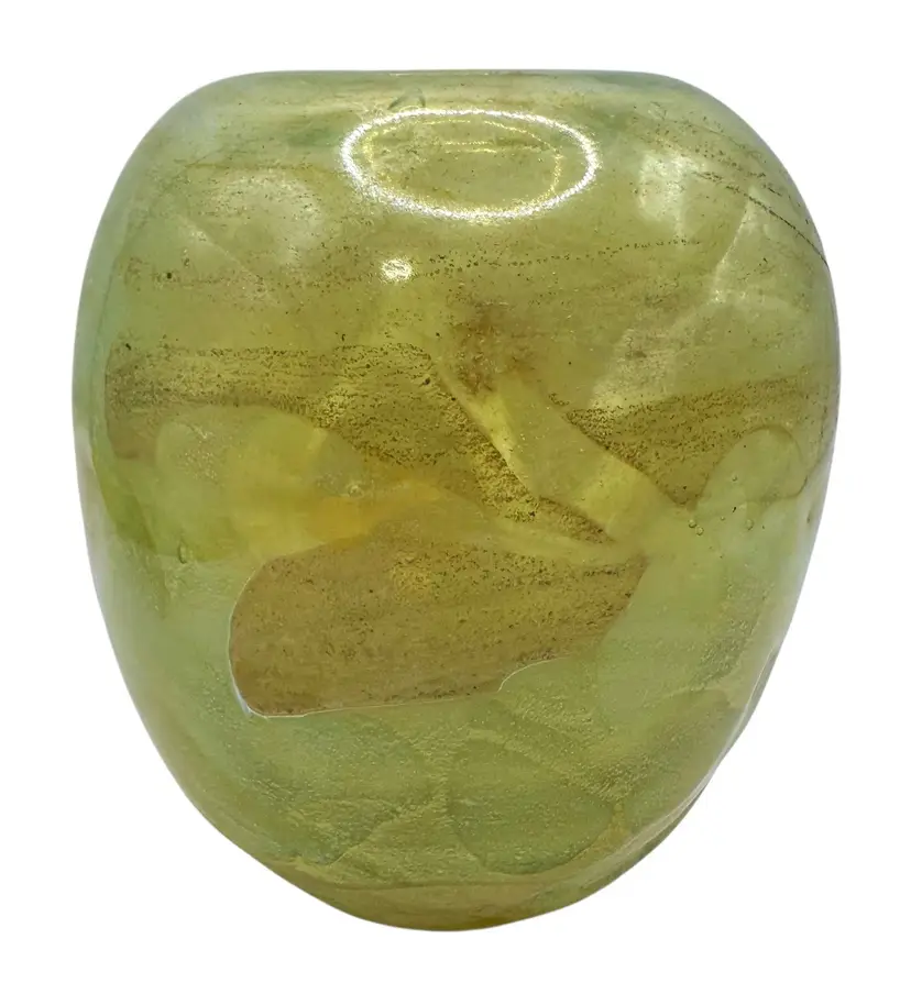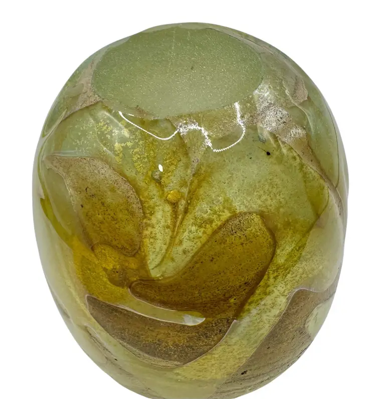 Hand blown glass vase with an algae-like appearance. It has a ground bottom.