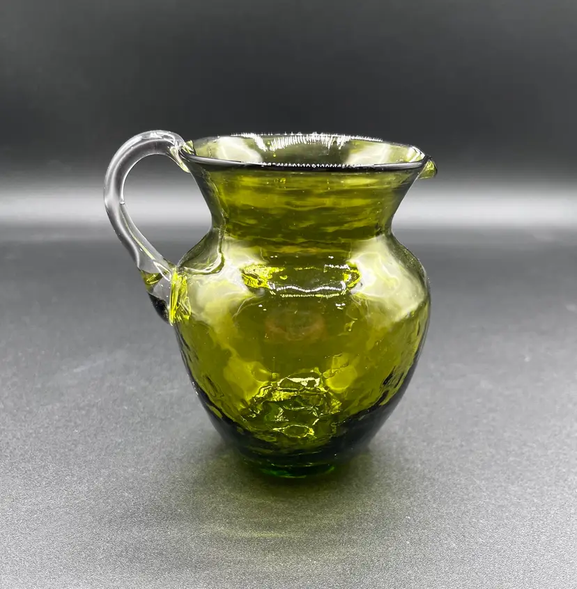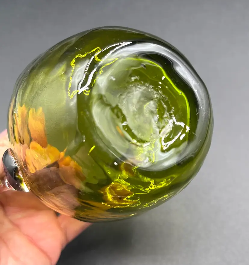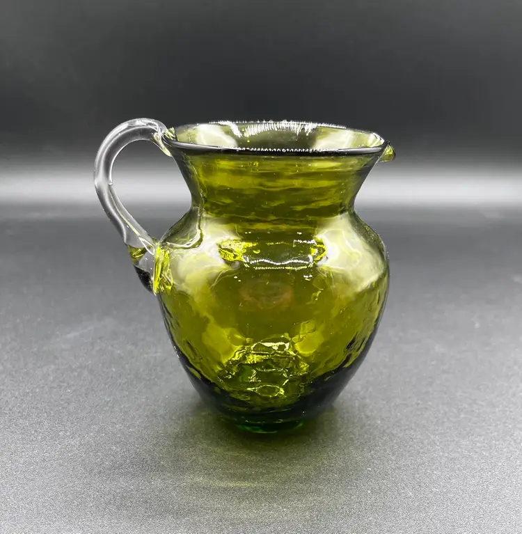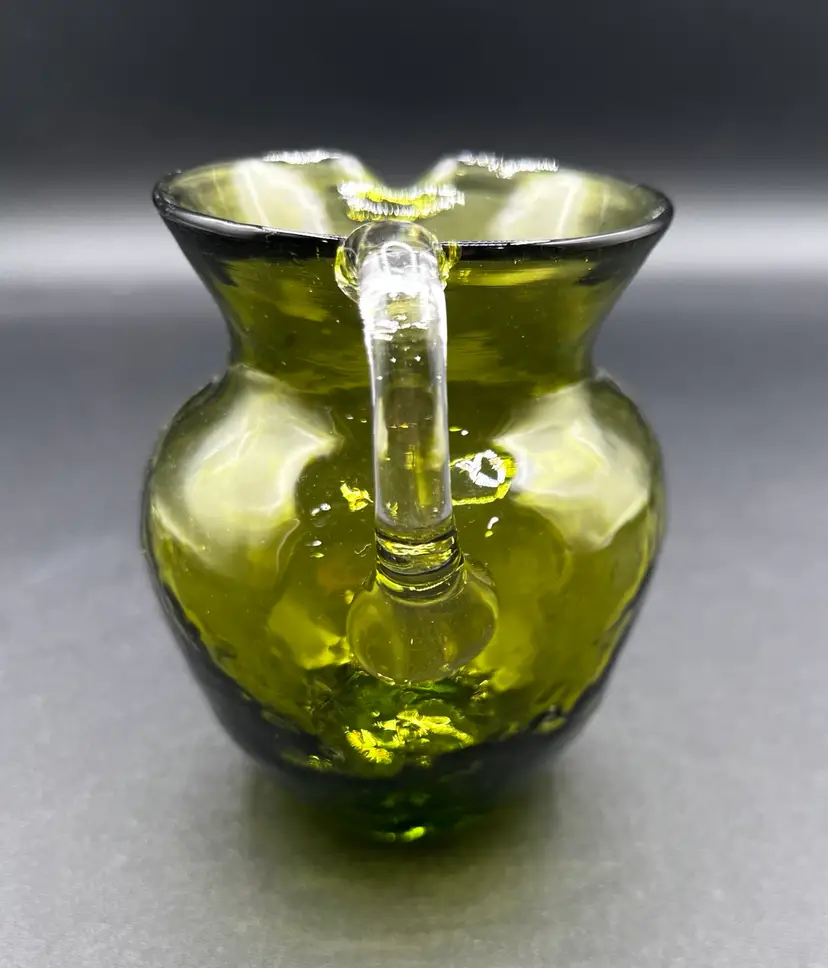 Approx 4”H. Hand blown with pontle scar. Good condition, however there is a chip on the handle.