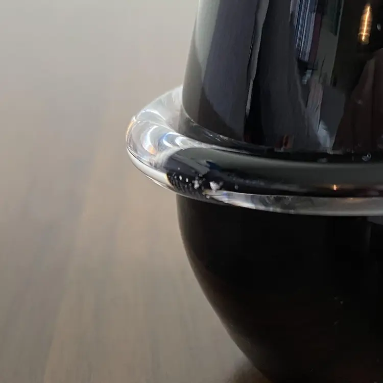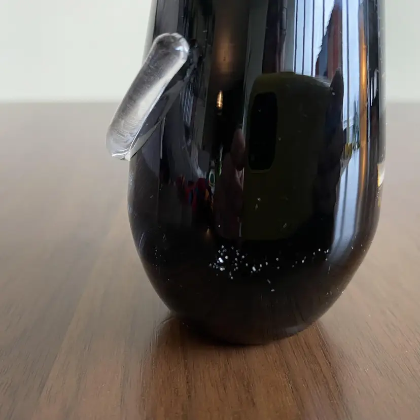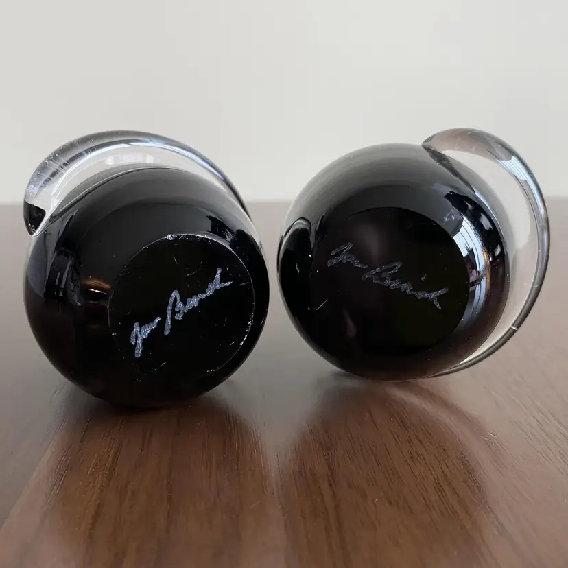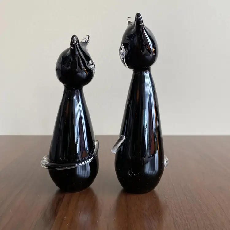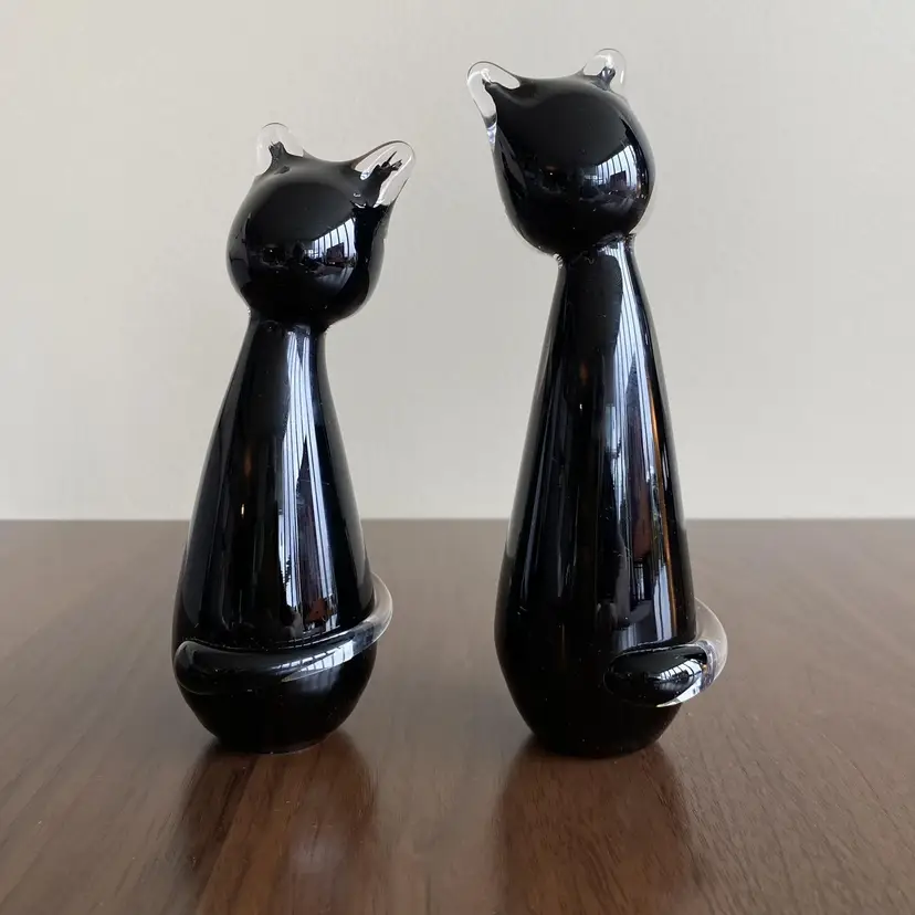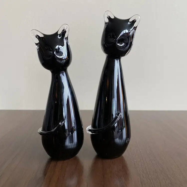 Adorable pair of hand blown black glass cats. Signed on bottom “Jan Benda” of Krystyna Glass Sechelt BC Canada. 7.25 and 6.5 inches tall. About 2.25 inches wide. In very good condition. There are some white dots near base of one- I expect from when made. Tiny flea bites on one area of tail and very base. Vert faint small scratches as expected with age.