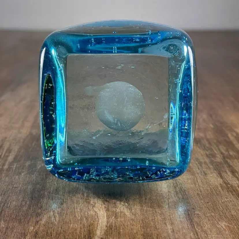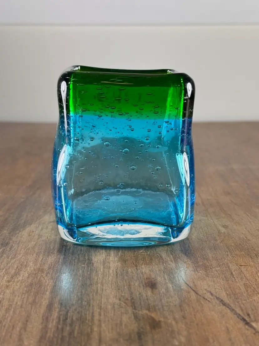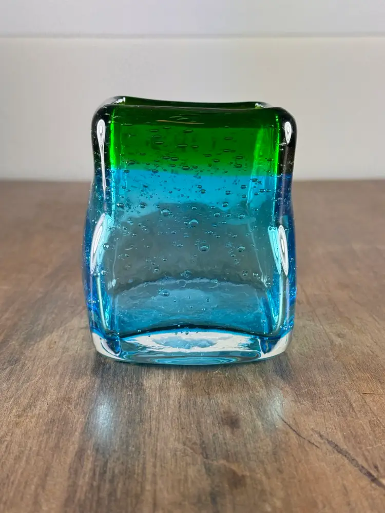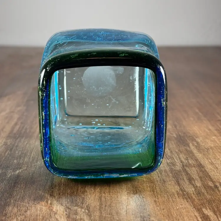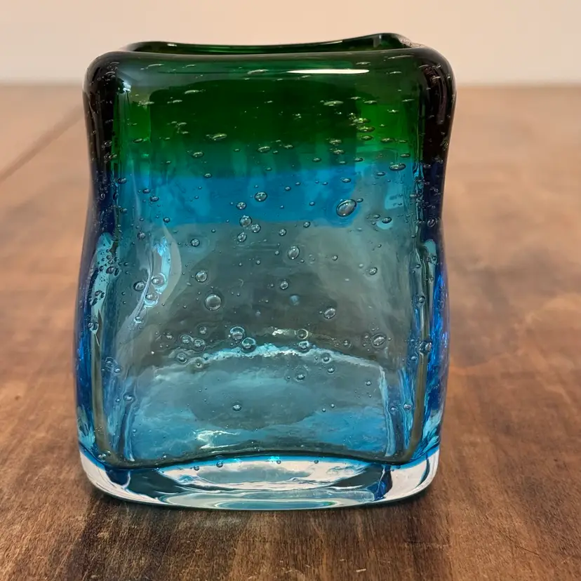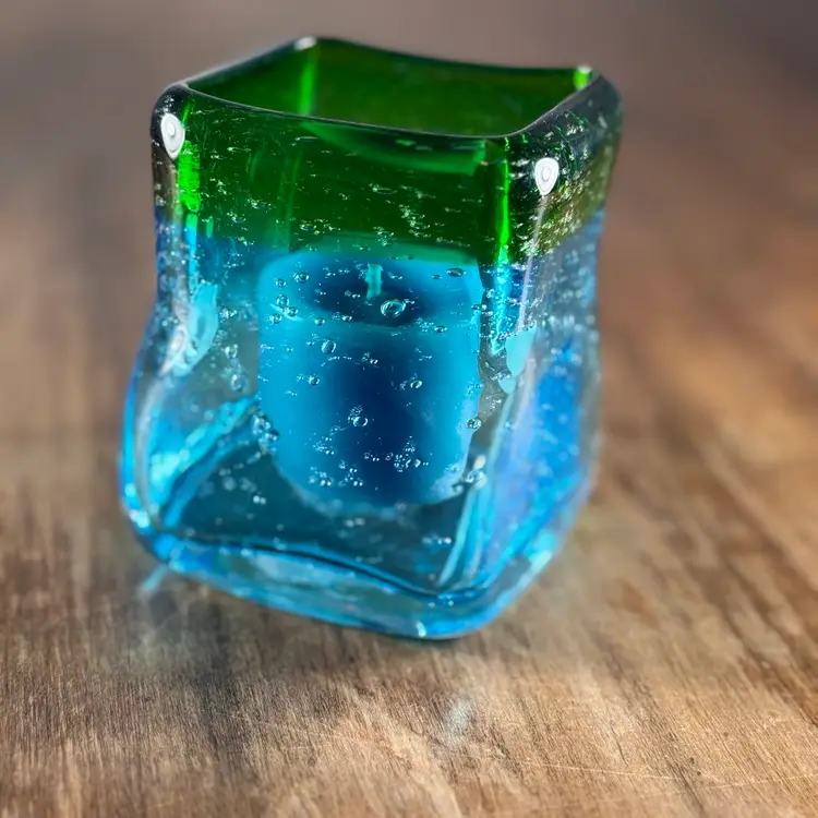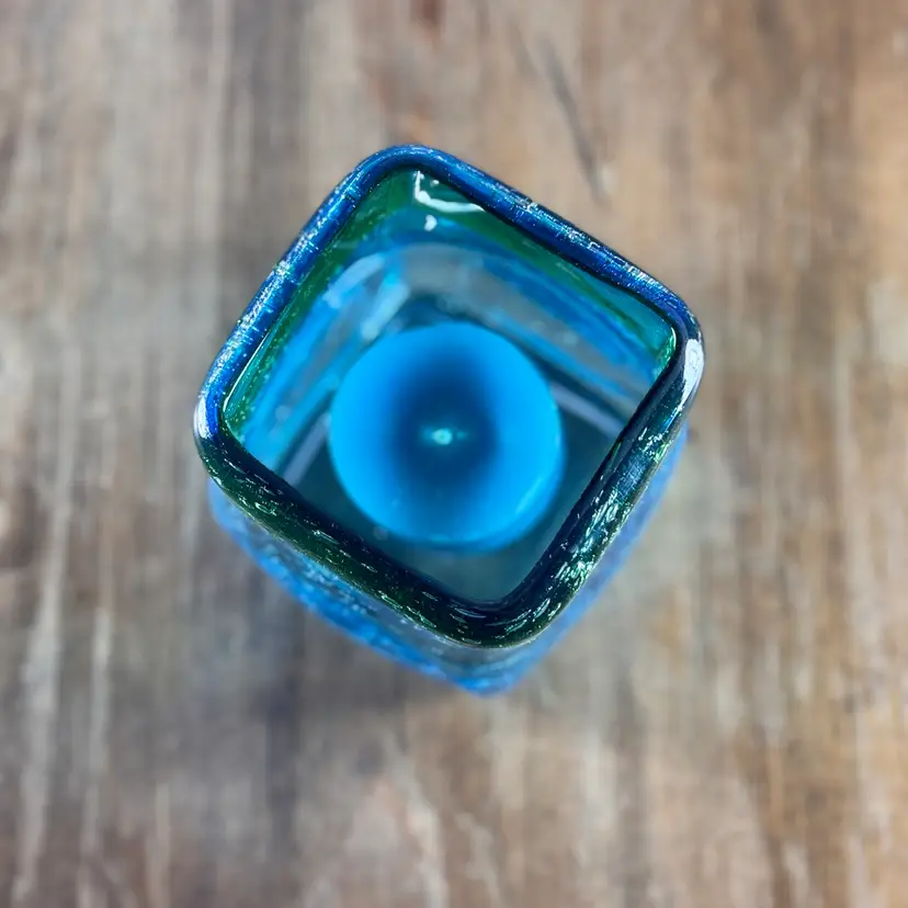 Gorgeous blue and green hand blown art glass candle holder, pencil holder, etc. The bubbled glass adds interest. Measures approximately 3 in.² by 3.5” inches high.